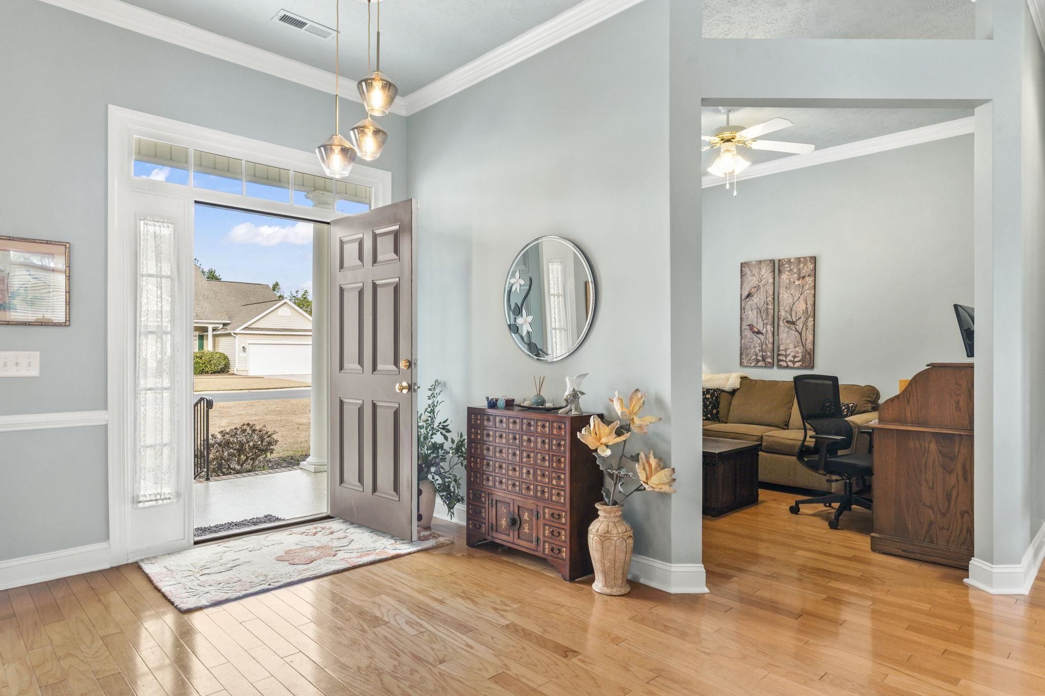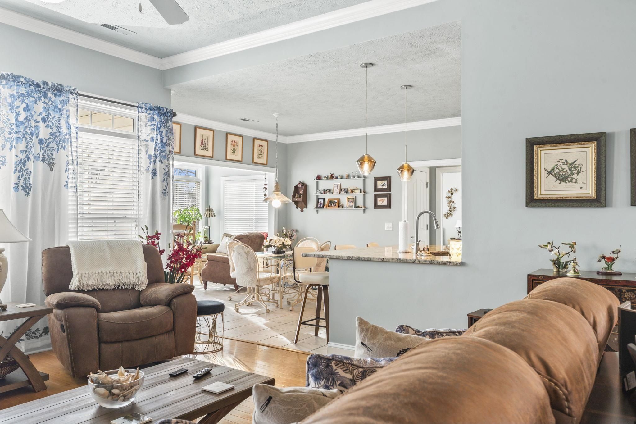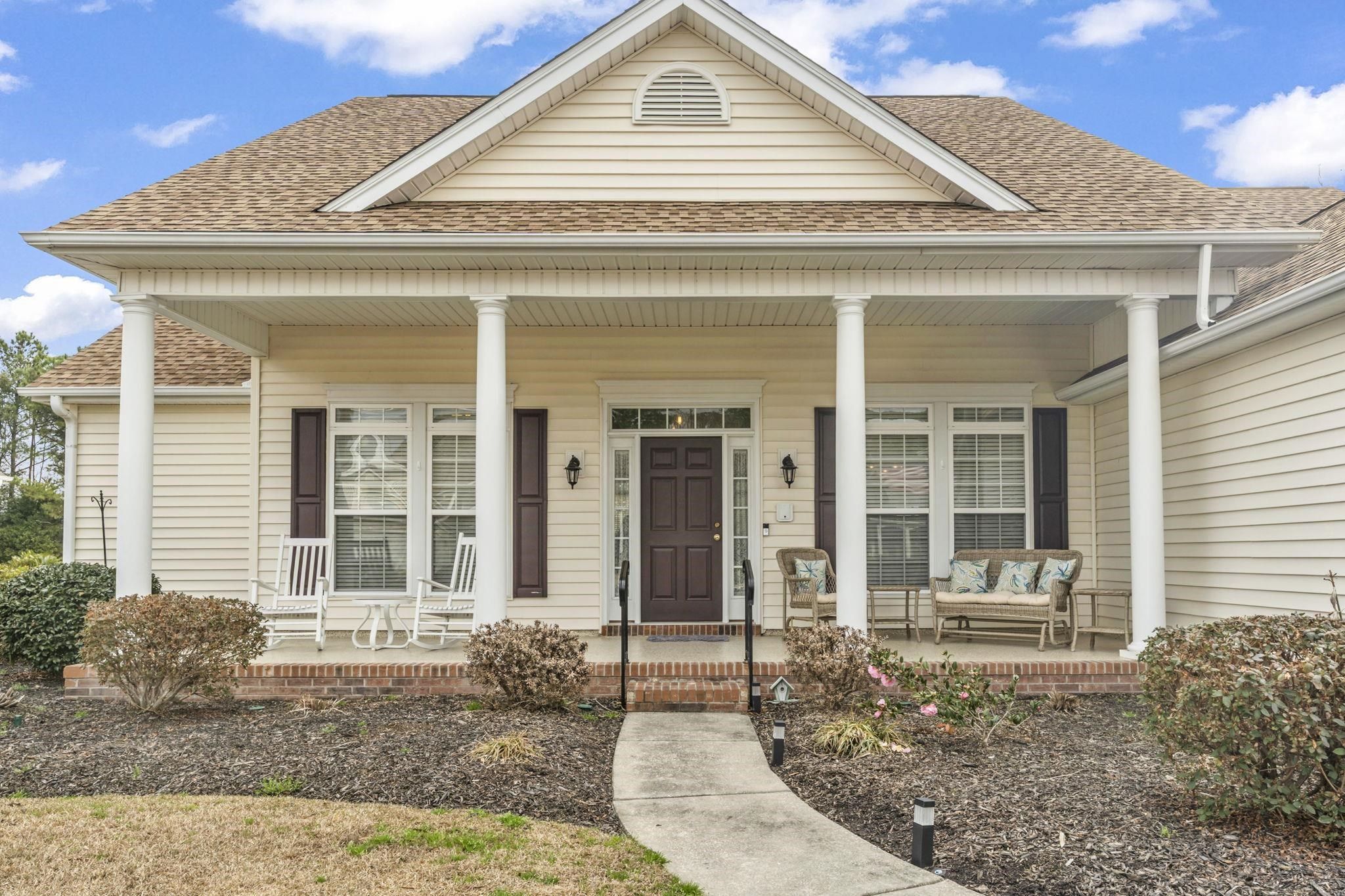 DISCOVER THIS BEAUTIFULY MAINTAINED 3-BEDROOM HOME IN LAUREL BAY AT PRINCE CREEK THAT OFFERS: comfort, function, and lifestyle just minutes from the beach, golf, dining, and nature. Located in one of Murrells Inlet's most desirable communities, the setting feels peaceful and bright, with morning light filling the sunroom and quiet evenings enjoyed on the private patio overlooking a wooded backdrop. Entering from the welcoming front porch, you step into a bright foyer with the formal dining room just ahead and a dedicated living room or study to your left - ideal for a home office, reading space, or quiet retreat. Moving forward, the home opens into the spacious family room with soaring ceilings, creating a warm and comfortable central gathering space. From here, the layout flows naturally into the breakfast area and sunroom, where large windows bring in natural light and offer relaxing views of the private backyard. The kitchen sits at the heart of the home and has been thoughtfully updated with Jasper Blue granite countertops, a full-height backsplash, stainless steel appliances, and ample cabinet and prep space, making it both beautiful and functional. Crown molding has been added to the living spaces and the bathrooms, upgraded lighting and fresh paint enhance the clean, modern feel. Major system updates, including a new roof in 2023, HVAC replaced in 2023, water heater, and lighting improvements, provide added confidence for the next owner. The primary suite is privately positioned and features a stylish tray ceiling, creating a spacious and elegant retreat, with sitting area surrounded by a bay window allowing natural light to fill the room. The ensuite bath includes a double-sink vanity, relaxing garden tub, step-in shower, and a large walk-in closet designed for easy organization. Two additional main-floor bedrooms are located on the opposite side of the home and share a full bath, providing separation and comfort for guests. A functional utility room and access to the two-car garage are conveniently nearby. Outdoor living is just as inviting, with pond views, mature landscaping, and a private patio perfect for relaxing and/or entertaining. The front porch features a professionally coated floor for durability and a clean, finished look. The attached 2 car garage offers additional storage options. Laurel Bay at Prince Creek offers residents a clubhouse, pool, tennis courts, and community events with reasonable HOA fees. The location provides quick access to Huntington Beach State Park, Brookgreen Gardens, top-rated St. James schools, golf courses, shopping, dining, and major routes connecting to Myrtle Beach and the surrounding coast. This home combines thoughtful upgrades, a functional floor plan, and a peaceful setting - an ideal match for buyers seeking comfort, space, and move-in-ready living in Murrells Inlet. Measurements are not guaranteed. Buyer is responsible for verifying.