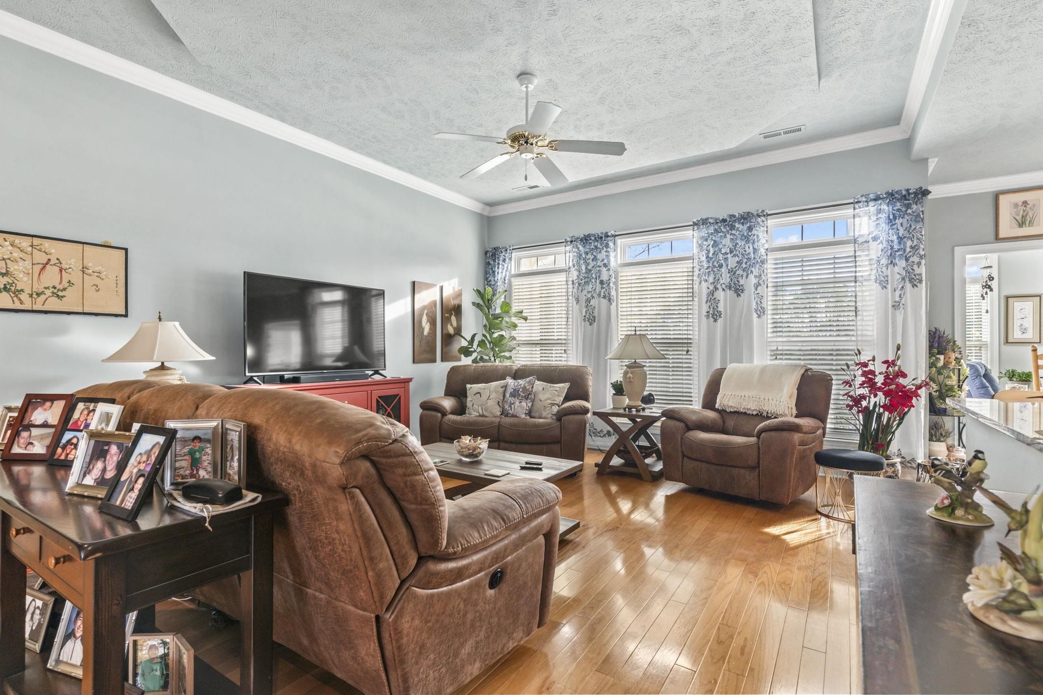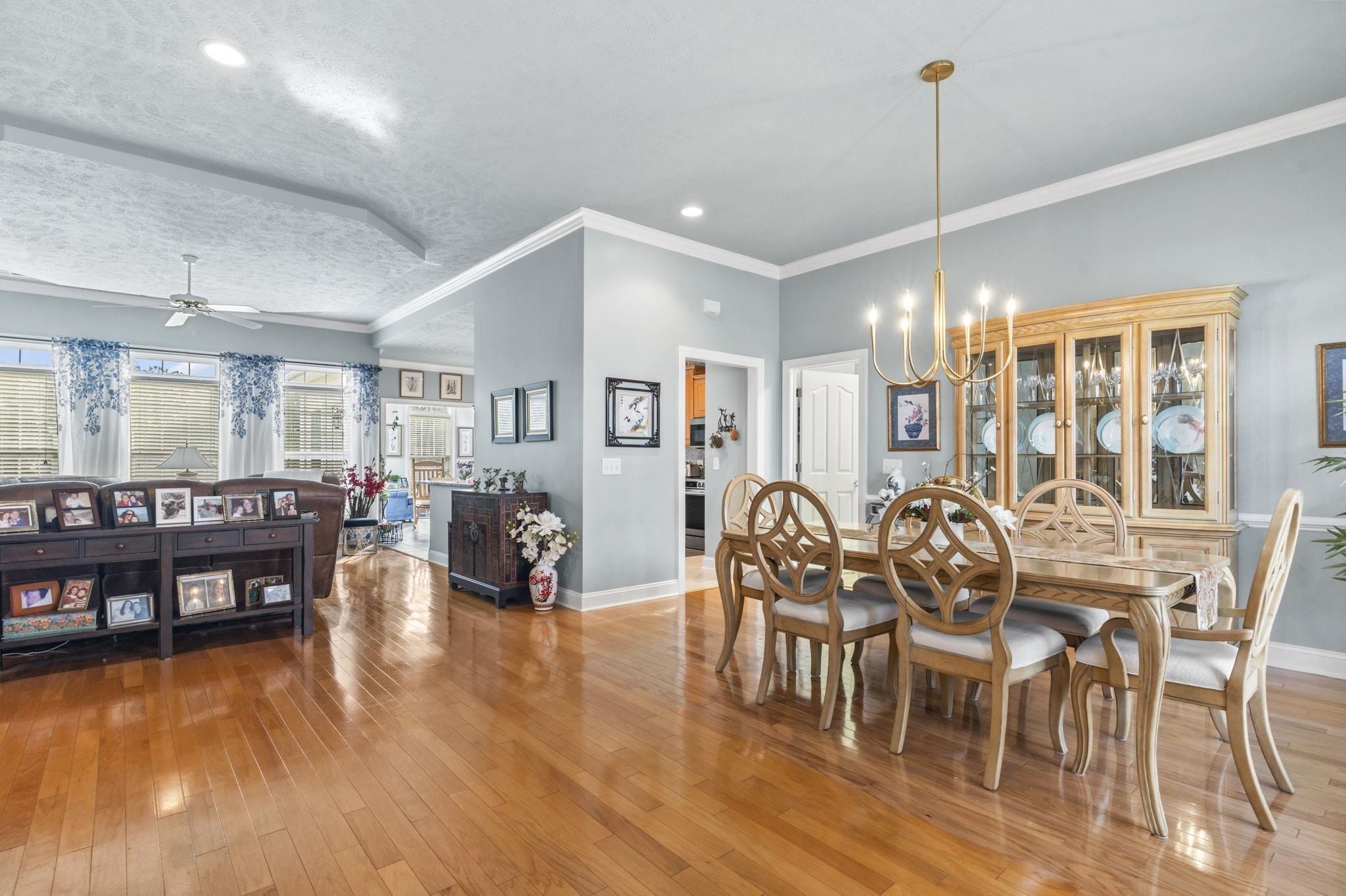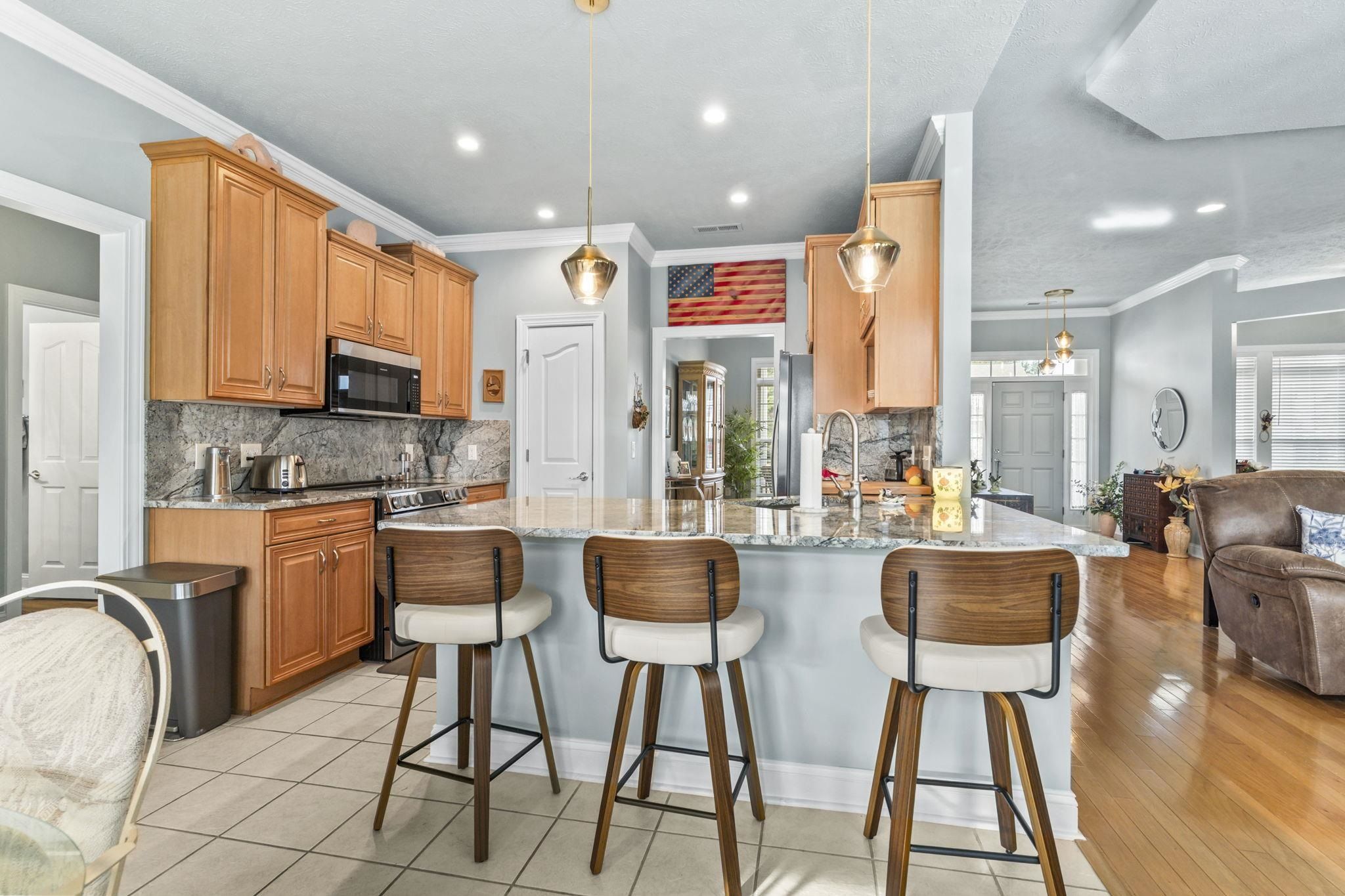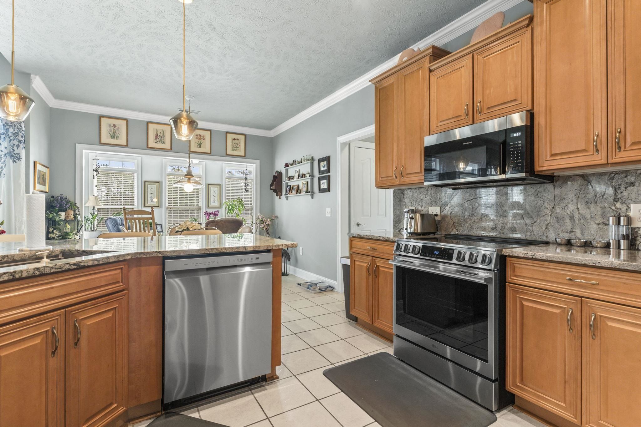 DISCOVER THIS BEAUTIFULY MAINTAINED 3-BEDROOM HOME IN LAUREL BAY AT PRINCE CREEK THAT OFFERS: comfort, function, and lifestyle just minutes from the beach, golf, dining, and nature. Located in one of Murrells Inlet's most desirable communities, the setting feels peaceful and bright, with morning light filling the sunroom and quiet evenings enjoyed on the private patio overlooking a wooded backdrop. Entering from the welcoming front porch, you step into a bright foyer with the formal dining room just ahead and a dedicated living room or study to your left - ideal for a home office, reading space, or quiet retreat. Moving forward, the home opens into the spacious family room with soaring ceilings, creating a warm and comfortable central gathering space. From here, the layout flows naturally into the breakfast area and sunroom, where large windows bring in natural light and offer relaxing views of the private backyard. The kitchen sits at the heart of the home and has been thoughtfully updated with Jasper Blue granite countertops, a full-height backsplash, stainless steel appliances, and ample cabinet and prep space, making it both beautiful and functional. Crown molding has been added to the living spaces and the bathrooms, upgraded lighting and fresh paint enhance the clean, modern feel. Major system updates, including a new roof in 2023, HVAC replaced in 2023, water heater, and lighting improvements, provide added confidence for the next owner. The primary suite is privately positioned and features a stylish tray ceiling, creating a spacious and elegant retreat, with sitting area surrounded by a bay window allowing natural light to fill the room. The ensuite bath includes a double-sink vanity, relaxing garden tub, step-in shower, and a large walk-in closet designed for easy organization. Two additional main-floor bedrooms are located on the opposite side of the home and share a full bath, providing separation and comfort for guests. A functional utility room and access to the two-car garage are conveniently nearby. Outdoor living is just as inviting, with pond views, mature landscaping, and a private patio perfect for relaxing and/or entertaining. The front porch features a professionally coated floor for durability and a clean, finished look. The attached 2 car garage offers additional storage options. Laurel Bay at Prince Creek offers residents a clubhouse, pool, tennis courts, and community events with reasonable HOA fees. The location provides quick access to Huntington Beach State Park, Brookgreen Gardens, top-rated St. James schools, golf courses, shopping, dining, and major routes connecting to Myrtle Beach and the surrounding coast. This home combines thoughtful upgrades, a functional floor plan, and a peaceful setting - an ideal match for buyers seeking comfort, space, and move-in-ready living in Murrells Inlet. Measurements are not guaranteed. Buyer is responsible for verifying.