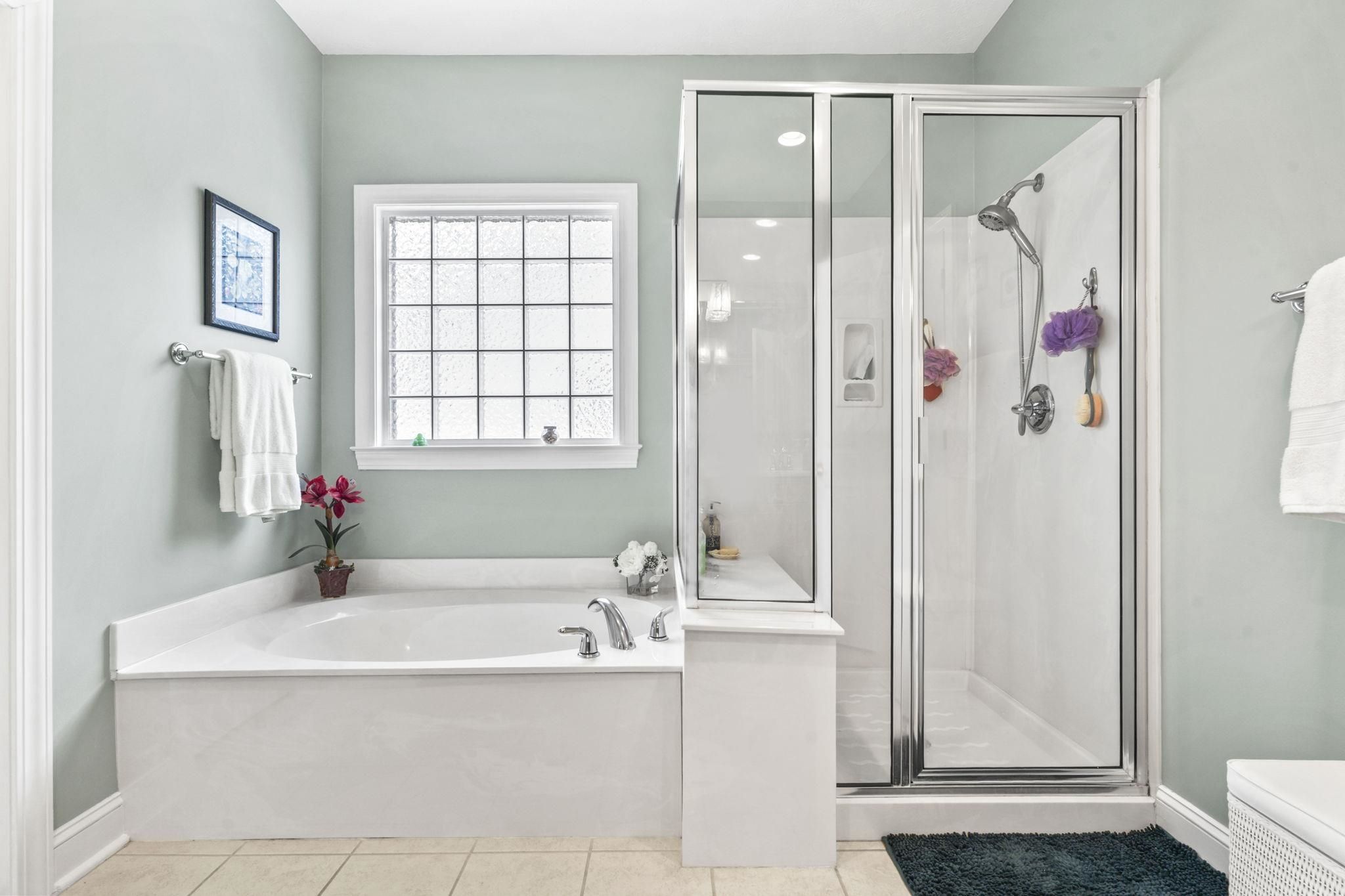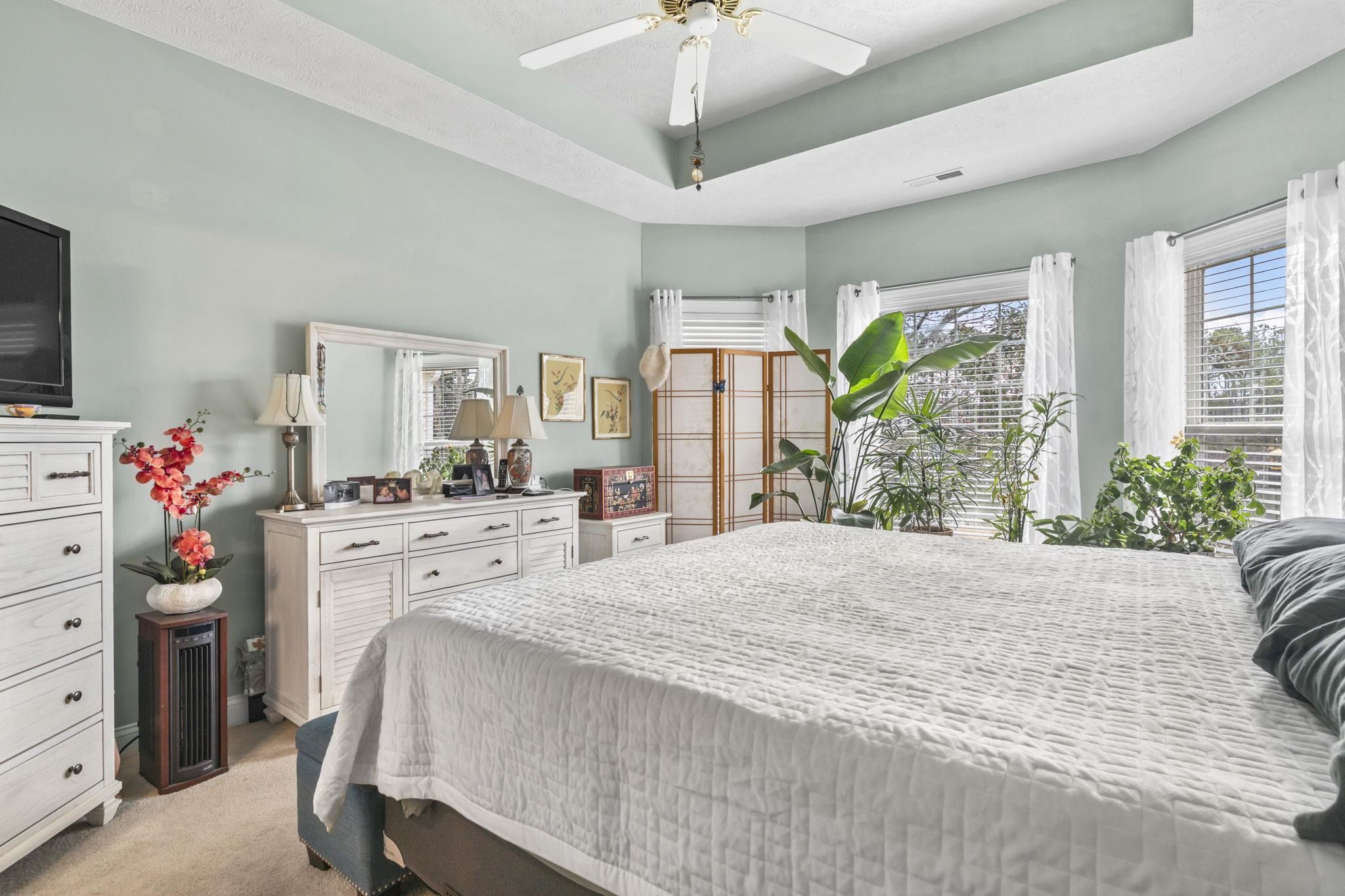 - Tray Ceiling(s), Ceiling Fan(s), Dual Sinks, Garden Tub/Roman Tub, Intercom, Main Level Primary, Sitting Area In Primary Bedroom, Split Bedrooms, Separate Shower, Walk-In Closet(s), Breakfast Bar, Bedroom on Main Level, Breakfast Area, Solid Surface Counters