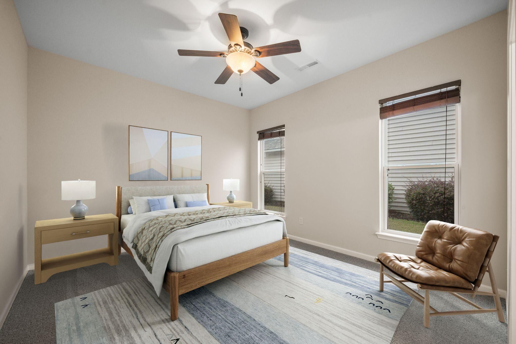 Welcome to resort-style living in this beautifully maintained 3-bedroom, 2.5-bath home, perfectly situated on a desirable corner lot in the sought-after Del Webb community of Cane Bay. From the moment you arrive, the charming front porch and abundance of windows fill the home with natural light, creating an inviting atmosphere. Inside, you're greeted by a dedicated office space, ideal for working from home or a quiet study. The thoughtfully designed kitchen features an island, breakfast bar, fresh white painted cabinets and brand new white granite countertops. For larger gatherings, a separate dining room offers additional space for hosting. Storage is abundant with custom cabinets in the laundry room and a mudroom drop zone, keeping coats, shoes, and everydayessentials organized. The spacious living room is bathed in natural light, complemented by brand new carpet and fresh paint throughout the home. An added sunroom offers the perfect spot to relax with your morning coffee or provide extra room for entertaining. The generous primary suite includes a ceiling fan, walk-in closet, and a spa-like ensuite bath complete with a soaking tub and separate shower. Two additional bedrooms share a convenient Jack-and-Jill bathroom, ideal for guests or family. Del Webb at Cane Bay is a gated, golf cart-friendly community offering world-class amenities including resort-style pools, tennis courts, a fitness center, miles of walking and jogging trails, and a vibrant calendar of community events all just minutes from shopping, dining, and everyday conveniences. Don't miss your chance to enjoy the best of Lowcountry living in one of the area's premier active adult communities!