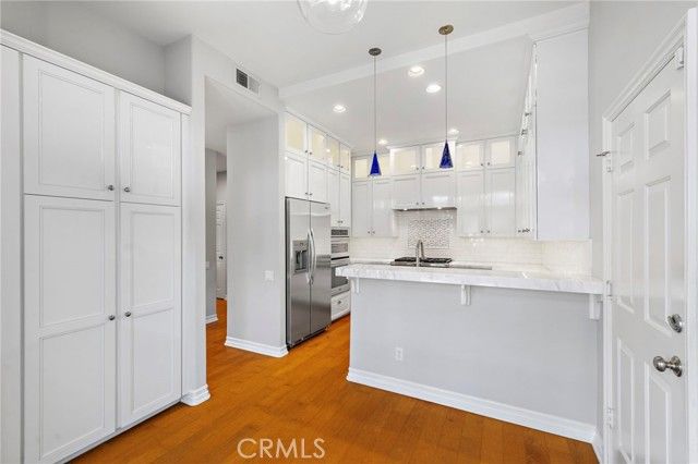 Charming coastal cottage in the heart of Corona del Mar, located within the highly desirable 55+ Terraces community. This beautifully upgraded residence offers the perfect blend of privacy, elegance, and walkable beachside living. A private courtyard entry with lush landscaping leads to a dutch-door front entry and an inviting open-concept interior with soaring 10-foot ceilings and walls of windows framing garden views. The remodeled kitchen features Carrera marble countertops, high-gloss white cabinetry, stainless steel appliances, farmhouse sink, and an oversized center island - ideal for both everyday living and entertaining. Hardwood floors flow throughout the great room, dining area, and kitchen creating a warm and timeless coastal aesthetic. The spacious primary suite opens to a private outdoor terrace and showcases a spa-inspired bath with travertine finishes, designer fixtures, walk-in shower, soaking tub and custom closet. The secondary bedroom offers custom built-ins and walk-in closet, while guest bath has been thoughtfully remodeled with ceramic tile, freestanding cottage-style sink and Carrera marble accents. Additional highlights include a dedicated laundry room with sink, multiple outdoor patios, and a two car attached garage with extensive built-in storage and EV charger. Residents of the Terraces enjoy resort-style amenities including sparkling pool, spa, and clubhouse, all within a beautifully maintained community just moments from world-class beaches, charming village shops and fine dining, with immediate access to the Oasis Senior Center's fitness, wellness, and social amenities. A rare opportunity in one of Corona Del Mar's most desirable coastal communities.