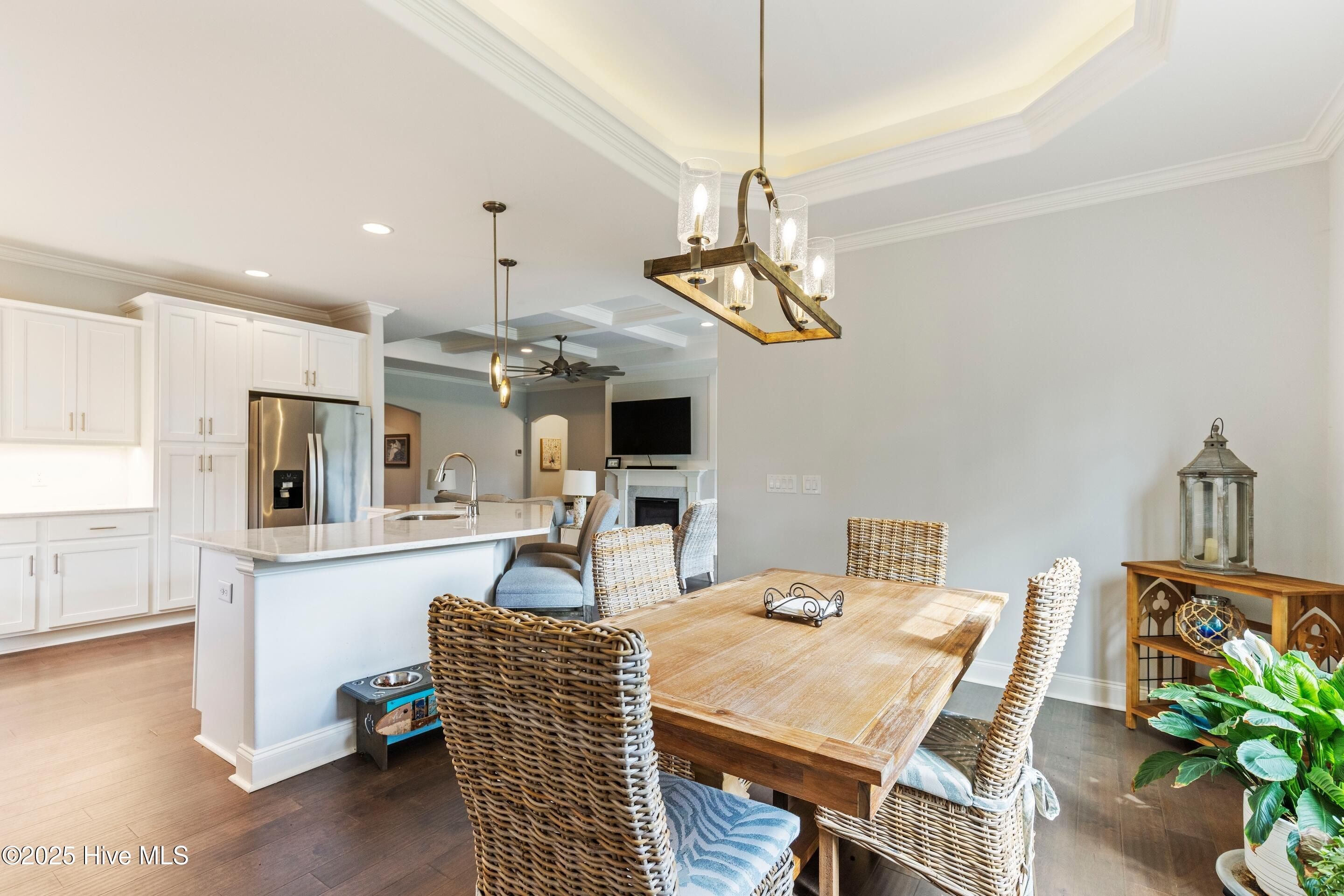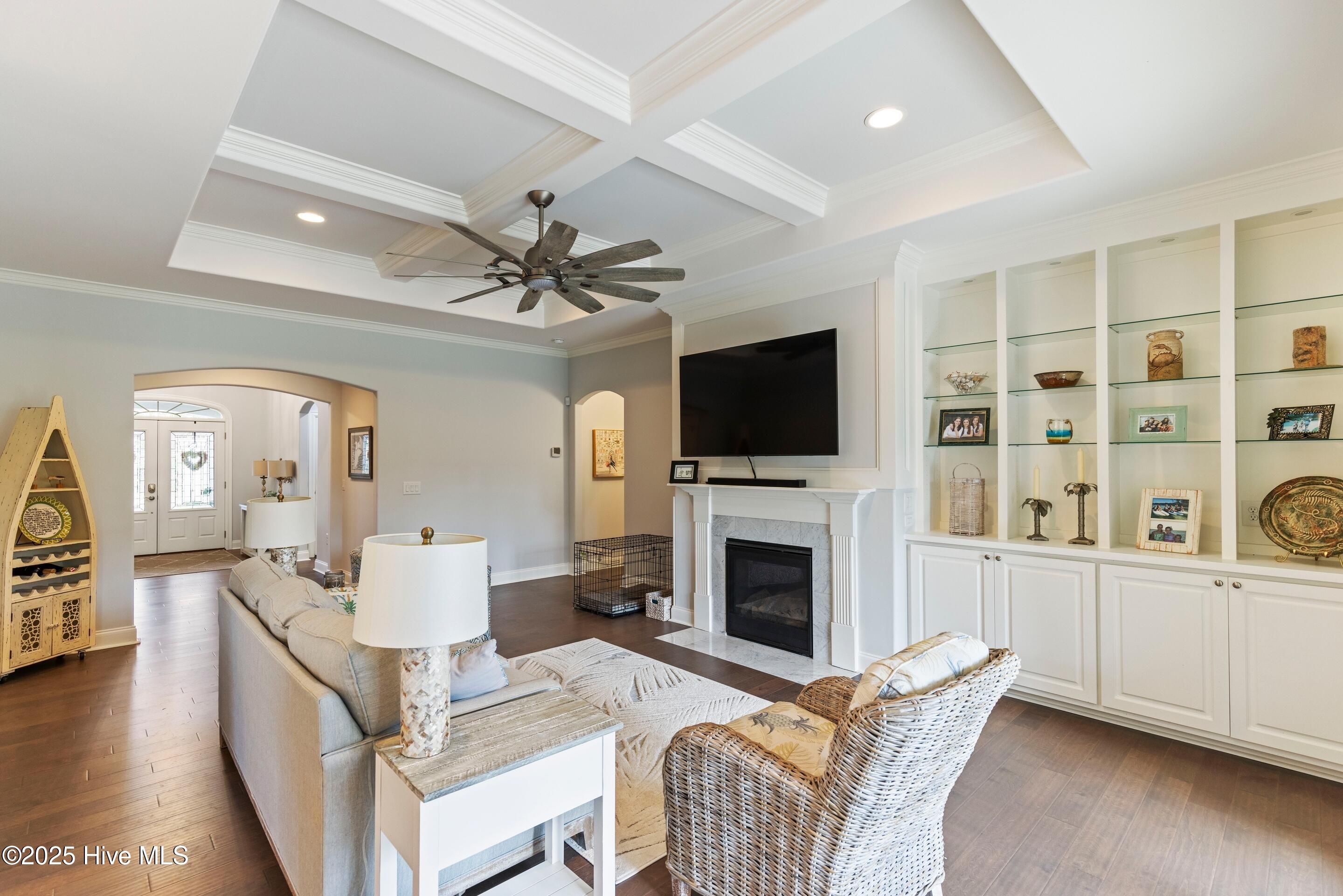 River Bluffs is an amenity rich exclusive gated community conveniently situated near downtown Wilmington, beaches, and shopping districts. Entrance to the community is staffed during daylight hours. The 'Beach Boca 2' residence features an all-brick construction with a split-bedroom layout, comprising three bedrooms, three tiled bathrooms, an additional bonus room/bedroom upstairs, and a two-car garage. Upon entry, the vaulted ceiling foyer permits ample natural light, and the hardwood flooring creates a welcoming ambiance.The great room is appointed with crown molding, a coffered ceiling, a gas fireplace, built-in bookshelves, and cabinetry. The kitchen features quartz countertops, island seating, generous dining space, stainless steel appliances, a gas cooktop, and soft-close cabinets. The sophisticated owner's suite includes dual walk-in closets, heavy crown molding, tray ceiling, ceiling fans, and a door leading to the lanai. The ensuite bathroom features quartz countertops, a spacious tiled walk-in shower, and an additional linen closet.From the great room, telescoping sliding glass doors provide access to the lanai, where residents can enjoy the screened lanai, grilling patio, fenced yard, and mature landscaping. The second level offers a bonus room/fourth bedroom that serves as either a bedroom or flex space, accompanied by a full tiled bathroom. The attic is easily accessible and partially floored for added storage. The two-car garage has finished walls and epoxied flooring for easy maintenance.River Bluffs is a vibrant community where homeowners can participate in any of the 35+ clubs available. Community amenities include a marina, RV/boat storage, restaurant, boardwalk, pickleball and tennis courts, walking trails, dog park, swimming pools, horseshoe pits, disc golf, outdoor fireplace, fitness centers, yard maintenance services, post office, valet trash collection, kayak storage, and boat launch facilities.