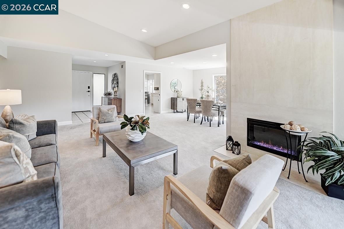 Discover elevated living in this desirable Cascade model, featuring a spacious great room–style living and dining area that opens to a wraparound deck with sweeping views of Rossmoor’s Dollar Ranch golf course, rolling hills, and serene valley. Vaulted ceilings in both the living area and eat-in kitchen create a light, airy ambiance, enhanced by recessed lighting and updated flooring throughout. The inviting living room features a beautiful stone fireplace with an electric insert. The updated kitchen offers quartz countertops, newer custom cabinetry, stainless steel appliances, and a double-drawer dishwasher with ample storage. Both bathrooms are stylishly remodeled with new vanities, custom stone, and designer tile. A separate laundry area includes full-size washer and dryer with added cabinetry. Complete with a detached garage and nearby parking, this home blends comfort, style, and convenience.