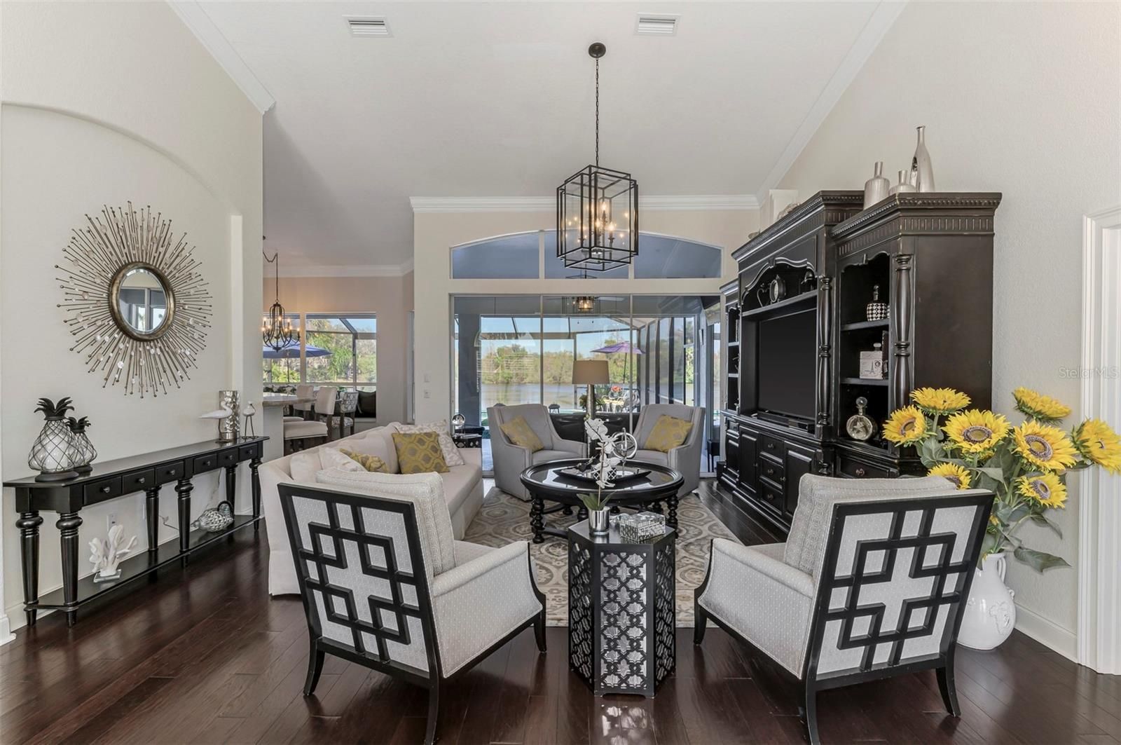 Indulge in a lifestyle where the beauty of nature meets the simplicity of living in the delightful community of Riverwood. A impeccably maintained custom Yorktowne estate home in the desired Eagle Trace neighborhood. This well appointed home features stunning hardwood floors throughout the living area into the bedrooms. The formal dining area, enhanced with a most elegant chandelier is ideal for special gatherings while the updated eat in kitchen with wood cabinets, granite counter tops & stainless steel appliances provide for a clutter-free space for casual dining and entertaining. The third bedroom currently used as a media room offers versatility with pocketdoor access into the kitchen area. The sliding glass doors will lead you to the spacious lanai with an inviting pool for year round fun and relaxation. Take in the beautiful water and preserve views from the gorgeous "Cinema" picture screen enclosure . The primary suite, with access to the lanai, includes a walk-in closet, tub and separate shower. A split floor plan provides privacy for you and your guests. Added features include; NEW ROOF (2021), NEW POOL CAGE (2023), HVAC (2021), Hurricane Shutters, crown molding, plantation shutters and modern light fixtures. This is Florida Living at its Best! Don't let this extraordinary opportunity slip away! GOLF CLUB NAMED *TOP 50 US COURSES* *GOLF ADVISOR* *2018*, ACTIVITY CENTER CAMPUS INCLUDES LAP & RESORT STYLE POOL, FITNESS CENTER, PICKLE-BALL COURTS, SMALL AND LARGE DOG PARKS, TENNIS COURTS, LAWN CROQUET, BOCCE COURTS, CRAFT ROOM, LIBRARY AND SOCIAL ACTIVITIES! Additional fees apply for Riverwood Golf Club & Private Beach Club on Manasota Key. Riverwood is Close to Tampa Bay Rays Spring Training Facility, Atlanta Braves Spring Training Facility, Gulf Beaches, Carlotte Harbor, Myakka River, Punta Gorda, Englewood and Boca Grande. Riverwood, a Perfect Blend of Florida's Nature and Resort Lifestyle.