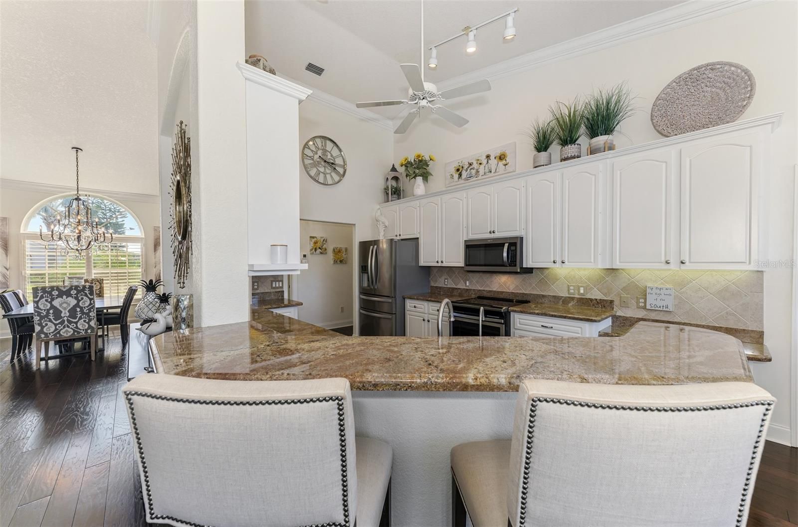 - Cathedral Ceiling(s), Ceiling Fan(s), Central Vacuum, Crown Molding, Eat-in Kitchen, High Ceilings, Kitchen/Family Room Combo, Main Level Primary, Split Bedrooms, Stone Counters, Tray Ceiling(s), Walk-In Closet(s), Window Treatments