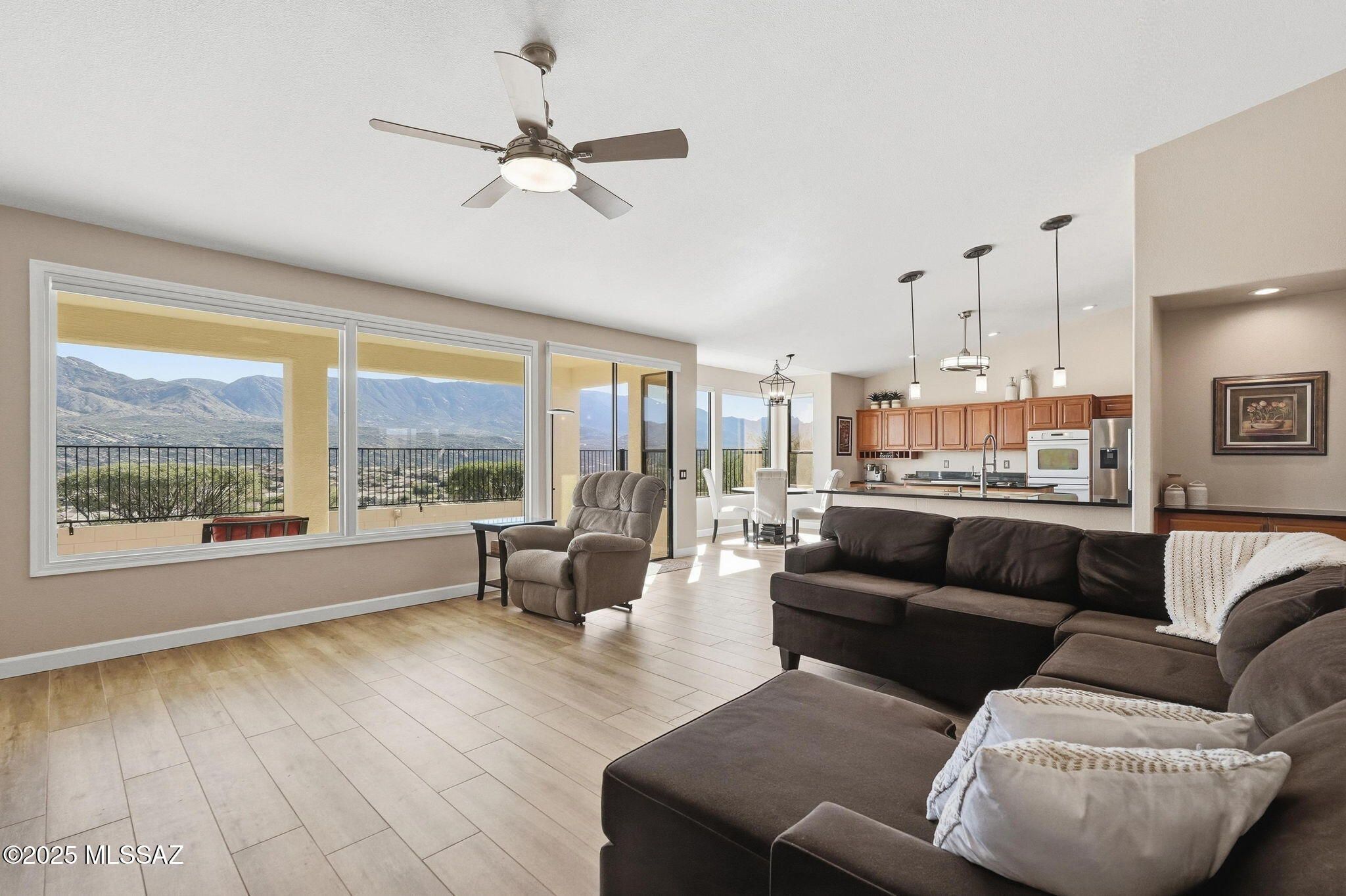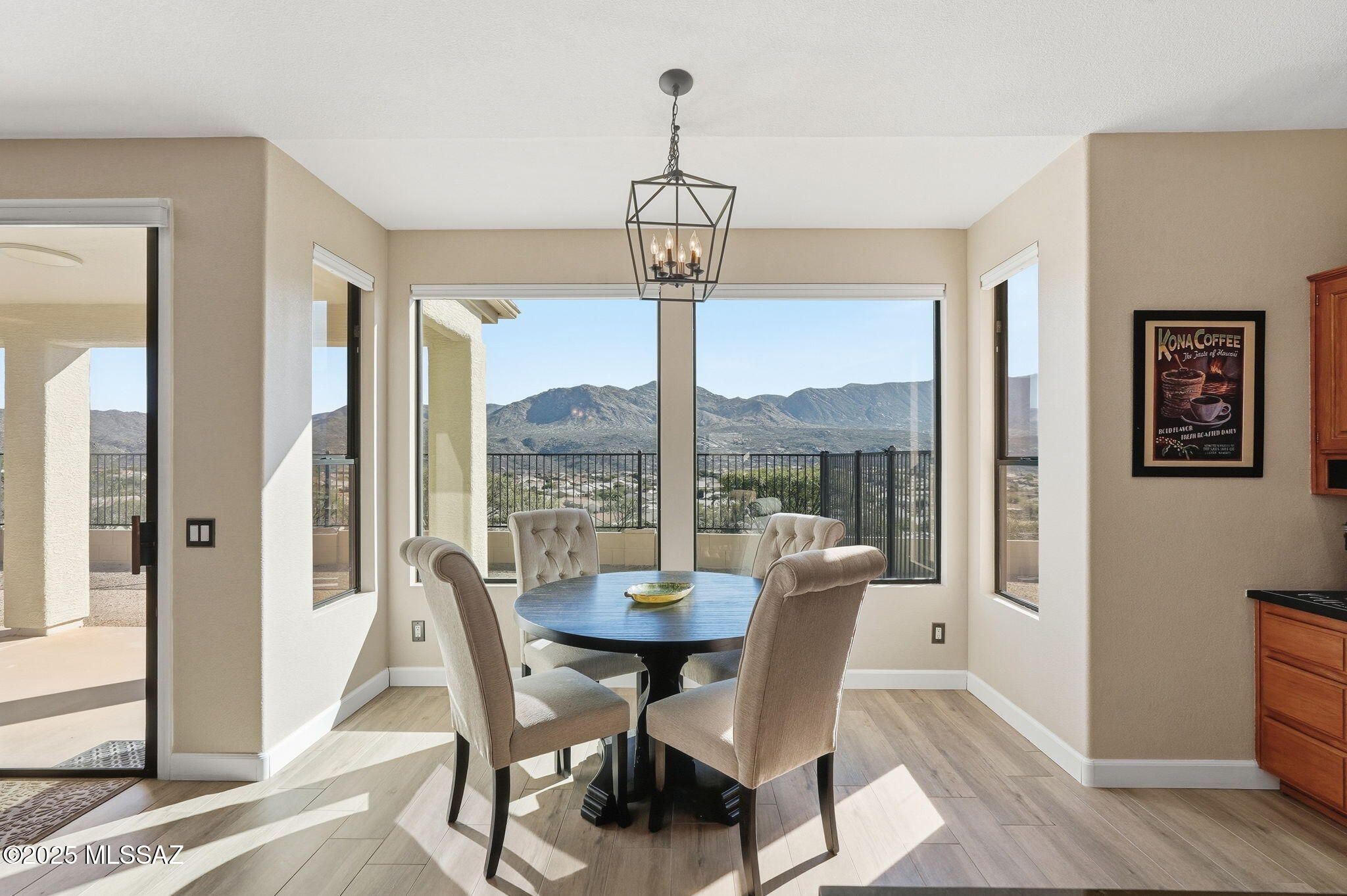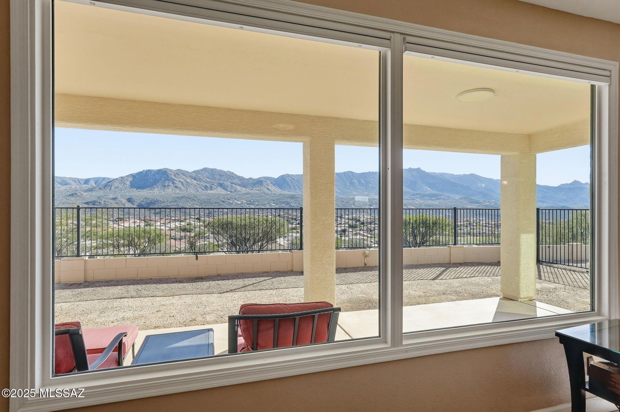 Breathtaking Catalina mountain views from this private, elevated lot, enjoyed from inside and out. 1-story Galleria with beautiful plank tile flooring throughout, wood flooring in the office. Kitchen and great room are filled with mountain views. Primary suite features sitting area, sliders to patio, dual closets, tub, shower & dual vanity. Living room with gas fireplace & desert views. Dining room is filled with light overlooking lush greenery. Office includes French pocket doors & built-in cabinetry. Thoughtfully fenced w/wrought iron and snake fencing, the backyard preserves access to surrounding wildlife. Added highlights: updated window coverings, fans and lighting, large laundry room, and 3-car garage with sink & storage. Enjoy the SaddleBrooke lifestyle!