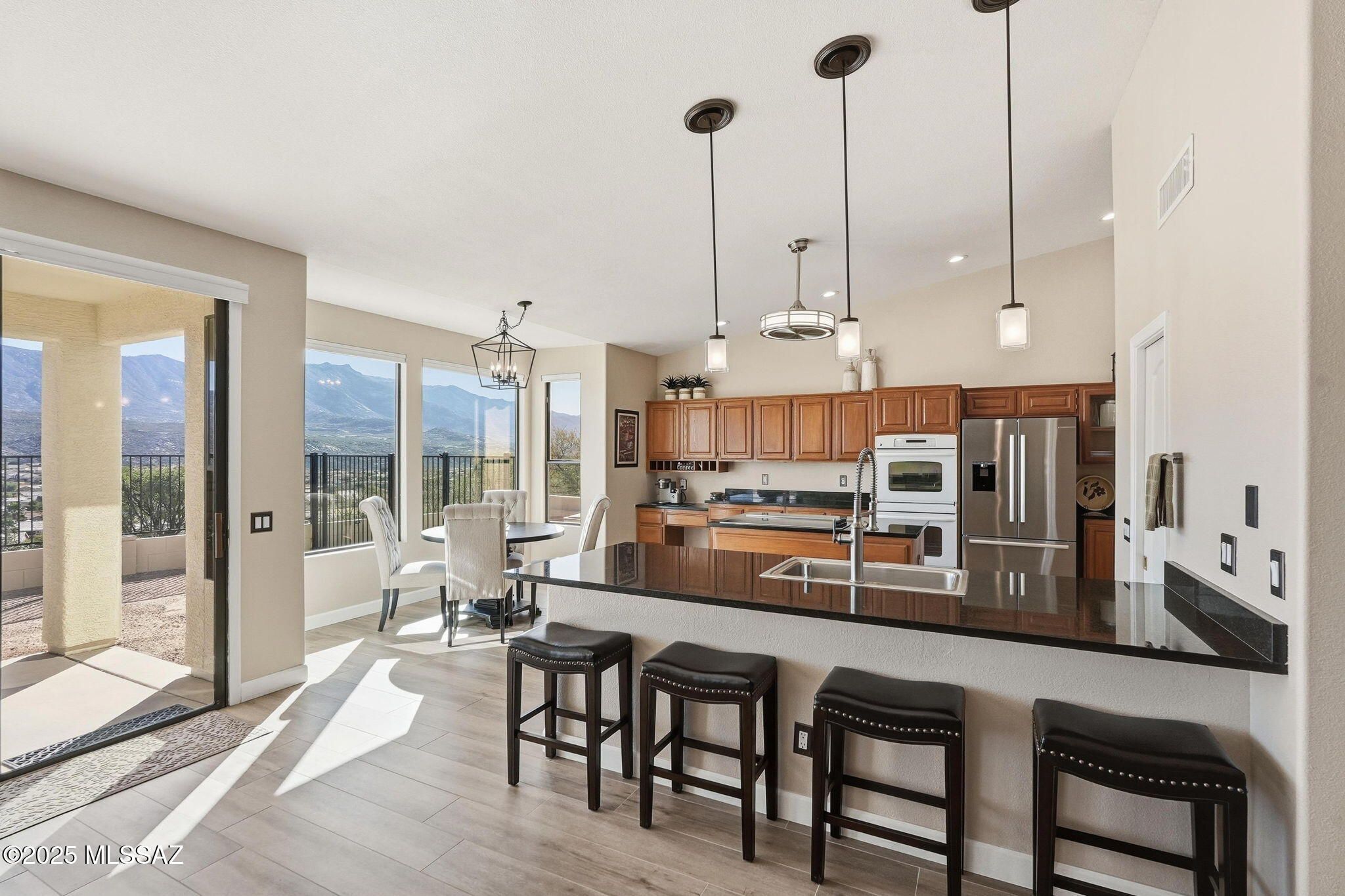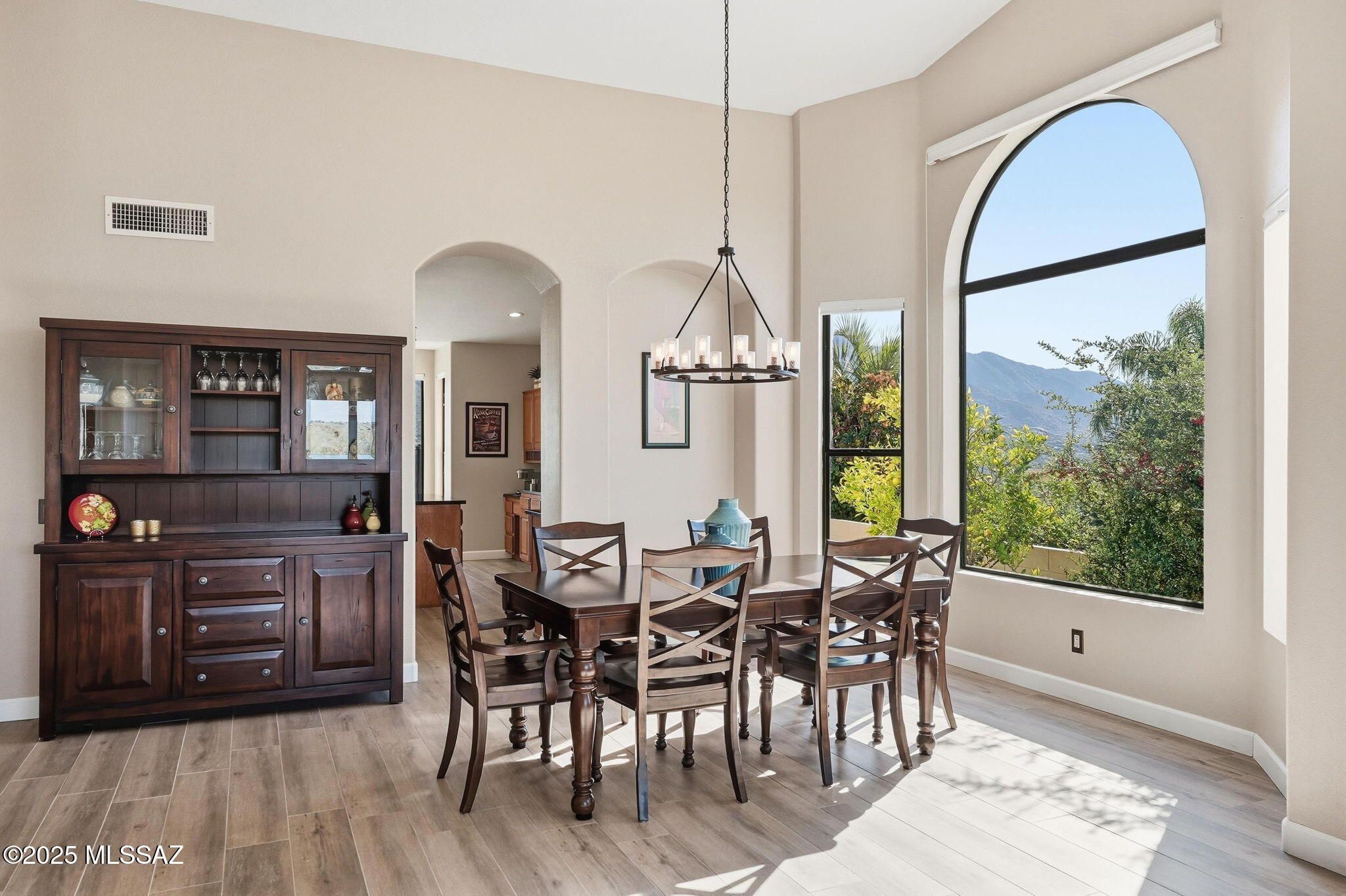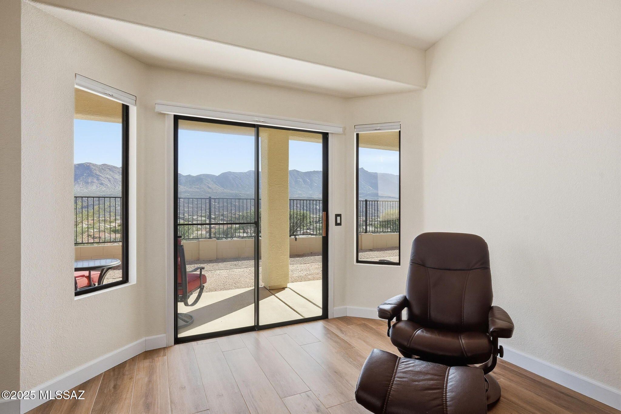 Breathtaking Catalina mountain views from this private, elevated lot, enjoyed from inside and out. 1-story Galleria with beautiful plank tile flooring throughout, wood flooring in the office. Kitchen and great room are filled with mountain views. Primary suite features sitting area, sliders to patio, dual closets, tub, shower & dual vanity. Living room with gas fireplace & desert views. Dining room is filled with light overlooking lush greenery. Office includes French pocket doors & built-in cabinetry. Thoughtfully fenced w/wrought iron and snake fencing, the backyard preserves access to surrounding wildlife. Added highlights: updated window coverings, fans and lighting, large laundry room, and 3-car garage with sink & storage. Enjoy the SaddleBrooke lifestyle!