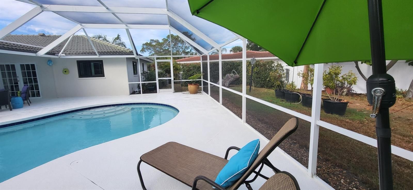 Must see this special home! You'll want to move in immediately! Clean, neat, meticulously maintained home in desirable South Gate area under $600,000. Freshly painted exterior August 2025 with new exterior light fixtures. Barrel tile roof maintenance in 2024, new flat roof over lanai, valleys redone, all roof penetration reflashed, attic solar fan installed. New AC in 2020 with whole house duct cleaning and ultraviolet light installed for mold control, extra insulation added in attic at the same time. New hurricane impact/energy efficient windows installed 2023 with lifetime warranty that is transferable. Hurricane garage door with Lift Master remote. Relax and breathe easy in the security of this block home. Water heater 2yrs. old. New electrical panel 2015. Plenty of room to entertain friends and family on large 1600ft lanai area with extra large pool that looks like a lagoon of beautiful blue water. Pool cage screens replaced 2019, pool motor replaced 2022 and upgraded to variable speed motor. Pool and lanai decking resurfaced 2023. A piece of paradise as your backyard oasis is landscaped for privacy. Huge hass avocado tree grown from seed on side of house with banana trees, and pineapple plants in front that are the sweetest. Wood plantation shutters at all windows. Updated master bath, new tile in kitchen. Herringbone patterned floor tile. Updated ceiling fans add to great atmosphere. Inside laundry room, don't have to go into garage. Can't find a home in Sarasota in this excellent shape at this price.
