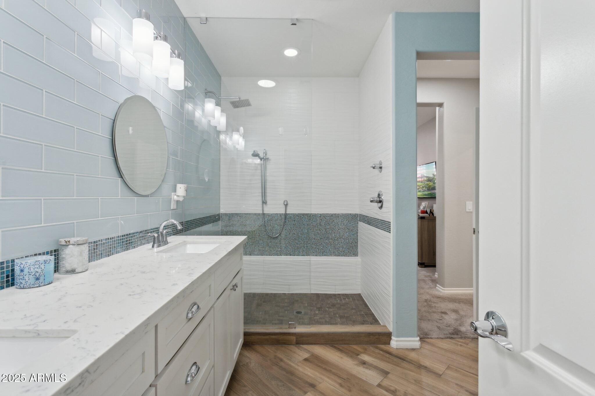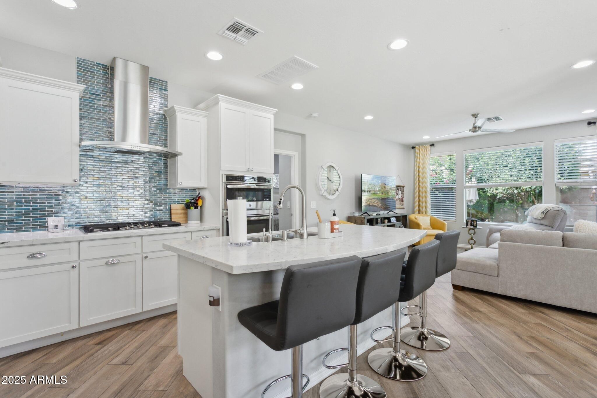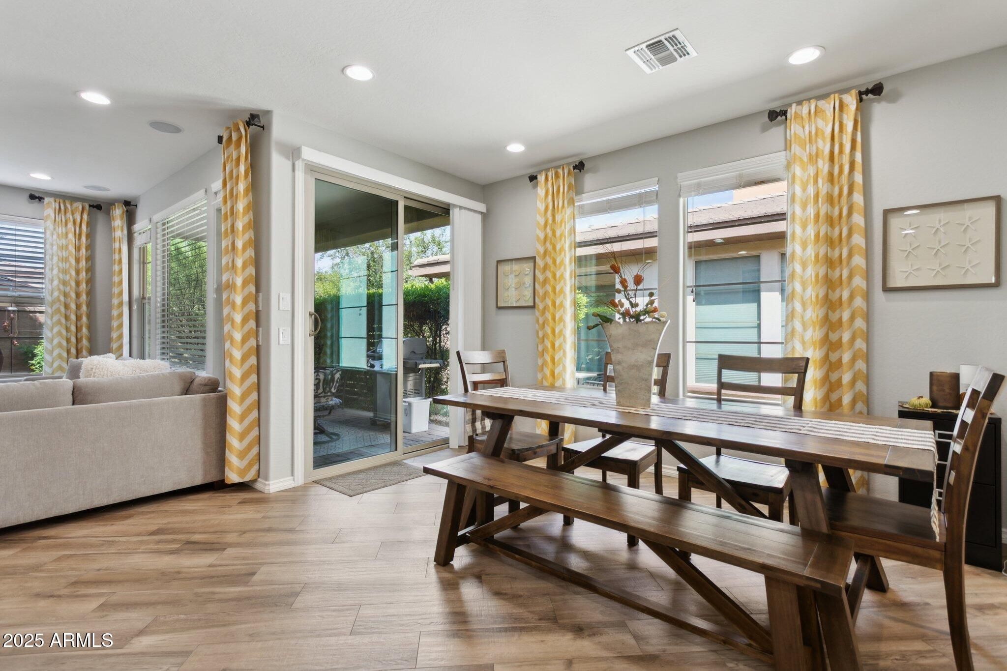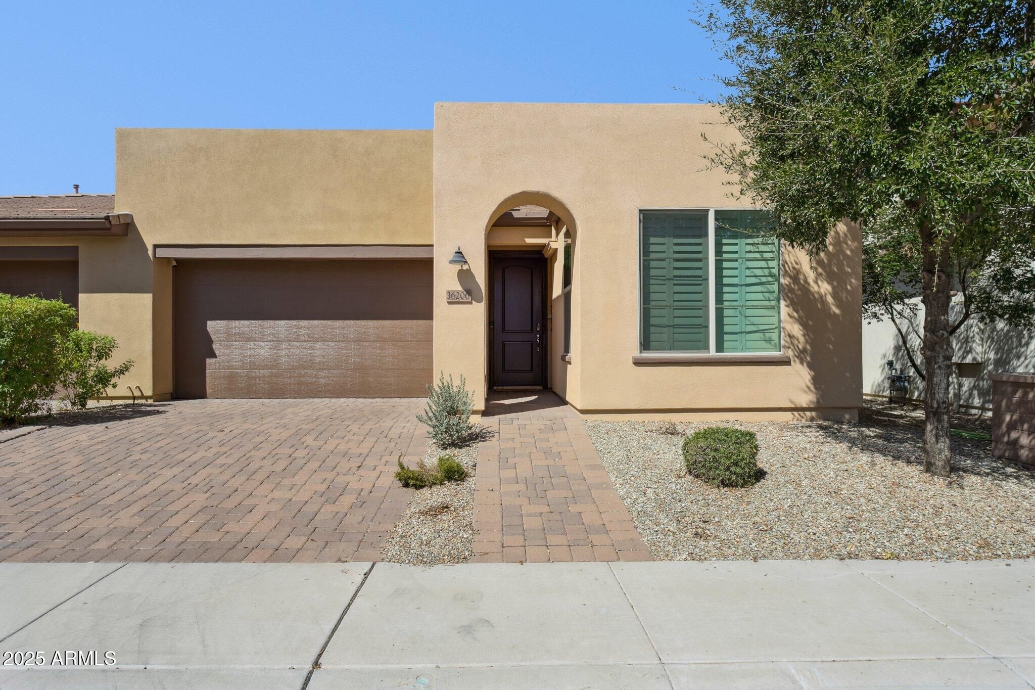Charming townhome nestled in the prestigious Trilogy resort community of Encanterra. Exquisitely designed Muros floor plan offers 1,342 sq. ft. with 2 bedrooms and 2 baths. From the moment you enter, you will be captivated by the light and bright atmosphere, accented with plantation shutters and warm neutral tones. The décor creates a casually elegant feel, while diagonally laid wood-look tile plank flooring adds texture and sophistication throughout. The heart of the home is the gourmet kitchen, flowing seamlessly into the den/office and living area for true, open-concept living. Highlights include white shaker cabinets with crown molding and LED accent lighting, stainless steel GE Profile appliances, quartz countertops... in-island sink with reverse-osmosis faucet, and a mosaic tile backsplash. The spacious primary suite is a retreat with a bathroom featuring quartz dual-sink vanity and a floor-to-ceiling tiled European shower with rain shower head. The guest bedroom, located near the entry, features plantation shutters, generous closet space, and easy access to the second full bath. This turn-key home is in close proximity to the main clubhouse, La Casa, and the Algarve adults-only pool, giving you access to all the resort-style amenities Encanterra has to offer.