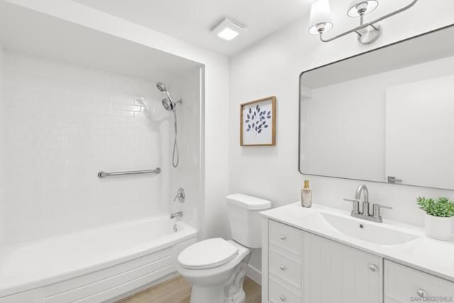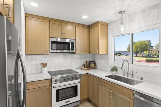 Beautifully remodeled 3 bed, 2 bath home with owned solar in the highly sought-after 55+ Oceana Community in Oceanside. The bright, open layout features a chef’s kitchen with quartz countertops, a designer tile backsplash, and stainless-steel appliances, creating a clean and modern feel throughout. The spacious primary suite offers a peaceful retreat, while the secondary bedroom functions like a second primary with direct bath access—ideal for guests. Both bedrooms open to a private courtyard, enhancing indoor-outdoor living. A third bedroom provides flexible space for a home office or gym. An enclosed sunroom adds approximately 100 sq ft of bonus space (not included in square footage). Additional highlights include an attached two-car garage and an oversized private driveway. Located just a short walk to the clubhouse and resort-style amenities including a pool, spa, pickleball, billiards, and RV parking—offering the best of active adult living.