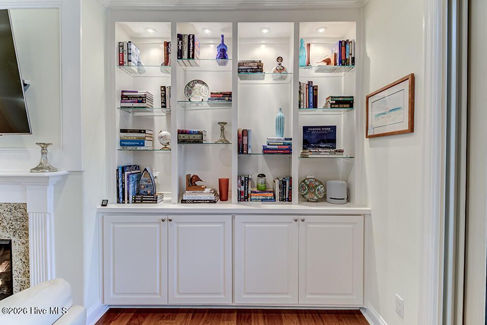 - Sound System, Master Downstairs, Walk-In Closet(s), Tray Ceiling(s), High Ceilings, Entrance Foyer, Generator, Bookcases, Kitchen Island, Ceiling Fan(s), Walk-In Shower, Blinds