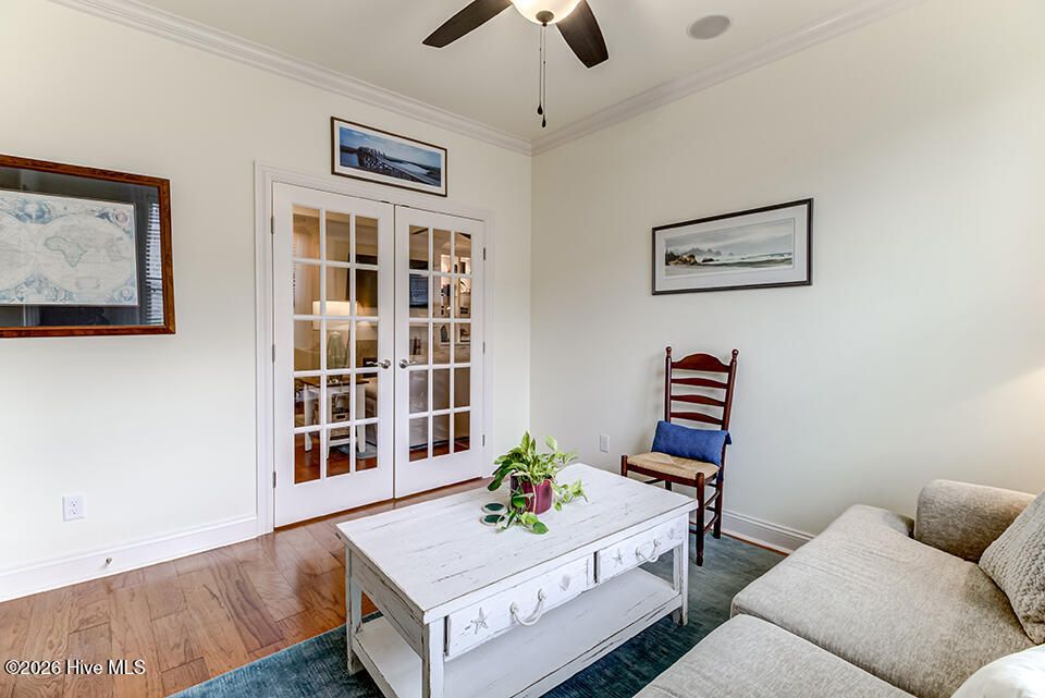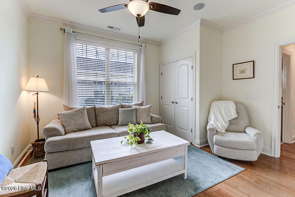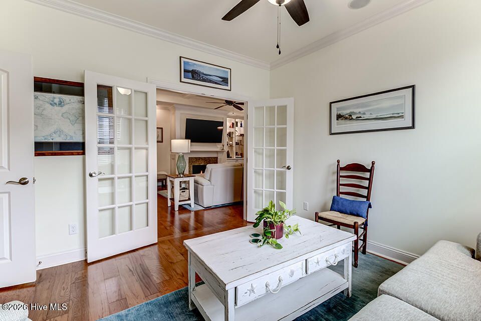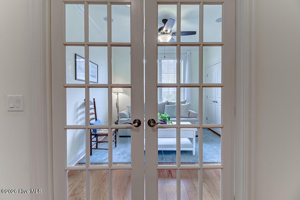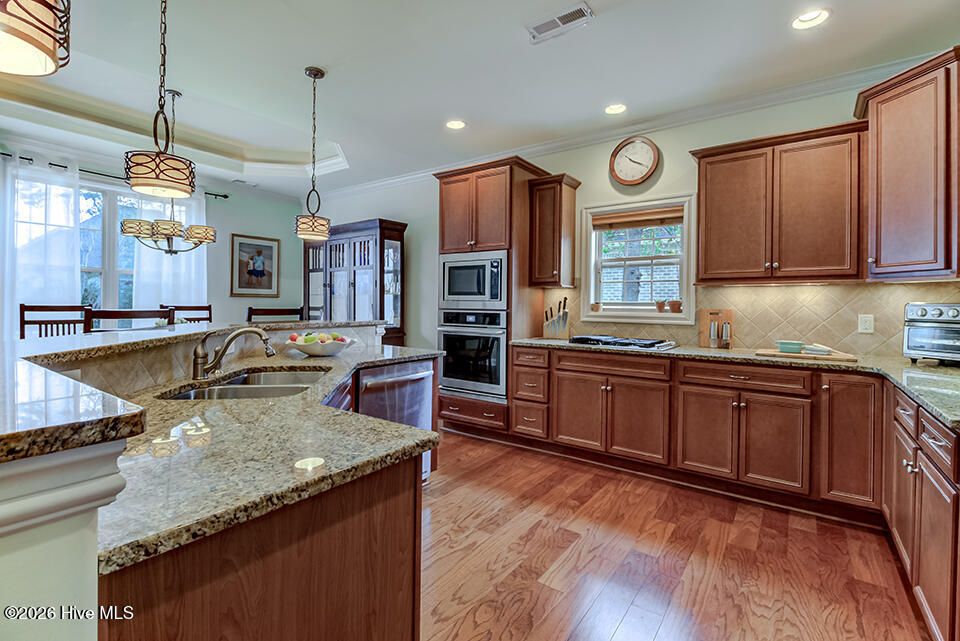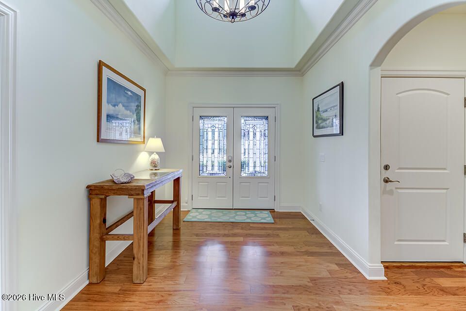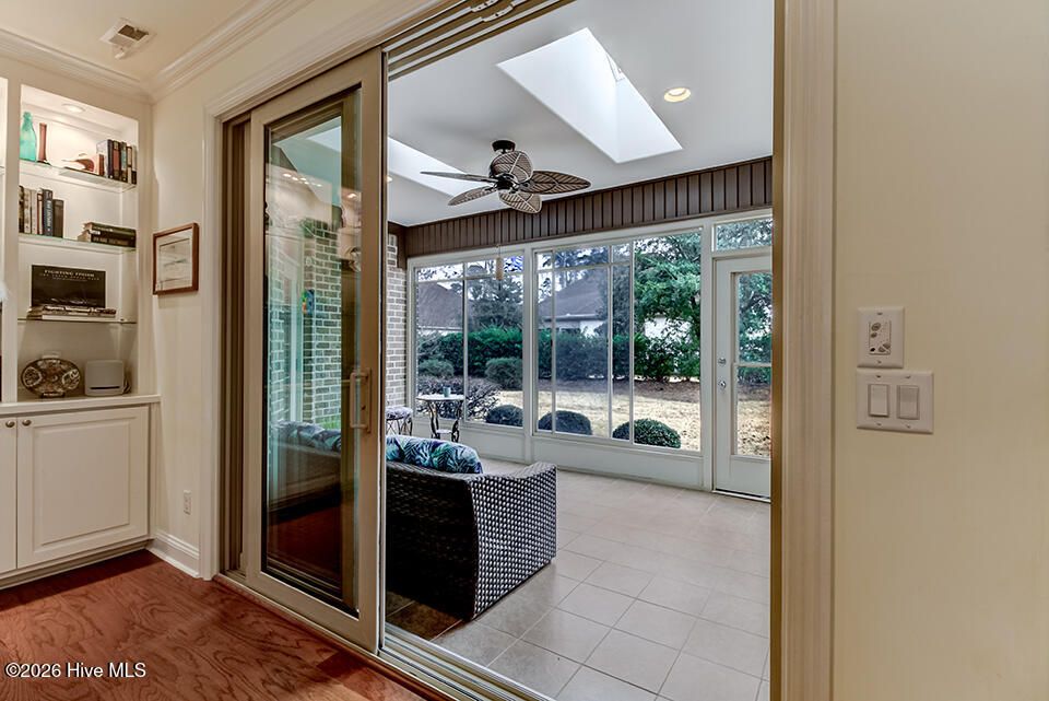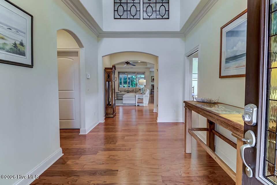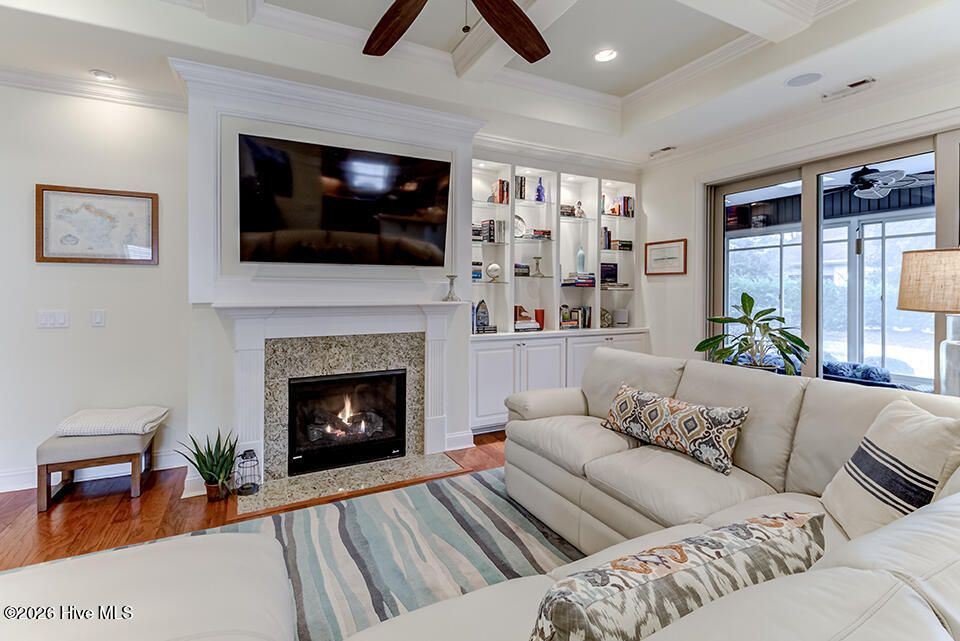 This elegantly designed home sits in the gated, waterfront community of River Bluffs. A true blend of quality and comfort can be found here, from the covered front porch to the grand foyer and main living area, it's bright and inviting. The floor plan offers a quiet, refined space, with 3 bedrooms, ground-floor flex room with French doors and 3 full bathrooms, suitable for all lifestyles. The interior is highlighted by wood floors, trim molding, coffered ceiling and natural light, all centered around a gas fireplace and built-in, lighted bookcase. The kitchen is equipped with granite, plenty of cabinets and JennAir appliances. It opens seamlessly to the dining and living areas and just steps to a screened patio. It extends the living space with a comfortable setting to enjoy the natural yard. The primary suite is private, enjoy a 2-sink vanity, walk-in shower, soaking tub, 2 walk-in closets, sitting nook and direct access to the patio. Perfect for morning coffee. The flex room is an excellent option for an office, guest room or den. A full bath is shared with another bedroom to complete a single-level living scenario. Send the kids upstairs to a large, sunny bedroom with a full bathroom. The feature list continues- surround sound, laundry room with cabinets, 2-car garage with storage, irrigation, HOA-maintained yard and a whole house generator providing peace of mind and low-maintenance living. It's conveniently located just minutes from Downtown Wilmington, shopping, dining and many more attractions like music venues and beaches. River Bluffs, along the Northeast Cape Fear River, is known for its commitment to preservation. You'll enjoy countless amenities including a restaurant, fitness centers, pools, trails, marina, outdoor courts, dedicated pickleball courts, parks, dog park, playground, weekly trash service, boat/RV storage and so many social clubs! It's resort style living, surrounded by untouched green spaces and situated on the corner of a flourishing city
