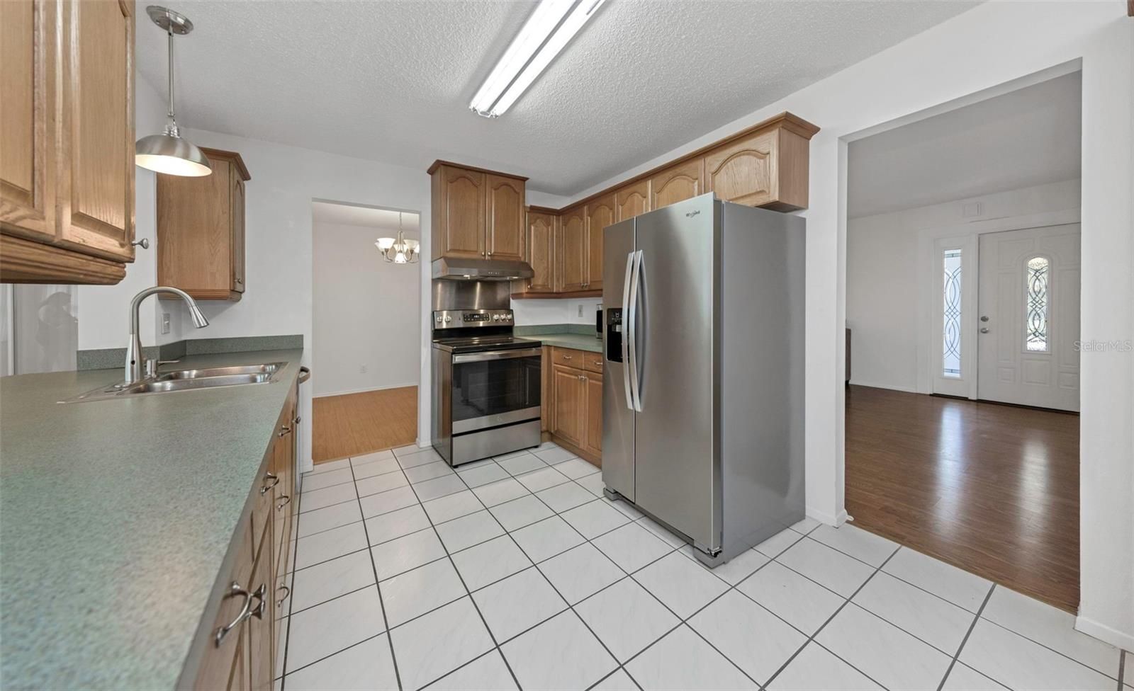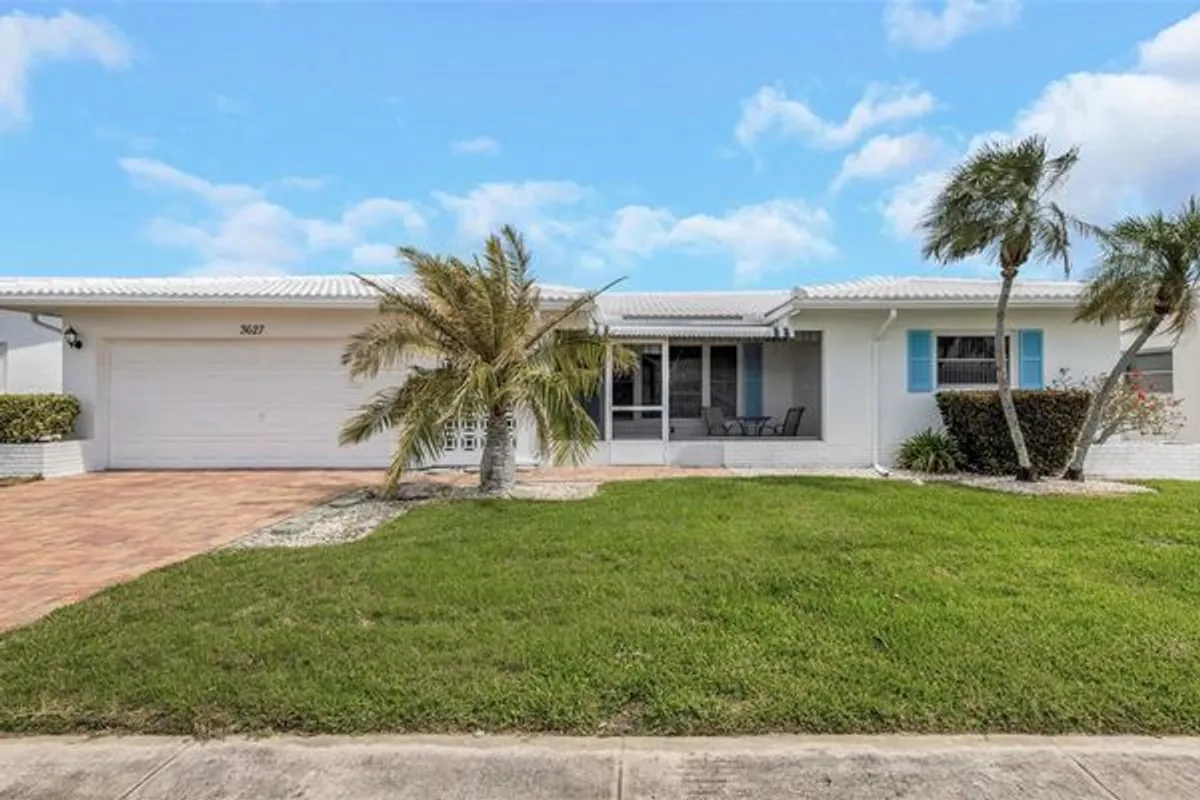 Beautifully updated home with an open floor plan and modern finishes throughout. Kitchen features stainless steel appliances (less than 3 years old), abundant cabinet and counter space, glass upper cabinets with lighting, and a pass-through to the Florida room. Major updates include HVAC (2019) and both tile and flat roof (2018, maintained by condo association). Spacious living room with a picture window provides a perfect space to relax. Florida room offers plenty of space for games, entertaining, or relaxing. Back patio is ideal for grilling. Screened front porch plus brick paver driveway and front walkway add great curb appeal. Additional features include 2-car garage, laundry room with wash tub, and 2024 washer and dryer with transferable extended warranty. Underground utilities. Classic wood bedroom furniture conveys along with select additional pieces shown in photos. Affordable monthly maintenance fee of $485 includes roof repair and replacement, lawn care, exterior painting, water, sewer, trash, reclaimed water irrigation, internet, and two digital cable boxes — providing exceptional value and peace of mind. Mainlands community offers clubhouse, heated in-ground pool, shuffleboard courts, and a full calendar of activities. The neighborhood surrounds an 18-hole public golf course and is adjacent to Freedom Lake Park, featuring paved walking trails around two lakes, outdoor fitness equipment, bocce courts, playground, picnic pavilions, dog park, and sailboat racing. Conveniently located near shopping, dining, medical facilities, banking, and cultural and sporting venues.