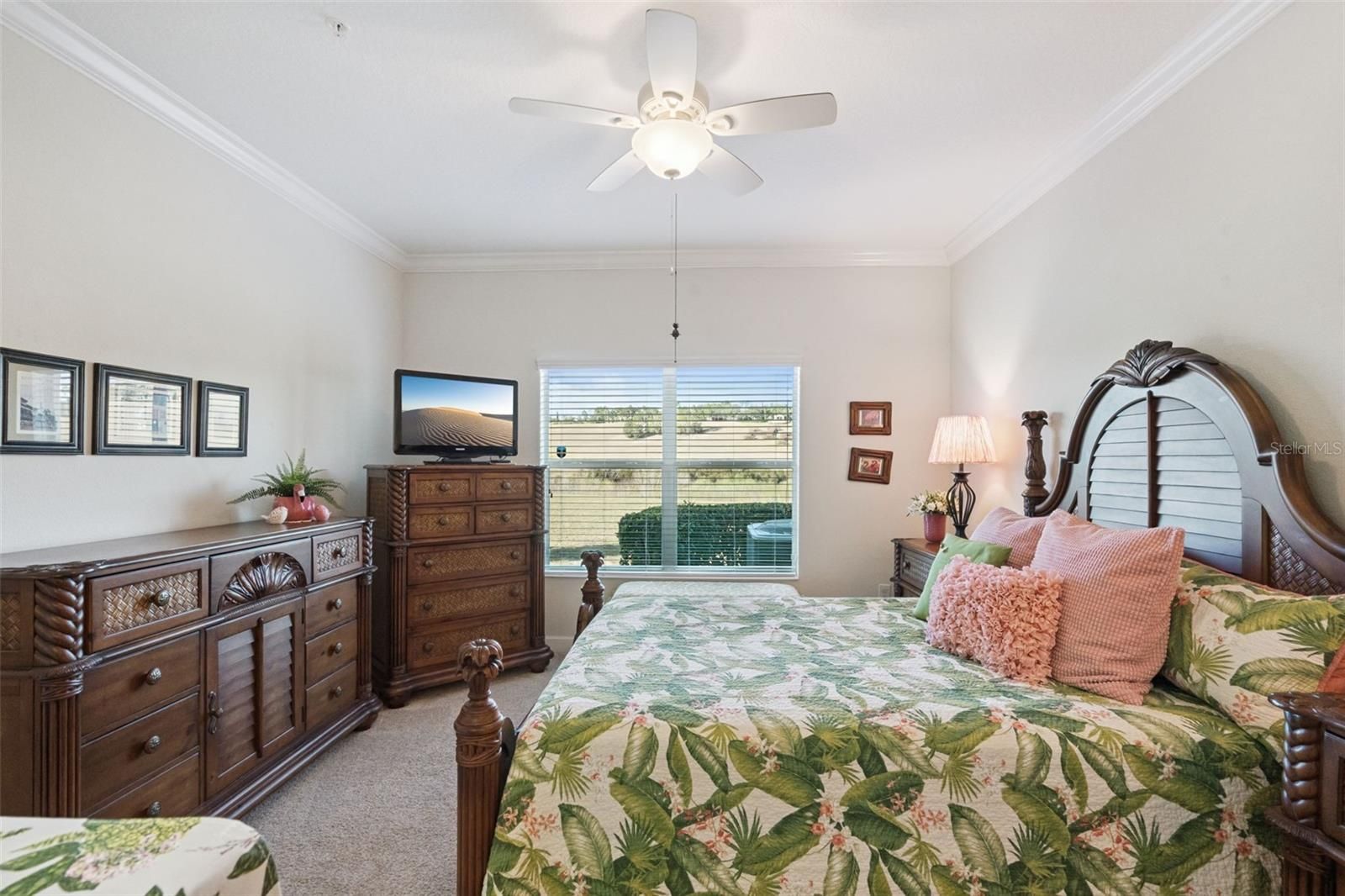 - Ceiling Fan(s), Crown Molding, High Ceilings, In-Wall Pest Control, Open Floorplan, Main Level Primary, Solid-Wood Cabinets, Split Bedrooms, Stone Counters, Thermostat, Walk-In Closet(s), Window Treatments