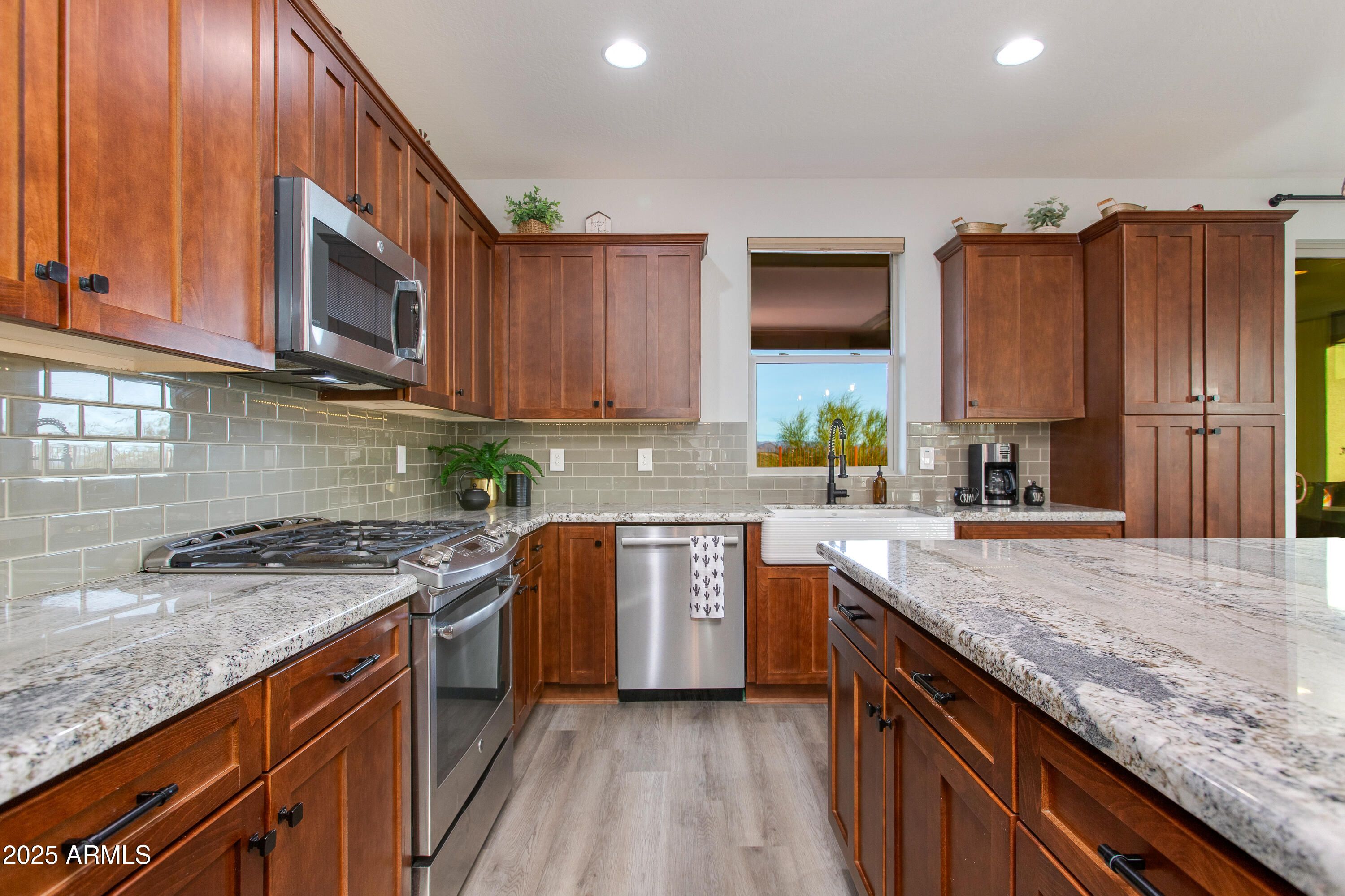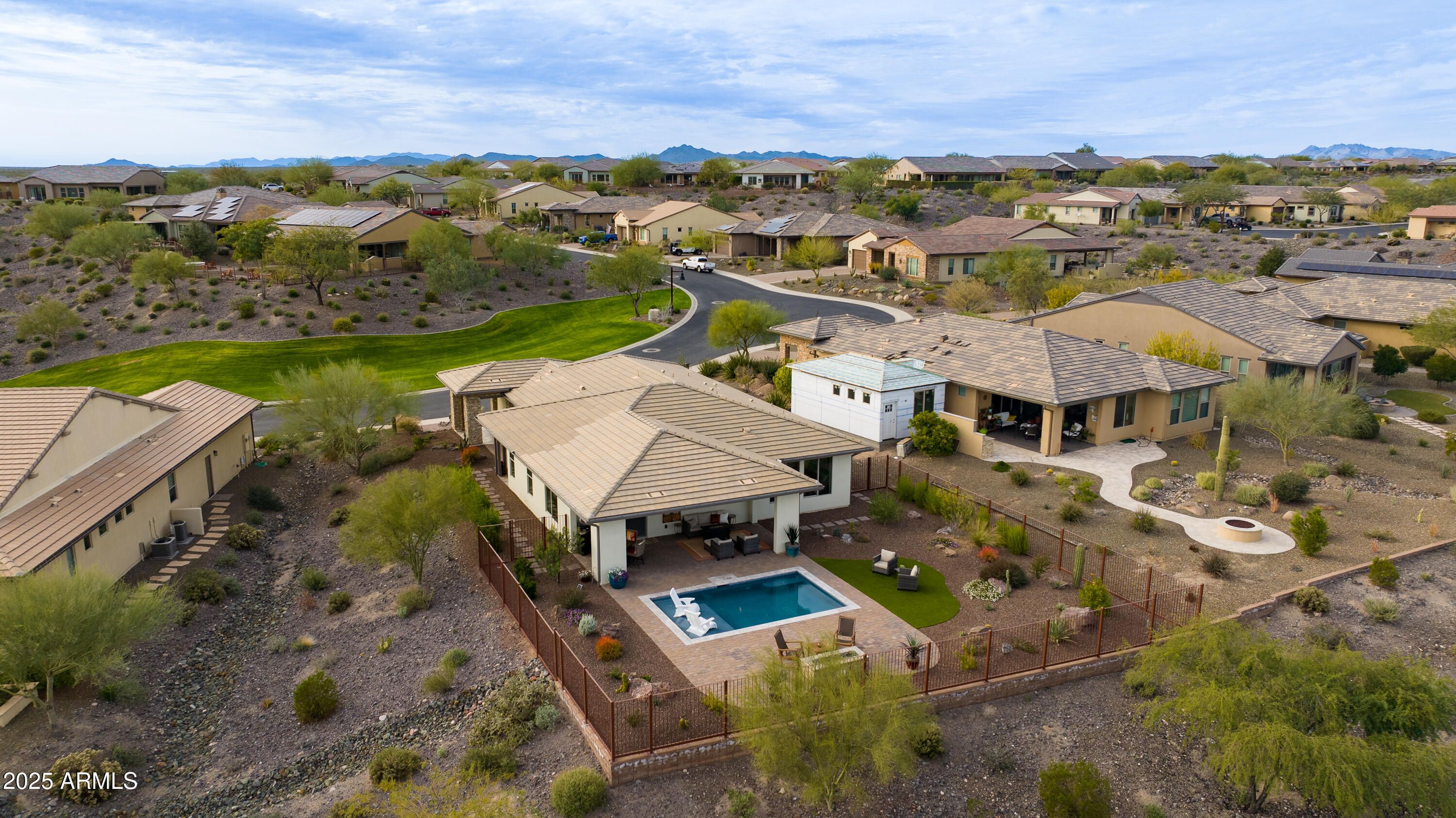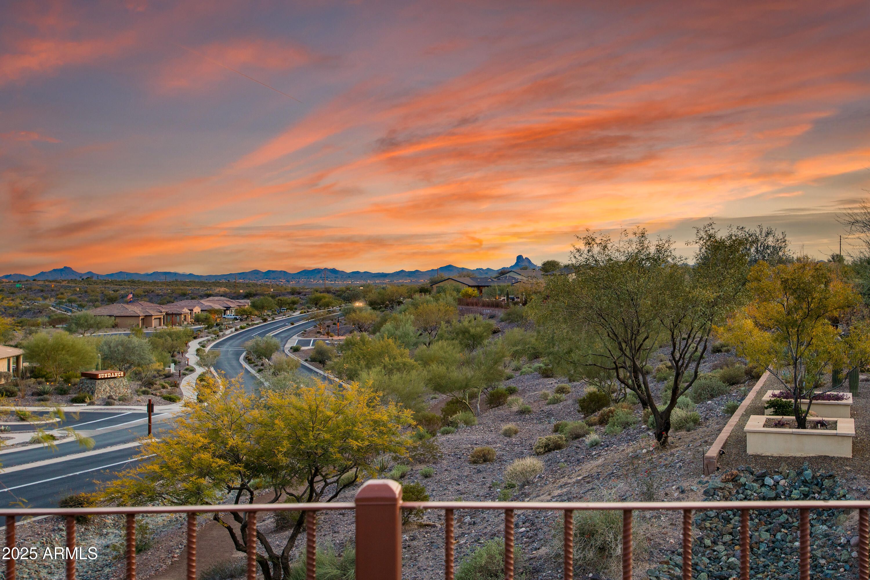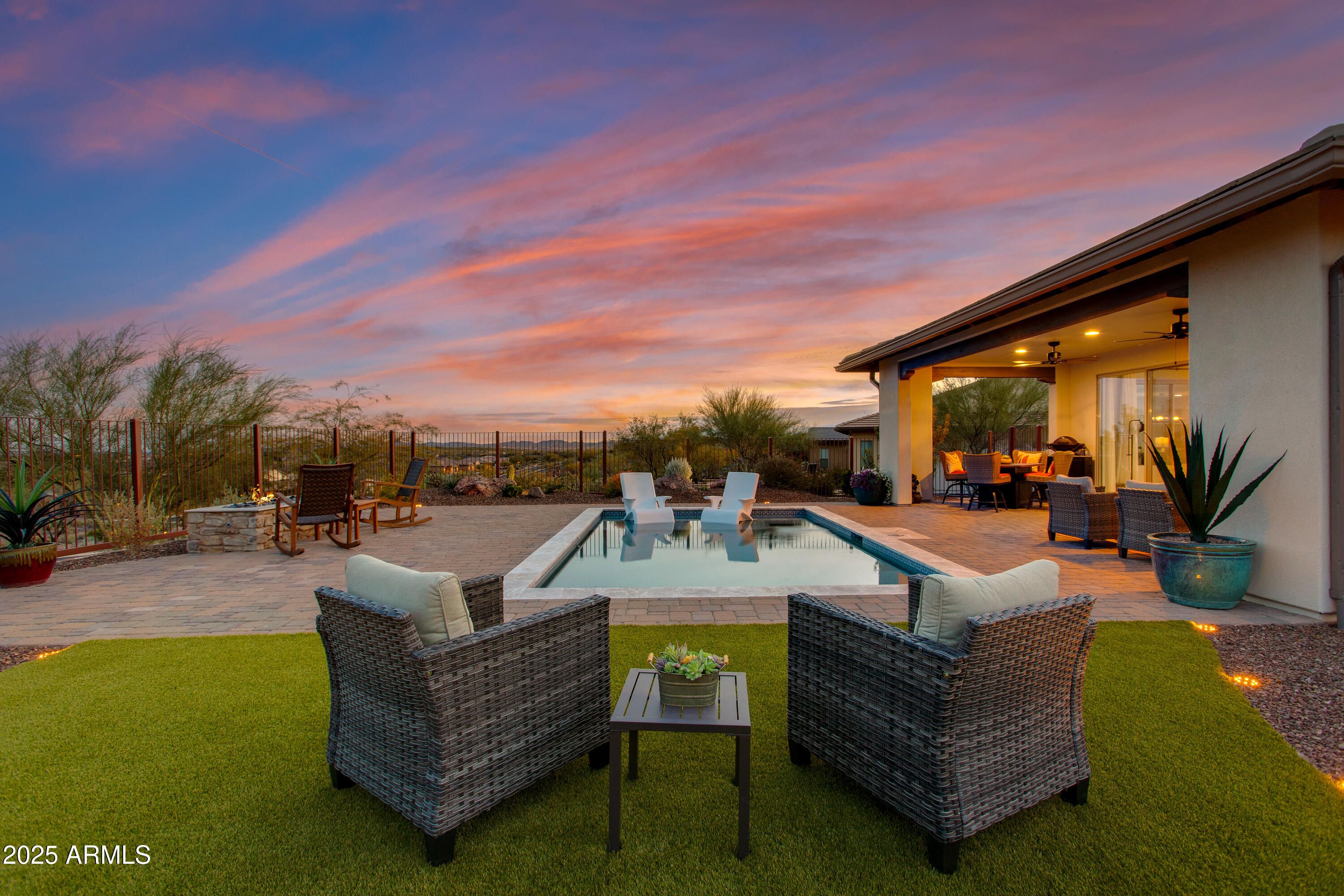 Wake up to SUNRISE VIEWS w/ breathtaking SUNSET-PAINTED MOUNTAIN at night.Sycamore floor plan by Shea Homes in Lariat neighborhood, elevated homesite with panoramic desert mountain views.3 bed,2.5 bath layout with French doors at flex space creating true third bedroom—ideal for guests or office.HOA-maintained green spaces & desert landscape at front & side,plus newly completed landscaping front & back.Backyard features non-chlorinated,non-salt oxygenated freshwater pool with nano-bubble system & upgraded irrigation.Interior upgrades include new lighting & fans,upgraded wood cabinetry throughout,cabinet pullouts,granite countertops,gas cooktop,farmhouse apron sink & enhanced laundry with added cabinetry & workspace. Water softer & additional garage insulation.