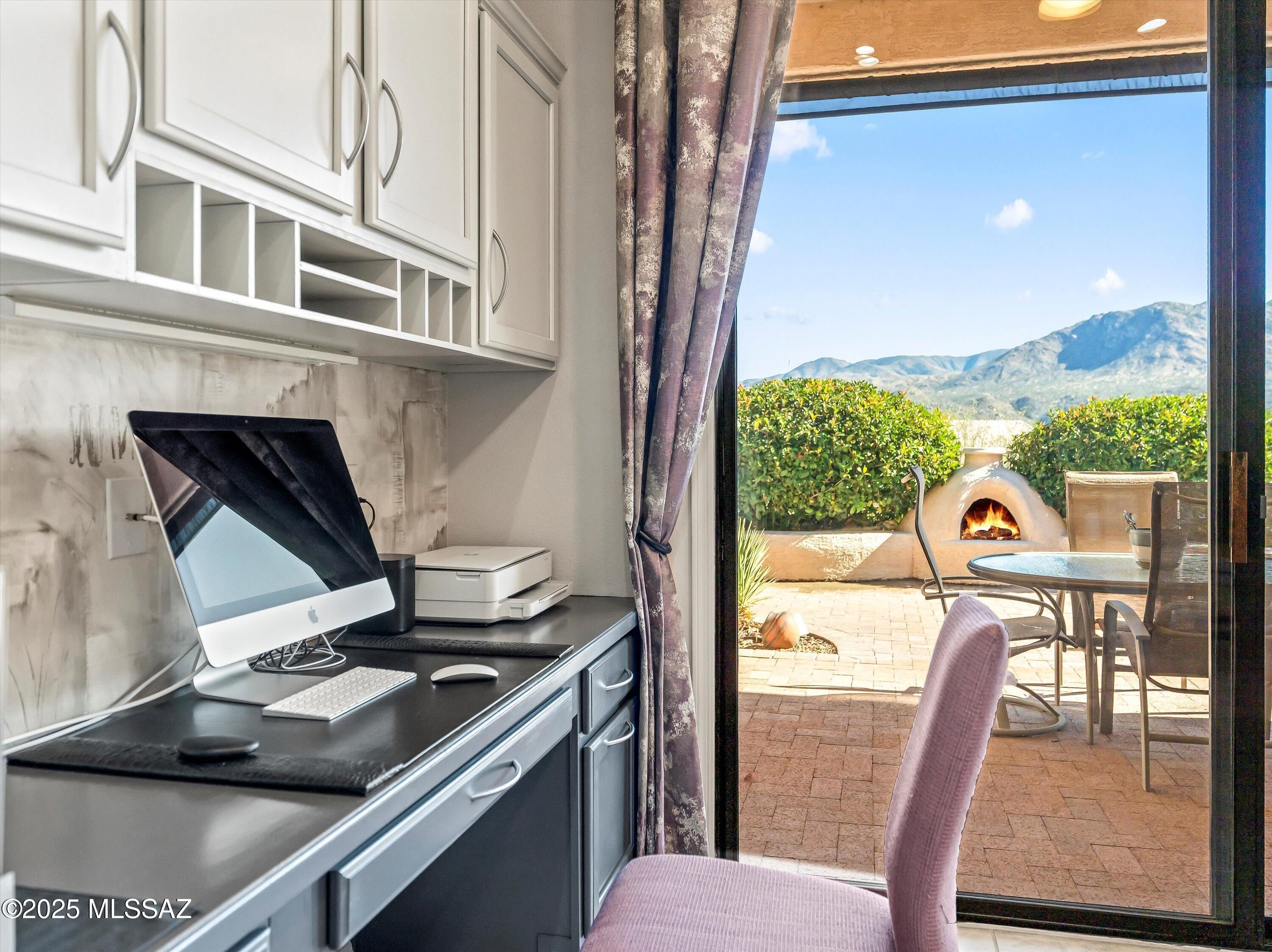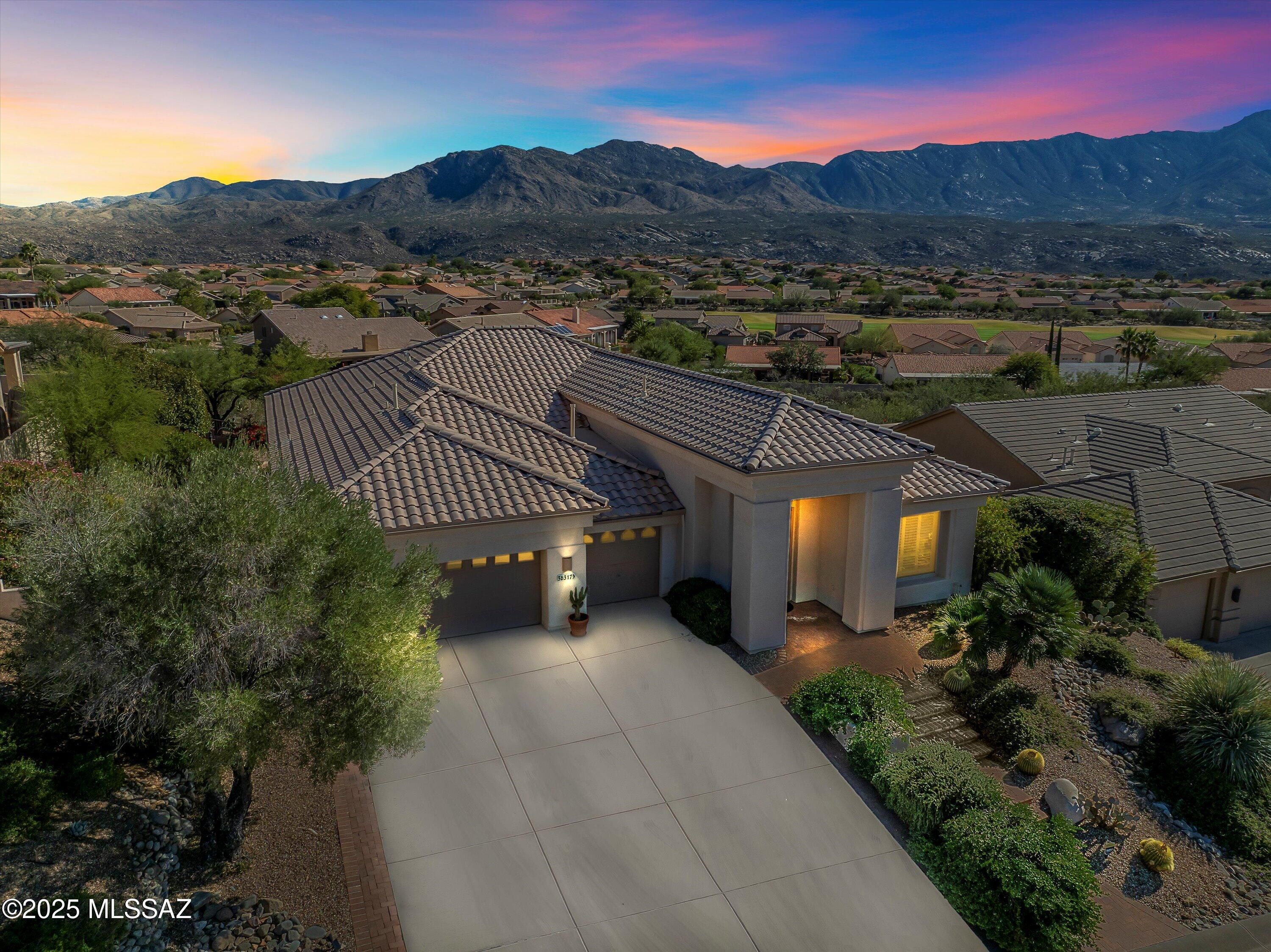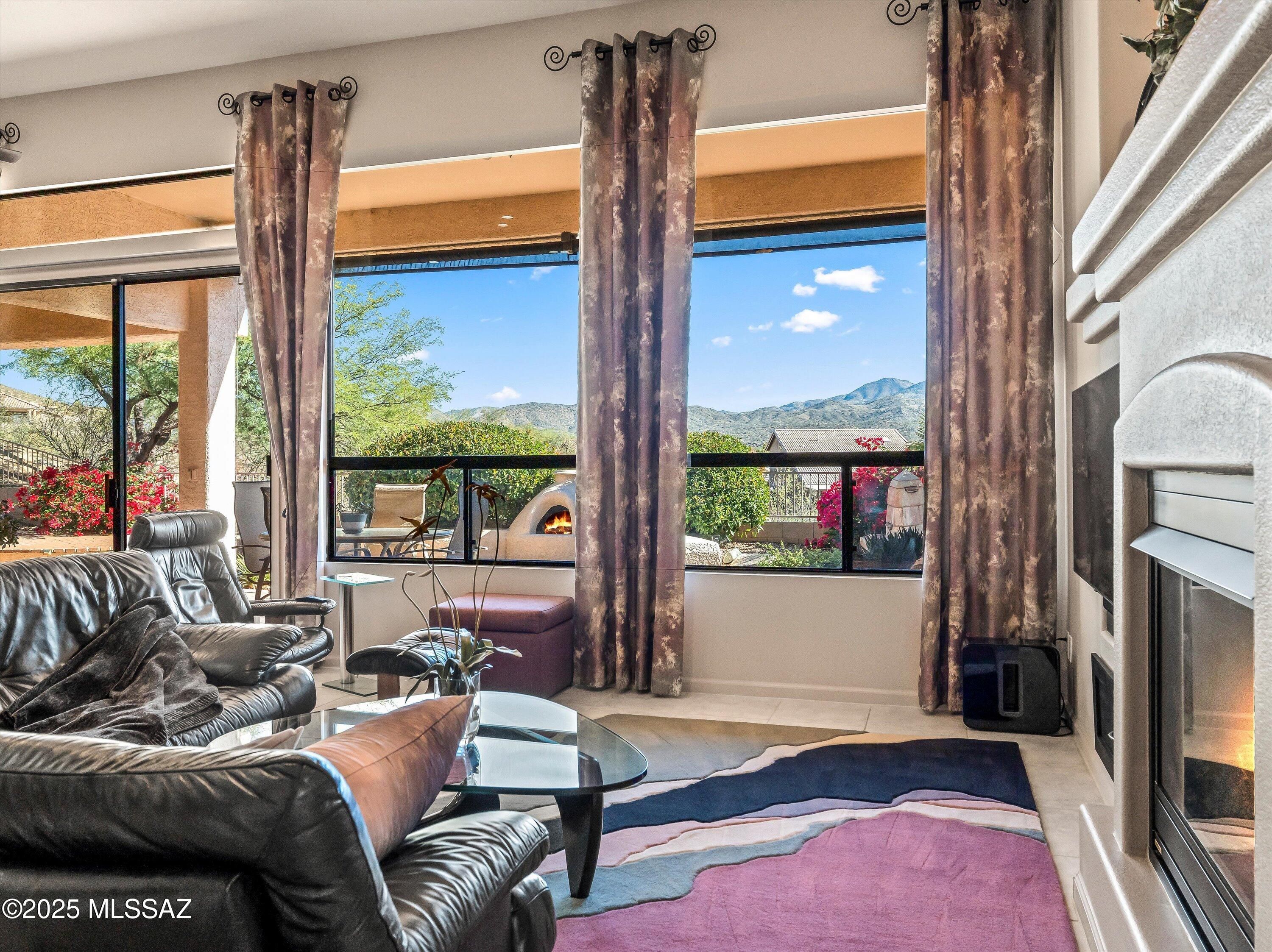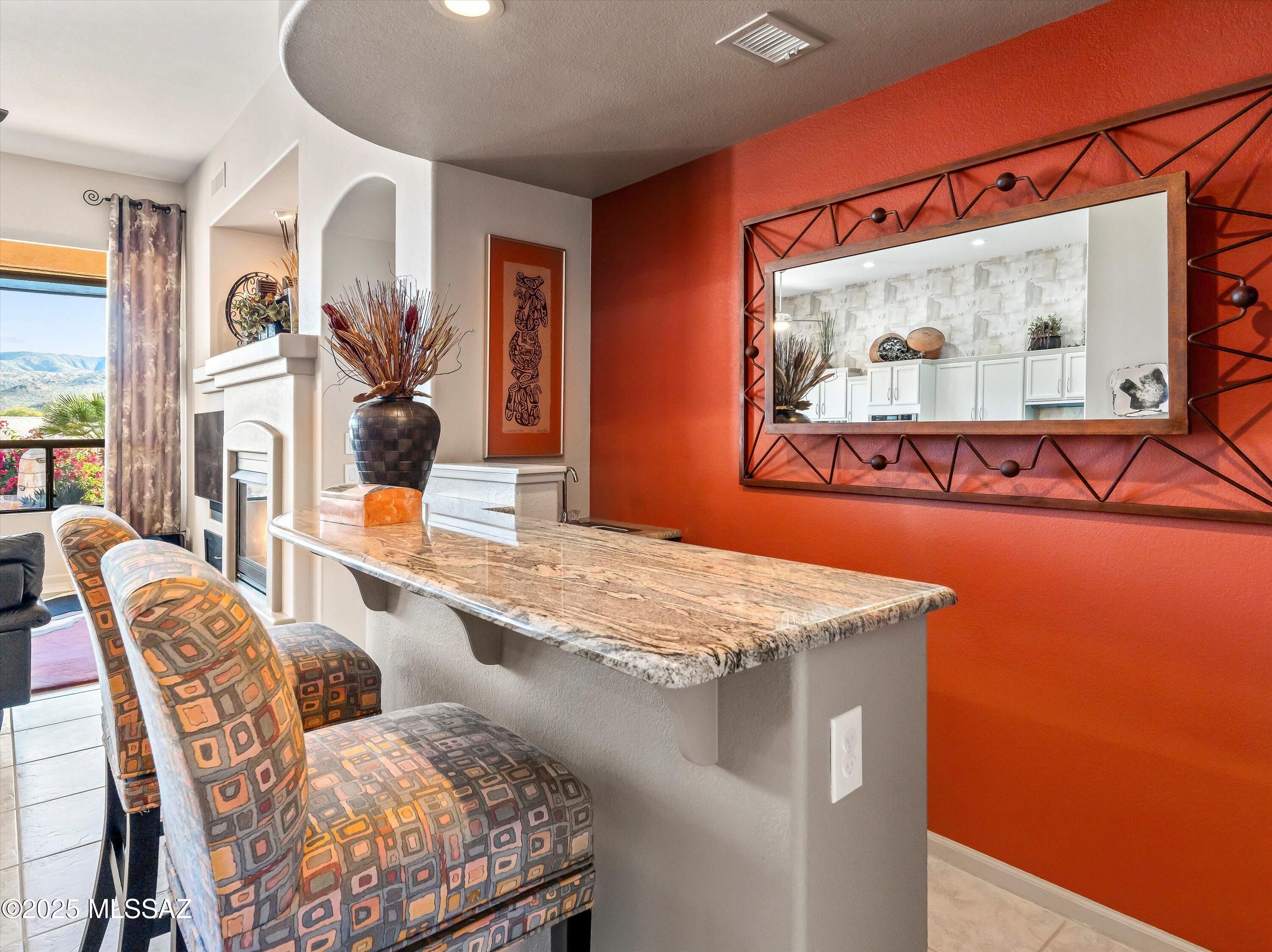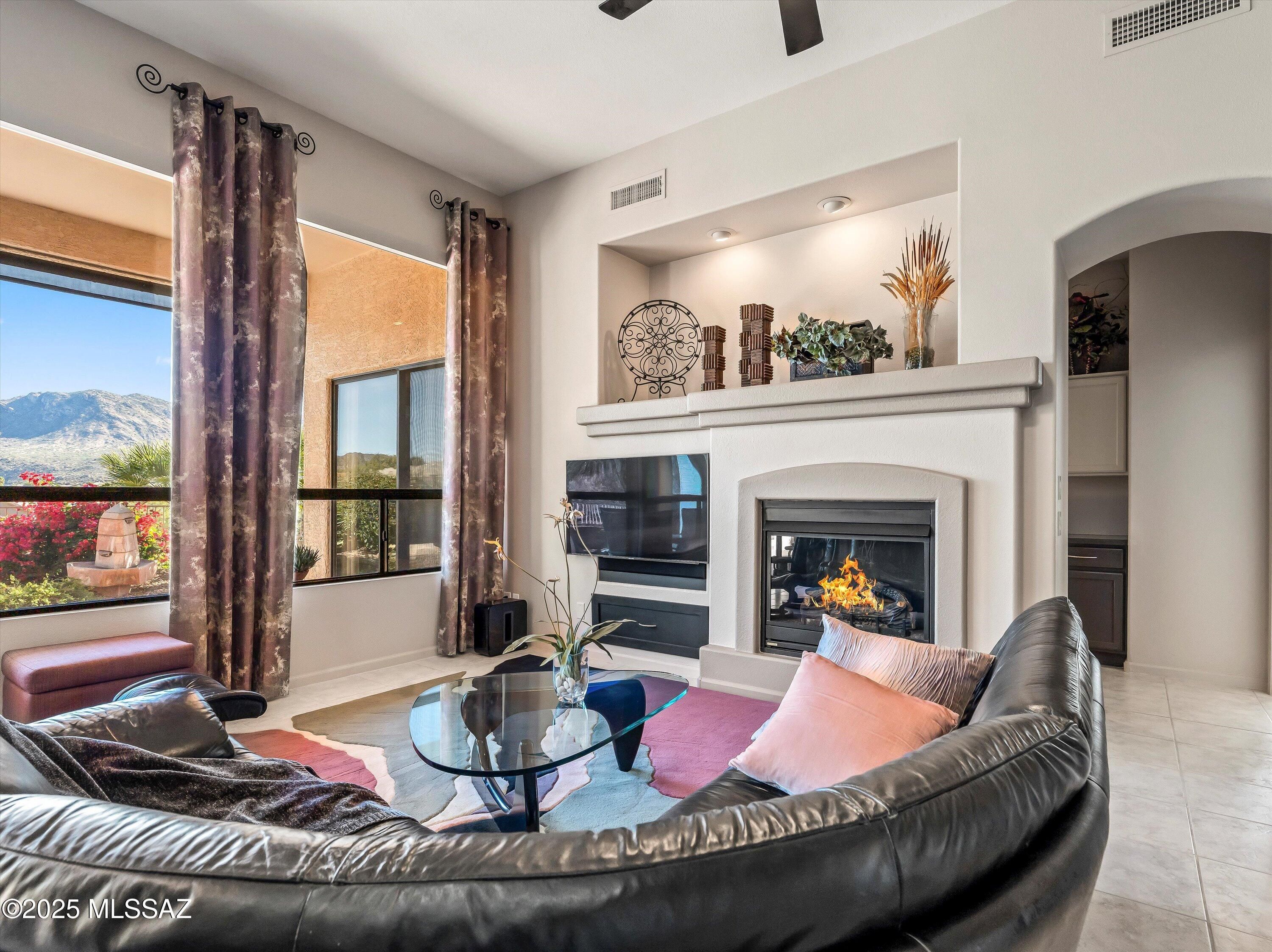 This contemporary Cheyenne model offers breathtaking views throughout. Upon entry, you'll find dramatic accent colors and modern decor that create a welcoming atmosphere. The great room is tailored for entertaining, with generous space that flows seamlessly into the den, where elegant built-ins provide an ideal setting for intimate gatherings. The dining space easily accommodates larger groups, while a built-in bar guides you to the family room where expansive windows showcase the spectacular scenery and the fireplace adds warmth, complementing the SaddleBrooke lifestyle. The open kitchen offers ample cabinetry, generous counter space, and stainless-steel appliances. In the primary suite mountain vistas are front and center, complemented by an en-suite bathroom with a roomy tile shower,
