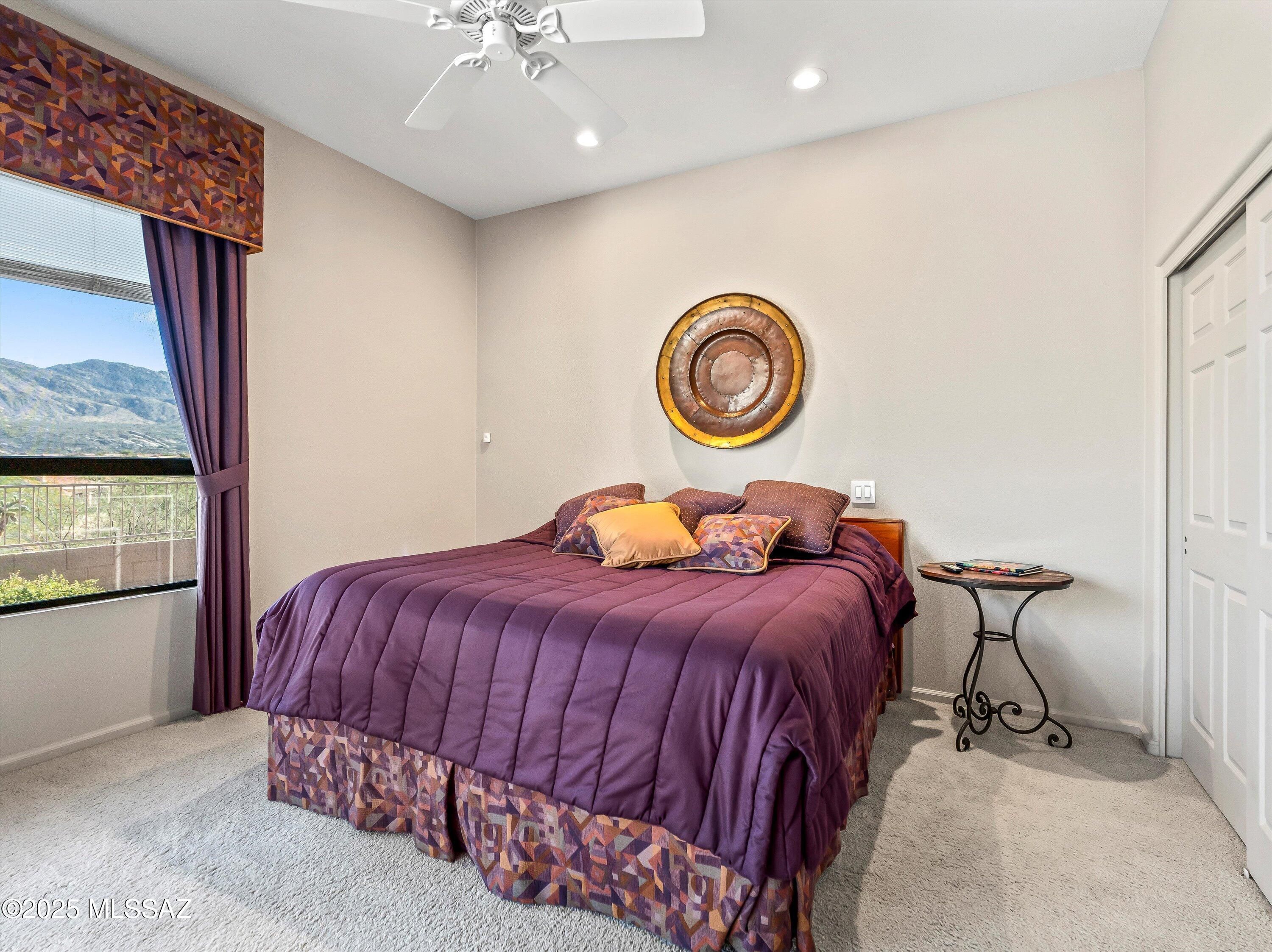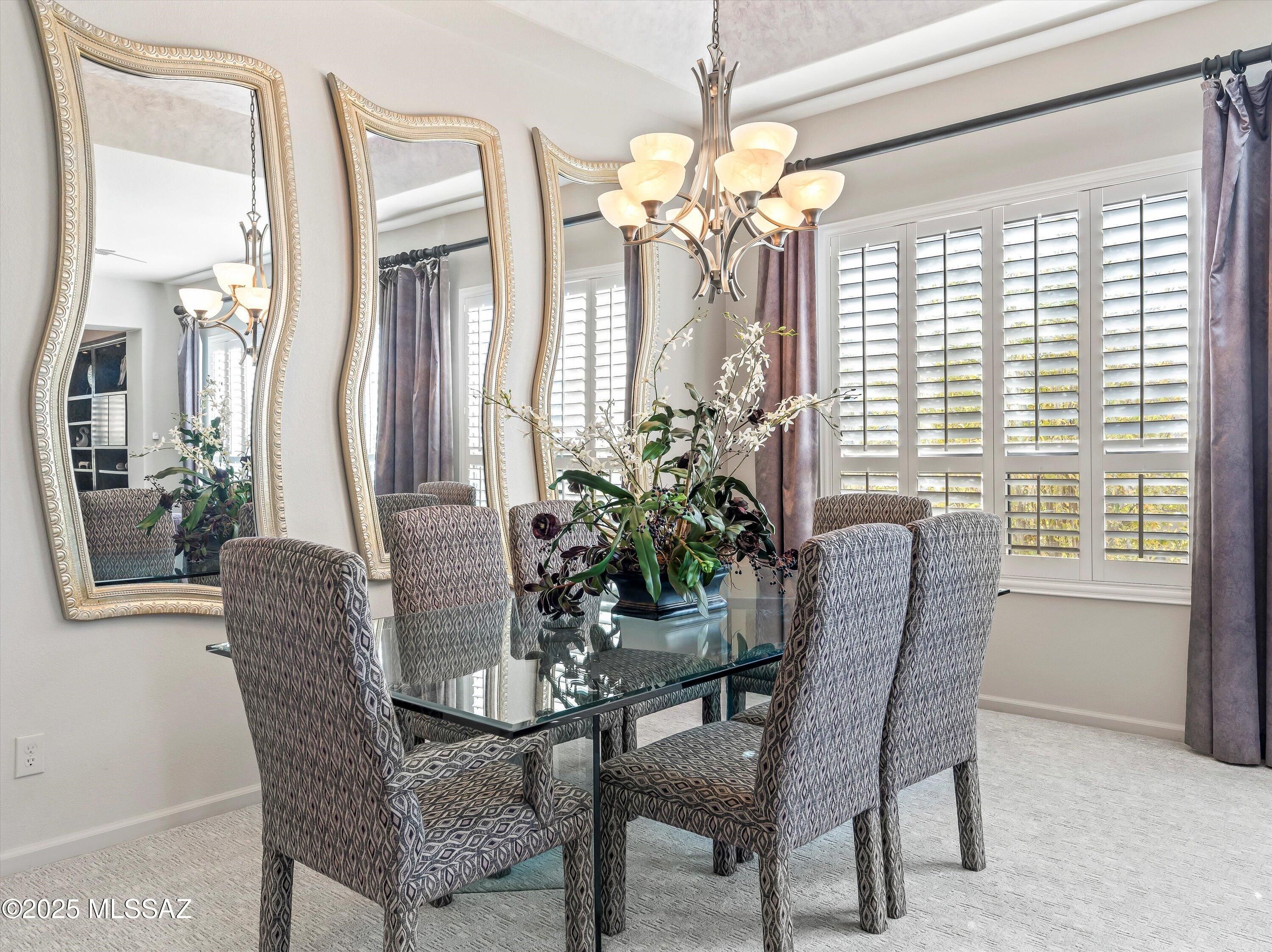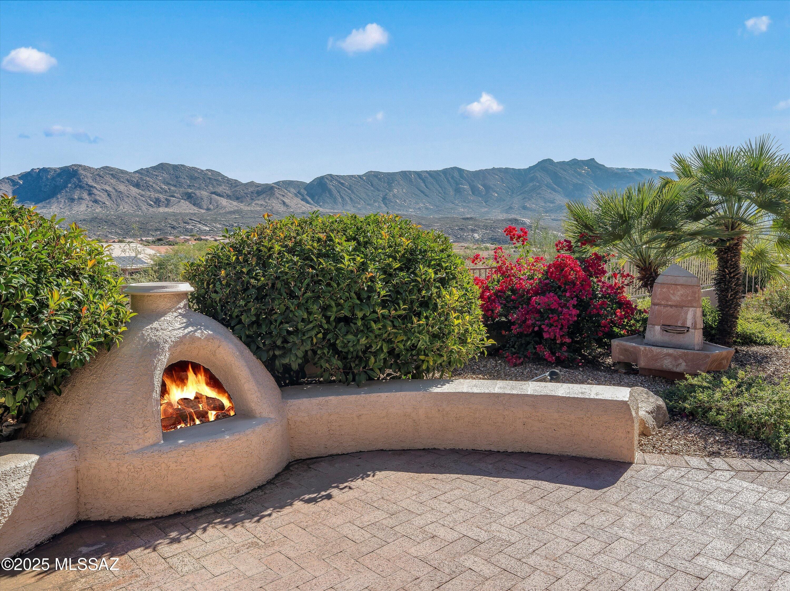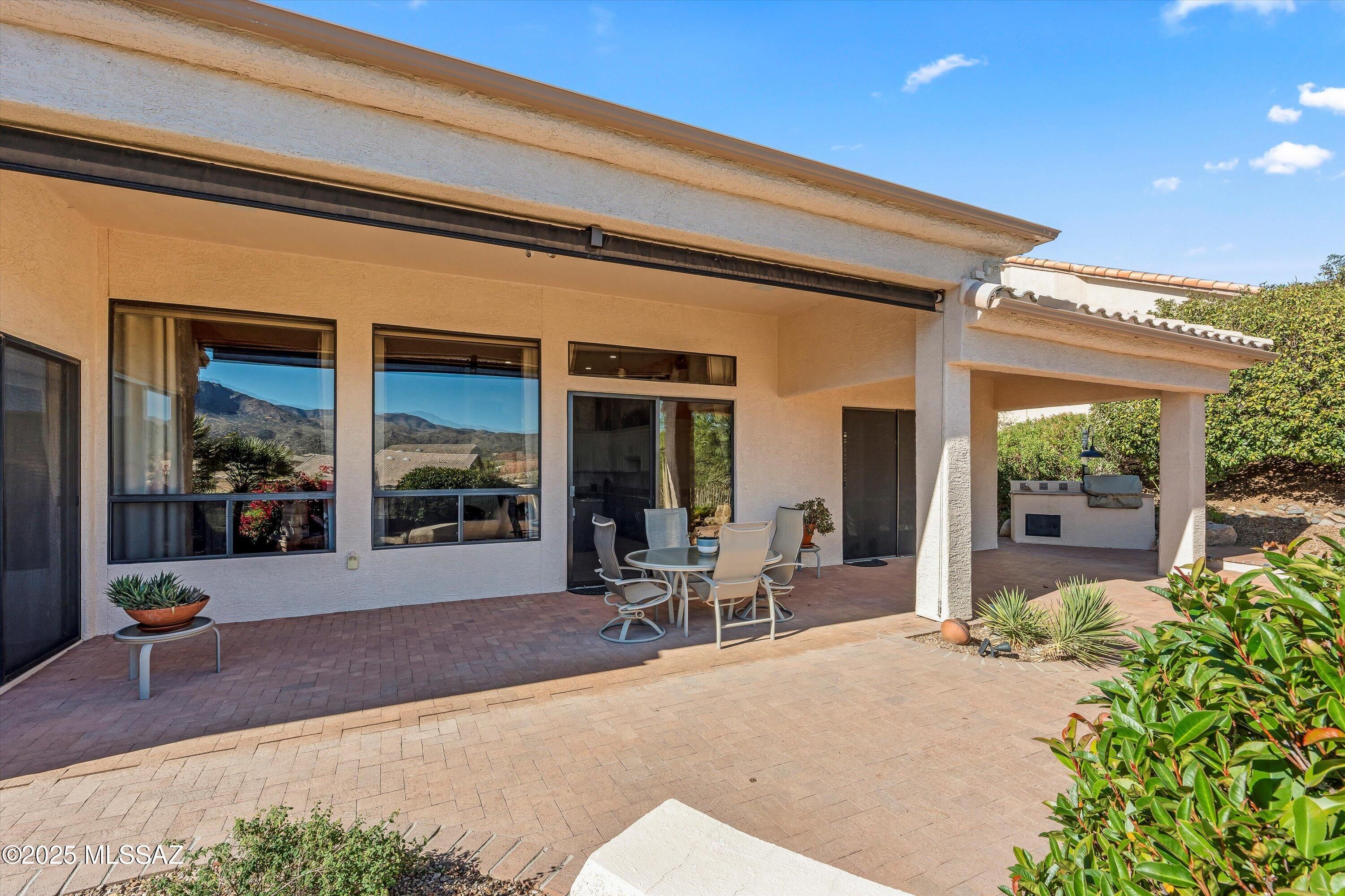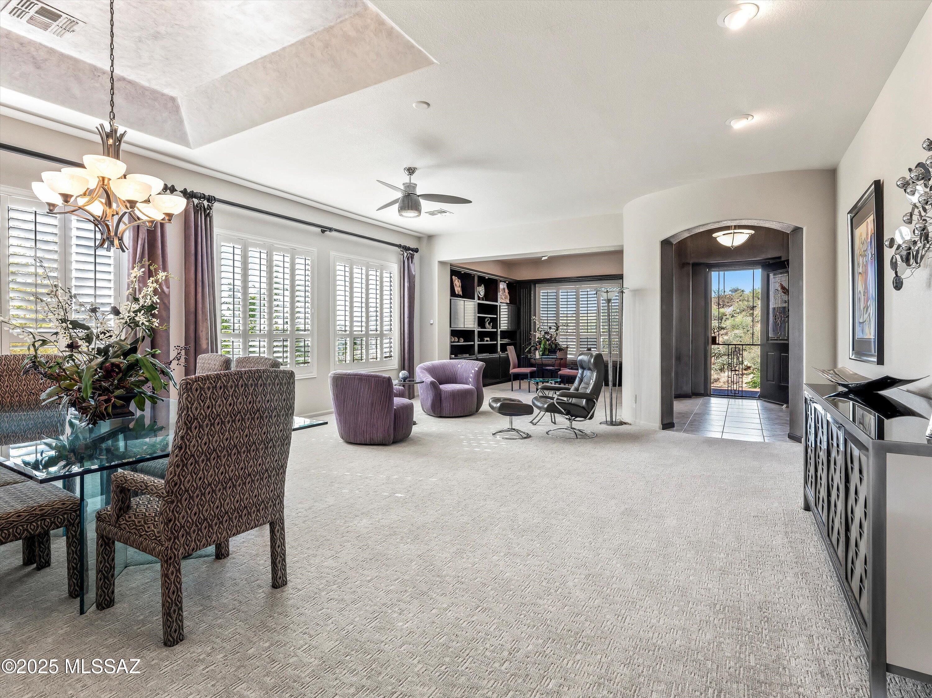 This contemporary Cheyenne model offers breathtaking views throughout. Upon entry, you'll find dramatic accent colors and modern decor that create a welcoming atmosphere. The great room is tailored for entertaining, with generous space that flows seamlessly into the den, where elegant built-ins provide an ideal setting for intimate gatherings. The dining space easily accommodates larger groups, while a built-in bar guides you to the family room where expansive windows showcase the spectacular scenery and the fireplace adds warmth, complementing the SaddleBrooke lifestyle. The open kitchen offers ample cabinetry, generous counter space, and stainless-steel appliances. In the primary suite mountain vistas are front and center, complemented by an en-suite bathroom with a roomy tile shower,