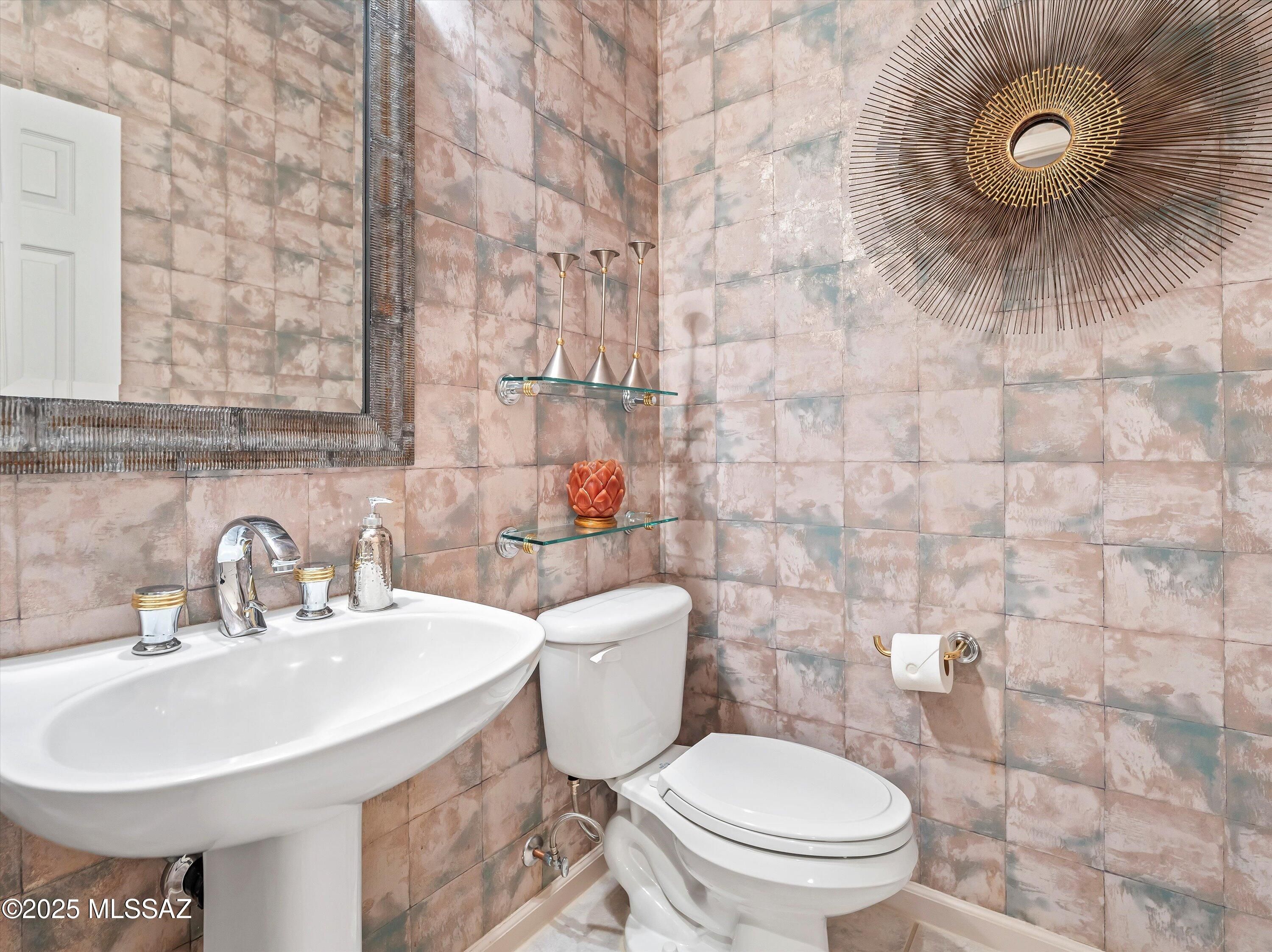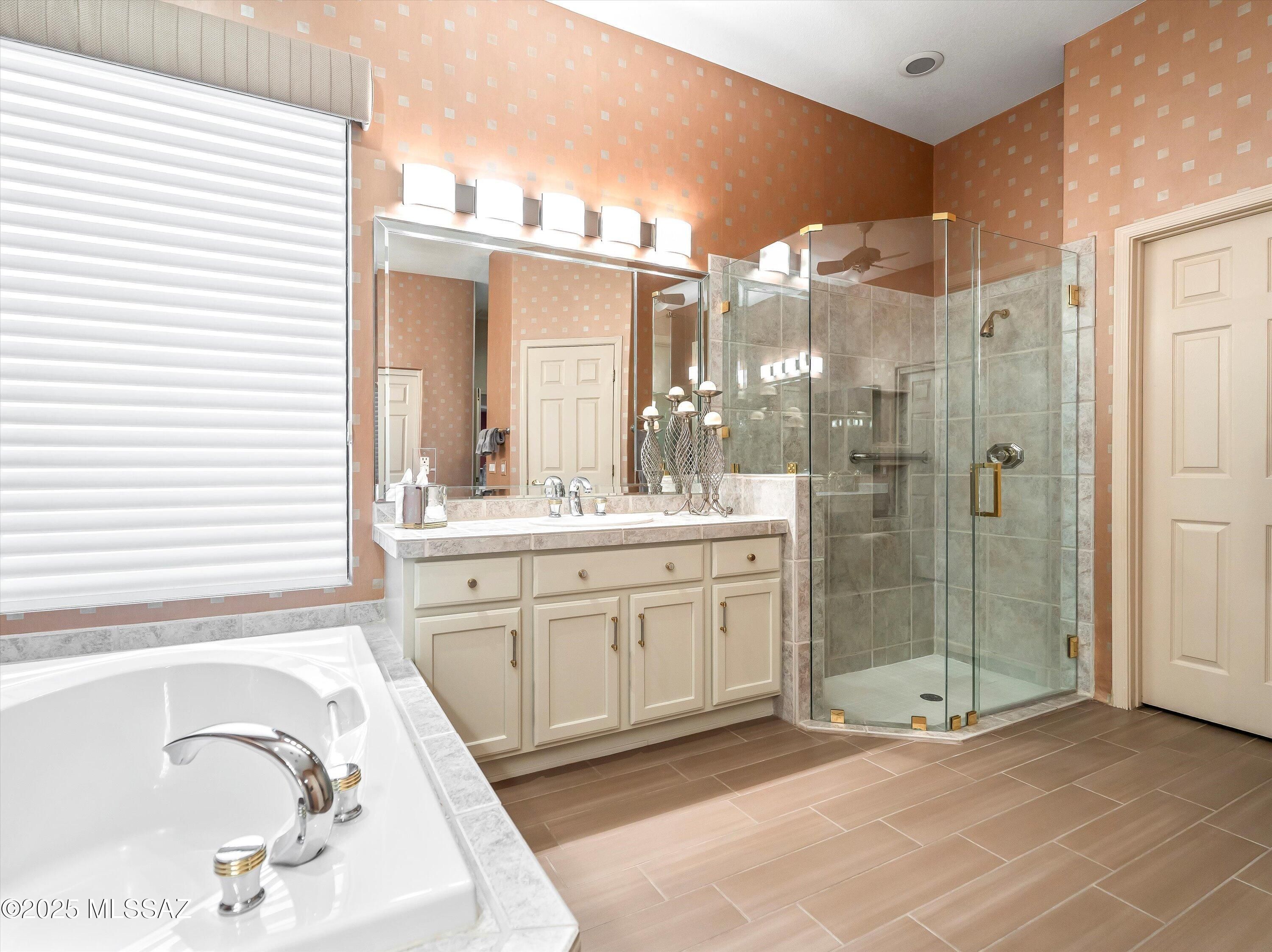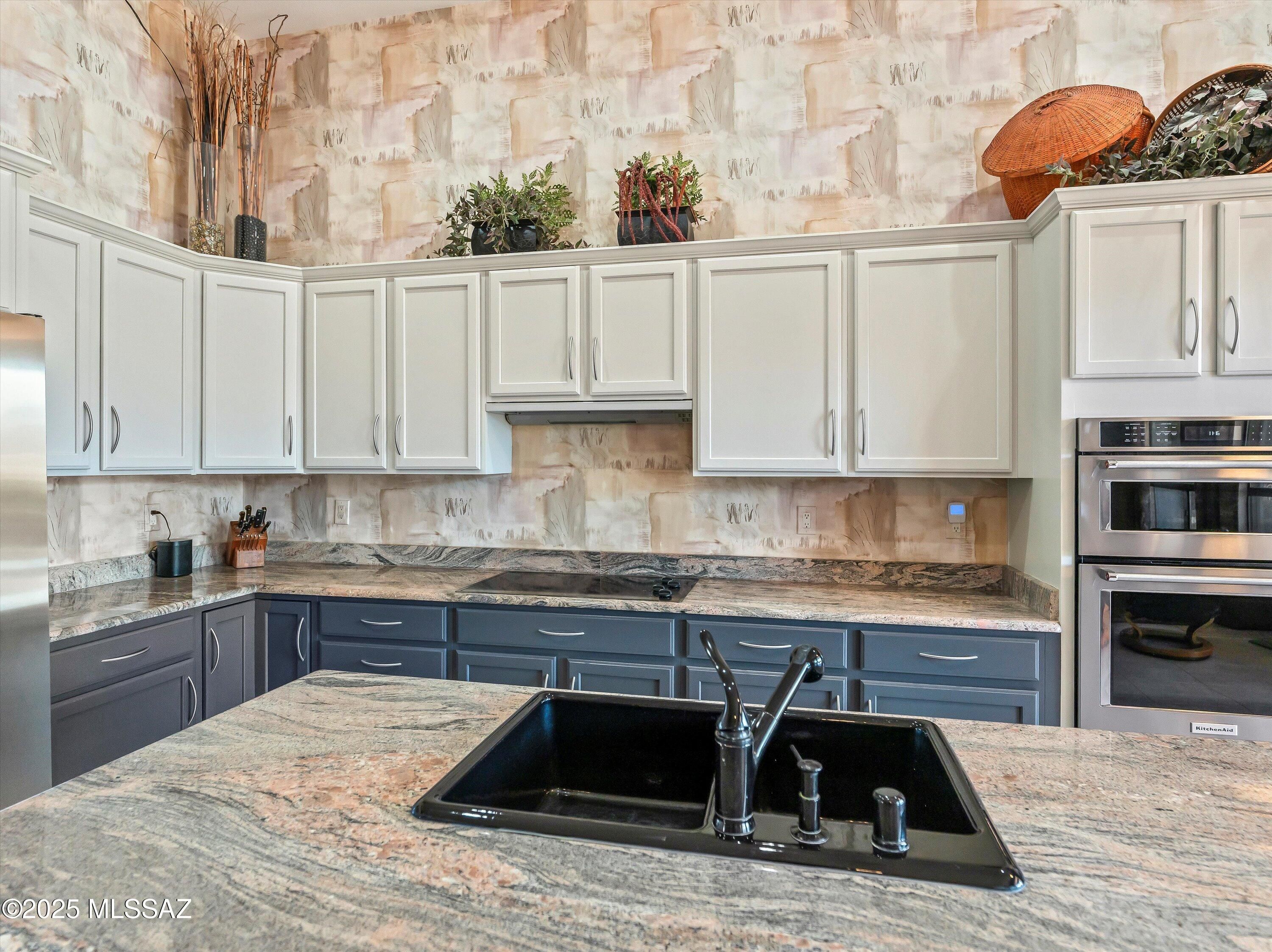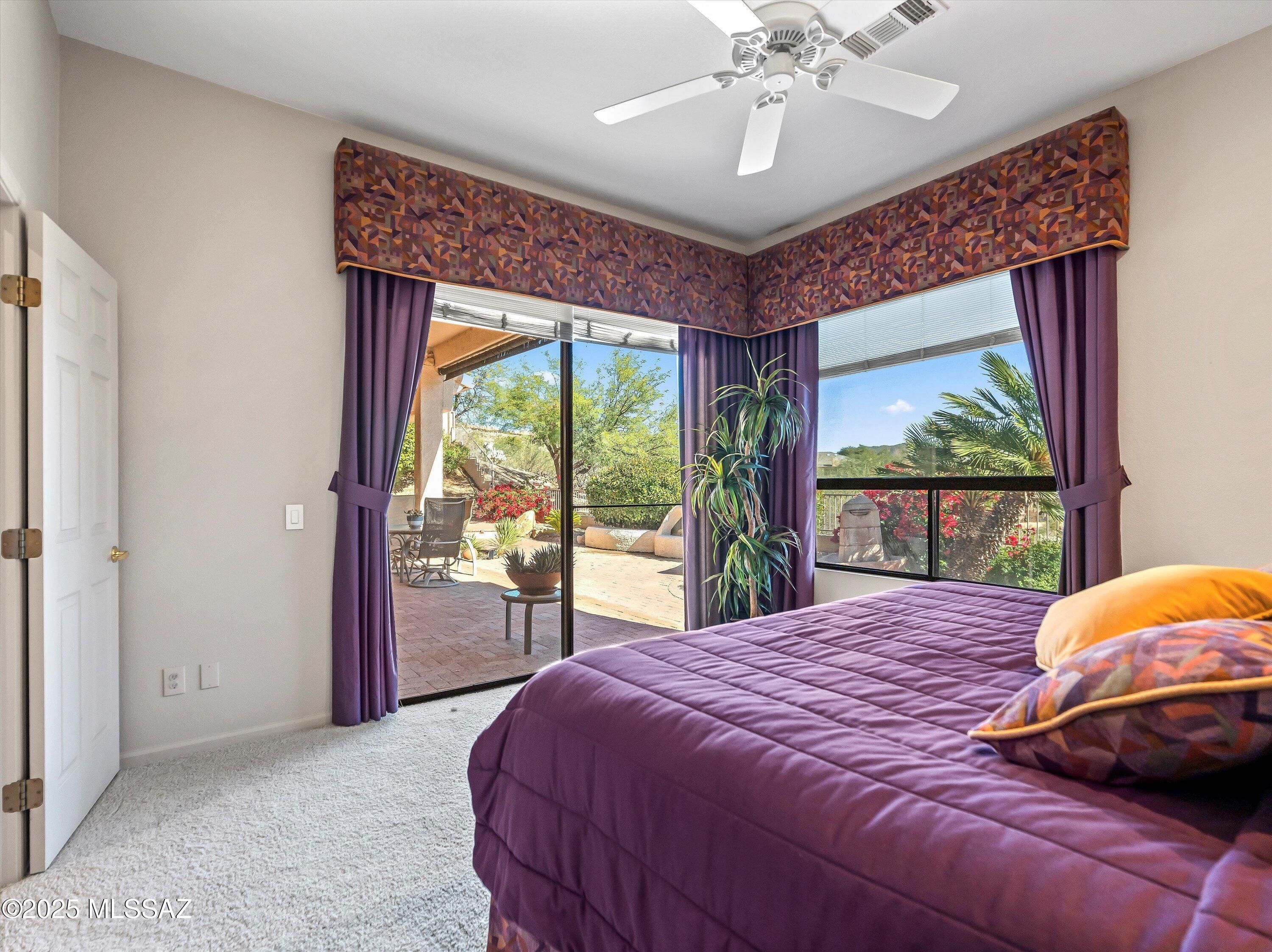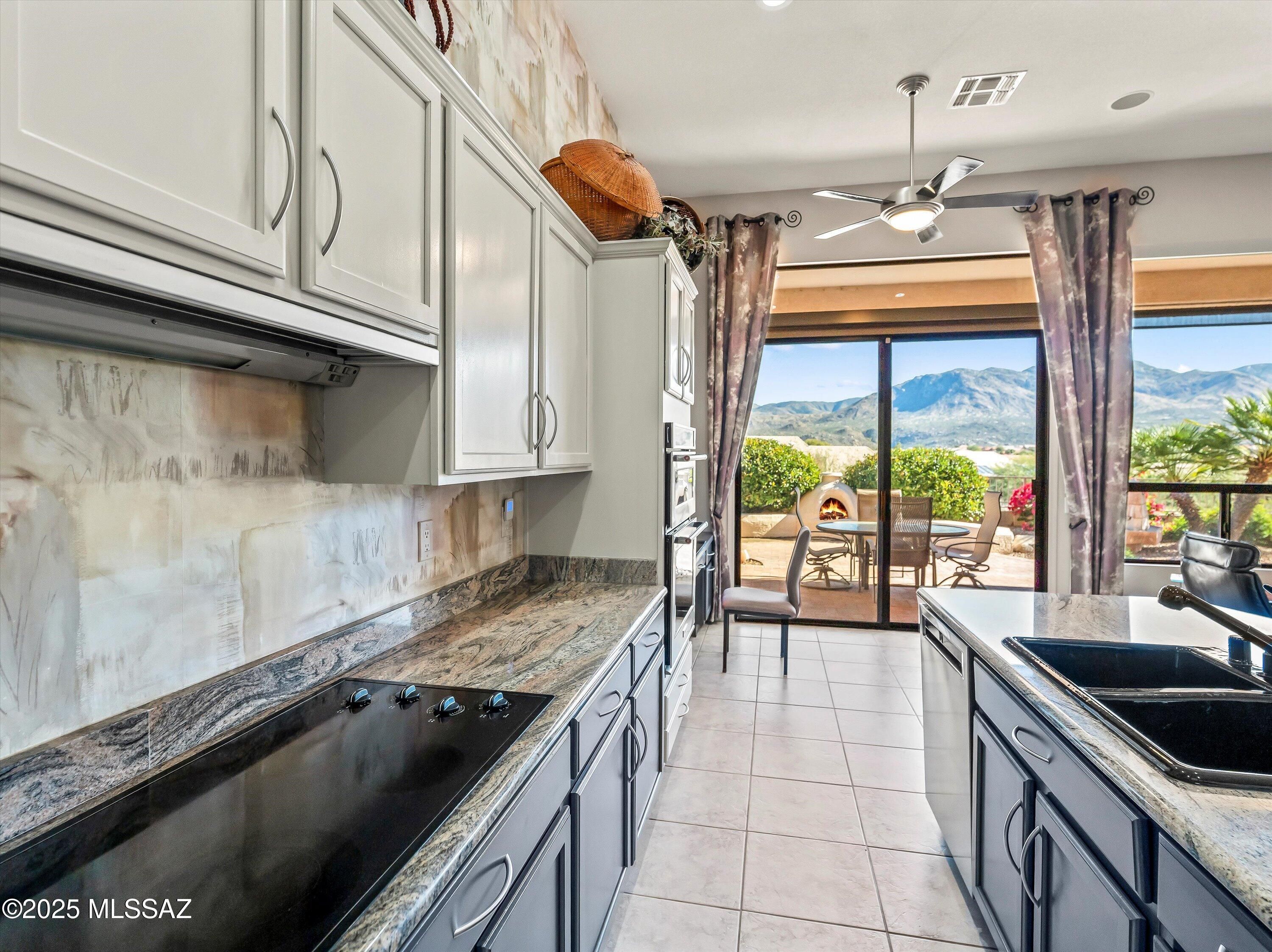This contemporary Cheyenne model offers breathtaking views throughout. Upon entry, you'll find dramatic accent colors and modern decor that create a welcoming atmosphere. The great room is tailored for entertaining, with generous space that flows seamlessly into the den, where elegant built-ins provide an ideal setting for intimate gatherings. The dining space easily accommodates larger groups, while a built-in bar guides you to the family room where expansive windows showcase the spectacular scenery and the fireplace adds warmth, complementing the SaddleBrooke lifestyle. The open kitchen offers ample cabinetry, generous counter space, and stainless-steel appliances. In the primary suite mountain vistas are front and center, complemented by an en-suite bathroom with a roomy tile shower,