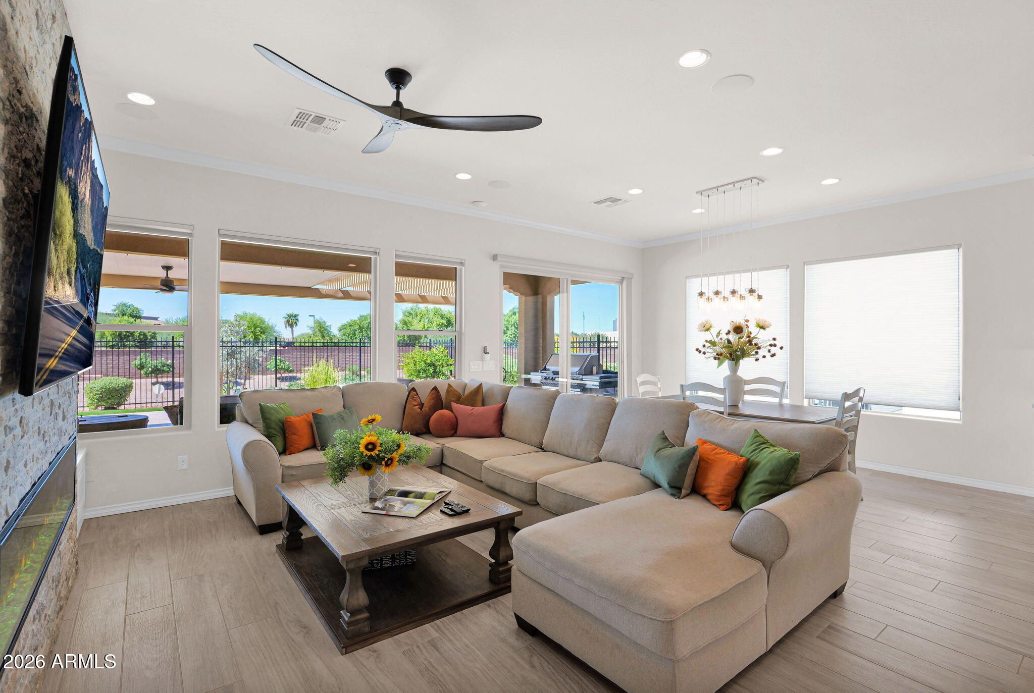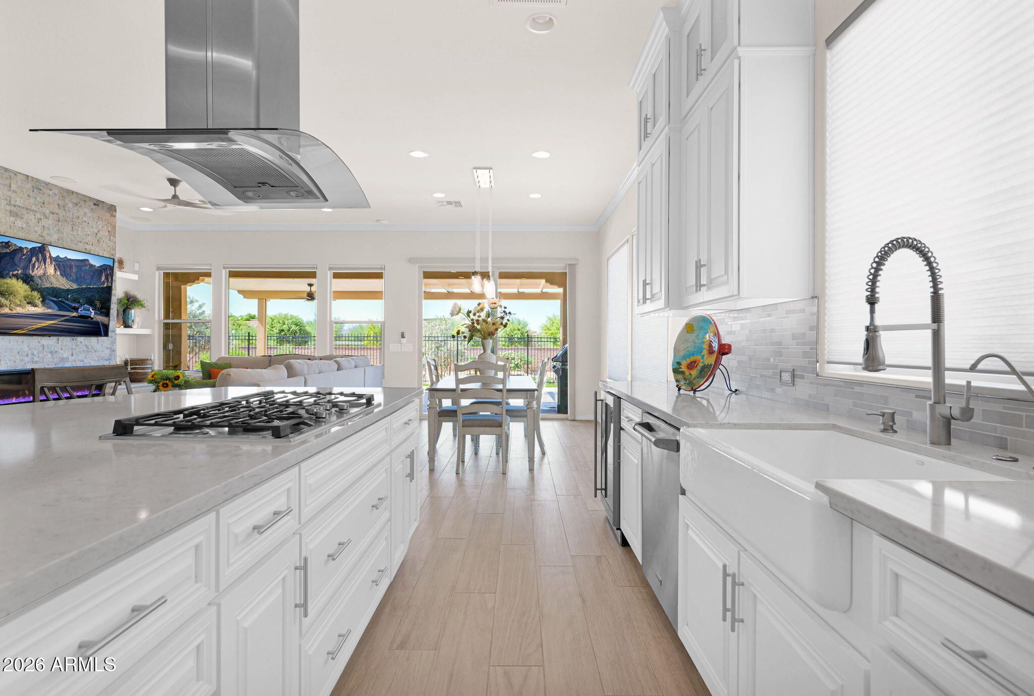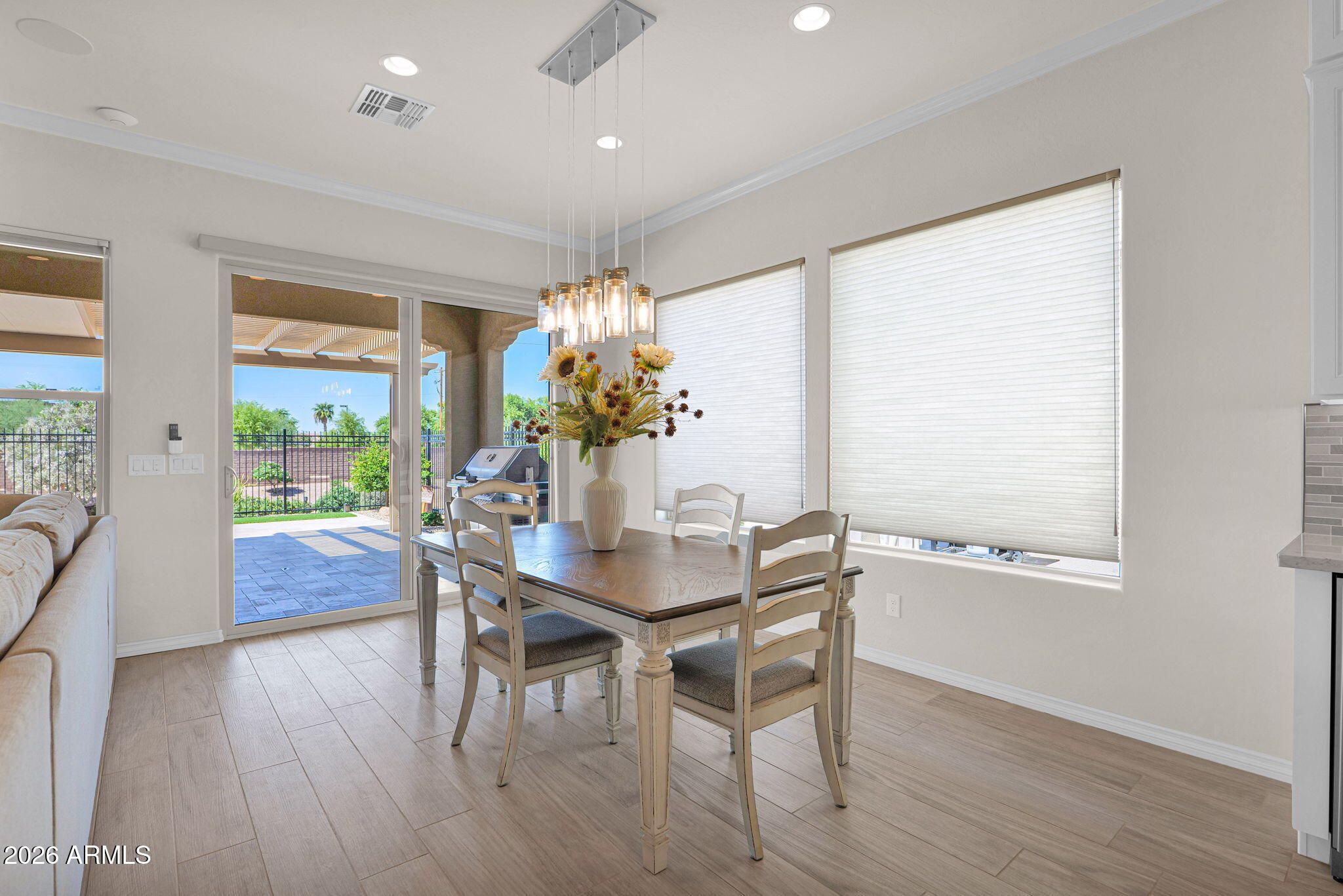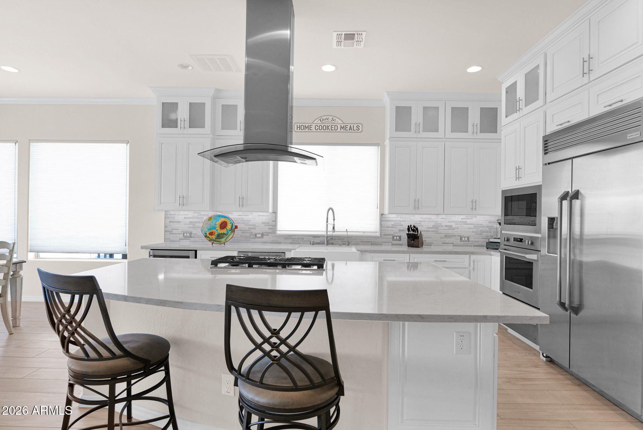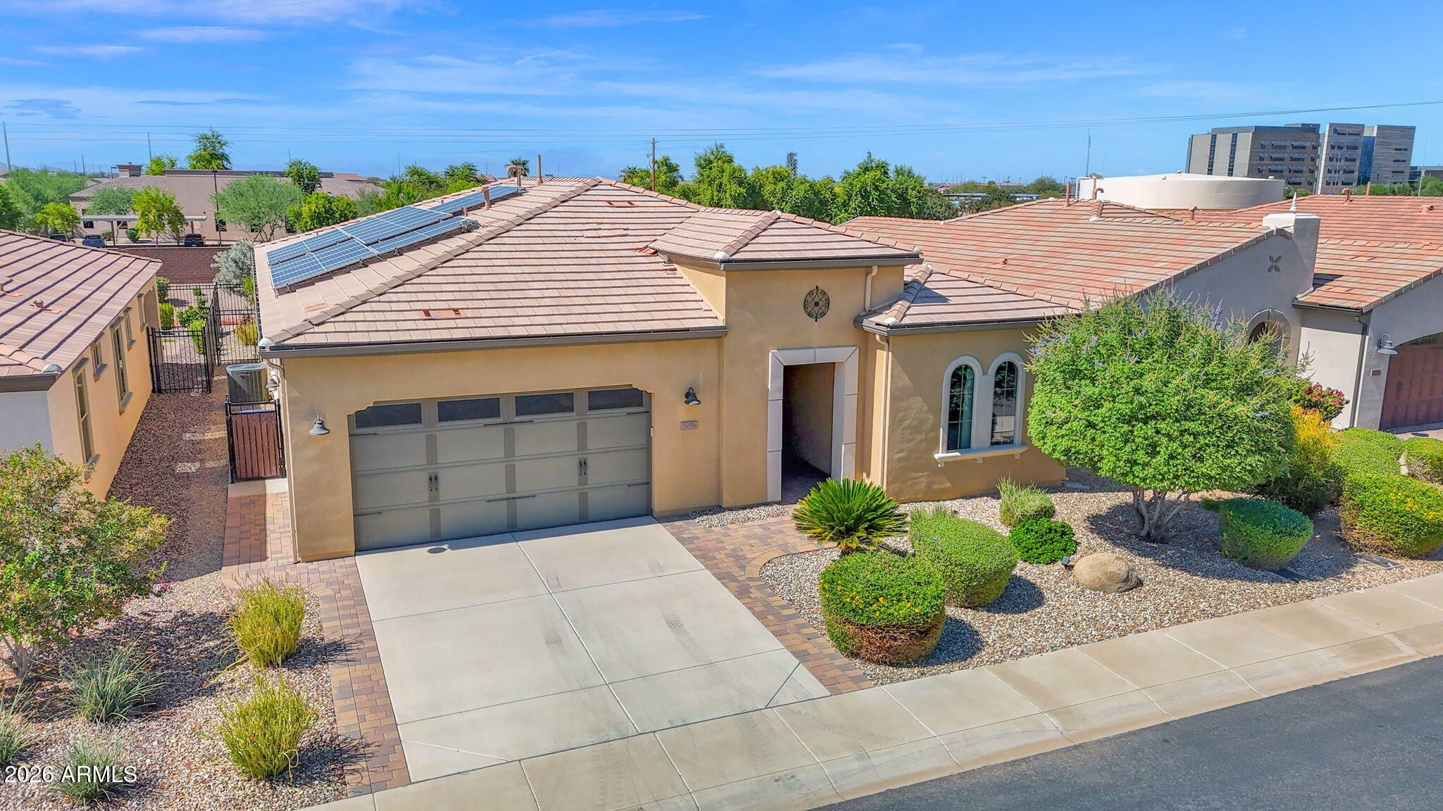 Discover the perfect blend of sophistication and resort-style living in this stunning Encanterra home featuring paid solar, custom cabinetry, and a rare climate-controlled wine room. The open-concept design showcases designer details throughout—wood-look tile flooring, crown molding, and a seamless flow between the gourmet kitchen, great room, and outdoor retreat. The chef's kitchen impresses with built-in stainless appliances, gas cooktop with vent hood, quartz counters, and an oversized island for casual dining and entertaining. The adjoining great room features a custom stone-accented wall with electric fireplace and views of the lush, low-maintenance backyard. Step outside to the covered patio with pergola extension and private fenced yard backing open space— the perfect setting to enjoy Arizona sunsets. Additional highlights include a tankless gas water heater, custom built-ins, and meticulously maintained landscaping. Every detail has been carefully curated for elegance, comfort, and energy efficiency. Experience the Encanterra lifestyle with world-class amenities, championship golf, restaurants, and social clubsall within a guard-gated community just minutes from Queen Creek's best shopping and dining.