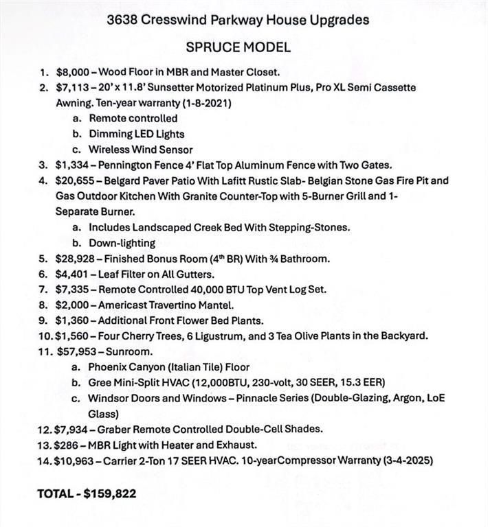 Offered at $820,000, this beautifully upgraded SPRUCE model plan offers 3,841-square-foot and is located in Cresswind at Lake Lanier, delivering refined living in North Georgia’s premier 55+ resort community. The residence features three bedrooms, three-and-a-half baths, and an expansive primary suite designed for comfort and privacy. A spacious bonus room adds flexibility for guests, hobbies, or office use. The gourmet kitchen showcases GE Profile appliances, abundant cabinetry, and an open flow ideal for entertaining. The adjacent family room features a 40,000 BTU remote-controlled fireplace, creating a warm and inviting centerpiece for everyday living. A true highlight is the four-seasons sunroom, equipped with Graber remote-controlled shades and a mini-split HVAC system, offering year-round comfort with effortless control. Outdoor living shines with a large patio, outdoor kitchen, and an impressive 80,000 BTU natural gas firepit, all complemented by a SunSetter remote-controlled awning for shade on demand. Interior upgrades include wood flooring, plantation shutters throughout, and an extended garage for added storage or workshop space. Residents of Cresswind enjoy access to a 42,000-square-foot clubhouse, indoor and outdoor pools, marina, tennis and pickleball courts, and a full calendar of lifestyle activities.