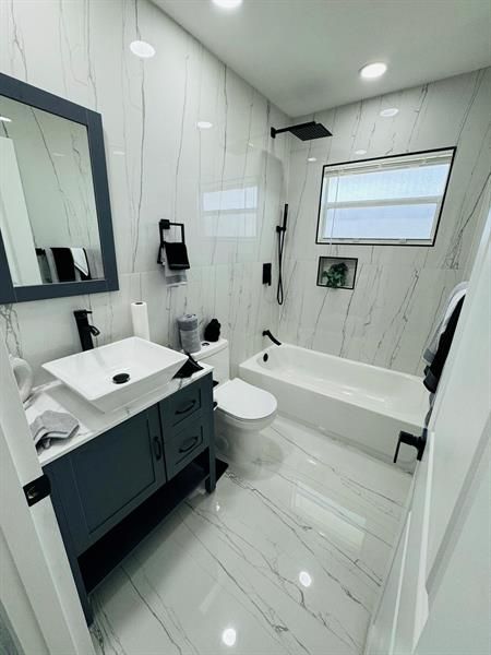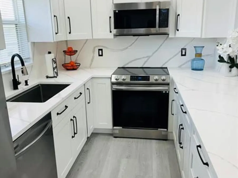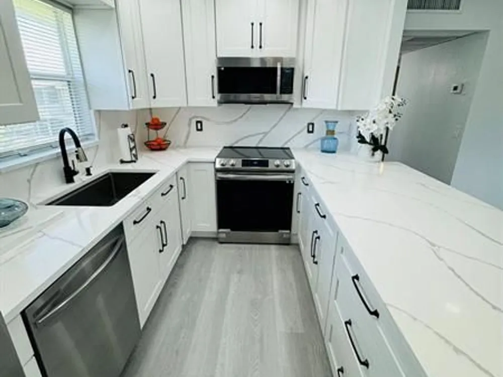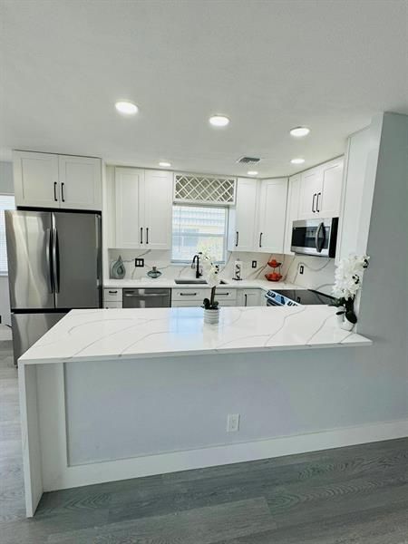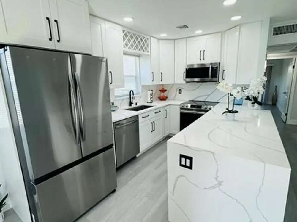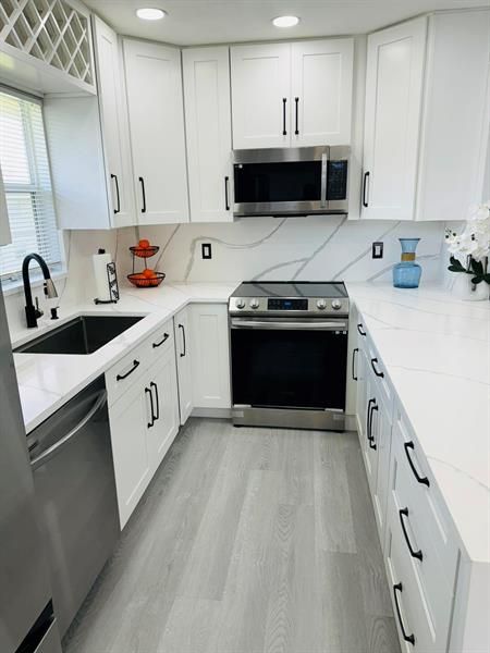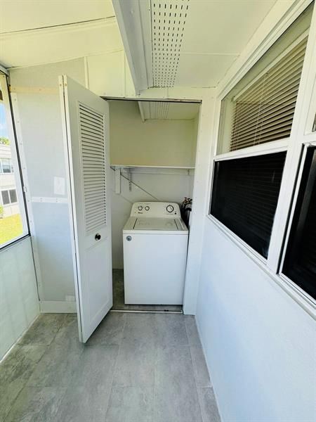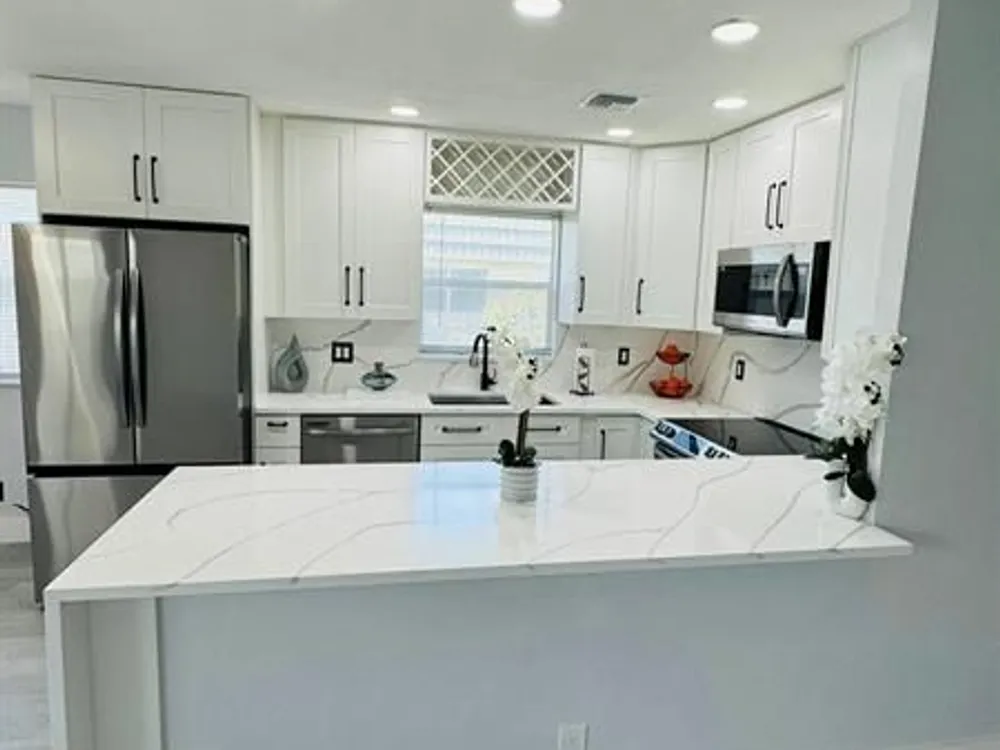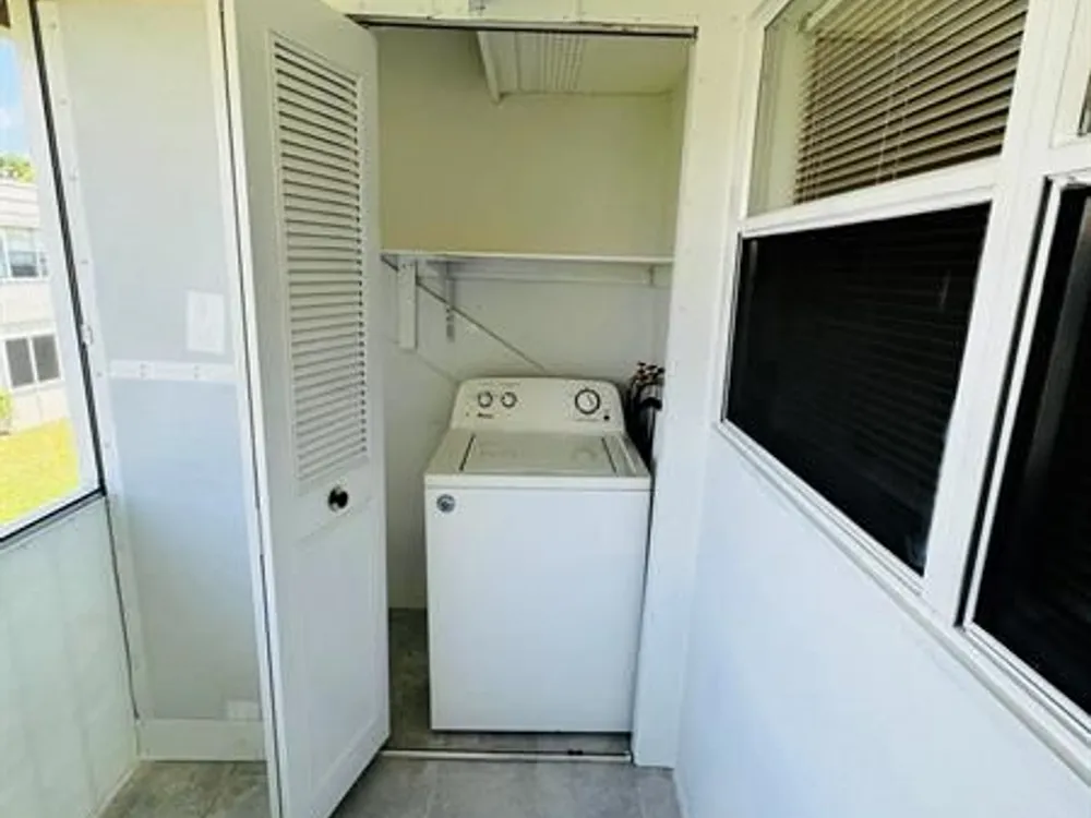 Discover your ideal home in a great 55+ community: luxurious 2-bed, 2-bath unit on the second floor. The kitchen is a culinary masterpiece with stainless-steel appliances, quartz countertops, and an inviting island. The open-concept design, enhanced by numerous windows, floods the space with natural light and offers stunning garden views. Enjoy modern bathrooms with frameless showers and rainfall systems. Fresh paint and new luxury vinyl floors create an elegant ambiance. Community perks include a clubhouse, indoor/outdoor pools, and tennis courts. This move-in ready home features a 2020 AC, a new 2024 water heater, and includes a washer and dryer. Conveniently, the pool and dumpster are just steps away. Virtual rendering in the unit, the property is unfurnished.