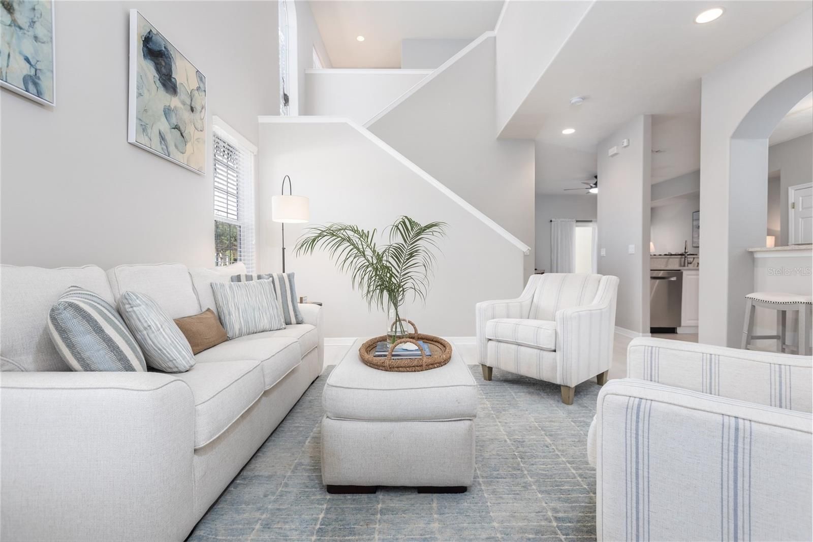 Welcome Home to Parkside Townhomes in Venetian Bay! Turn-key, well loved and meticulously maintained 2BR 2.5BA with attached 2 car garage. This is an END Unit Townhome therefore allowing tons of natural light thru out! Located just a stone’s throw away from the beautiful private Community Pool plus you will enjoy the peaceful pond view and fountain from your comfortable large covered front porch. Another fabulous feature about this home is you can park at your front door OR your garage in the back! Spacious 1,664 sq ft under air, downstairs is your Living room plus a sitting Room, separate dining area, beautiful spacious kitchen with Corian counter tops, stainless appliances and breakfast bar, a convenient downstairs half bath, storage closet, Laundry room with Washer & Dryer and utility sink plus a small private paver patio off living room sliders. Both bedrooms are upstairs and both have en-suite bathrooms! Also upstairs is a sunny nook that could be used as office space / study, etc. Enjoy the maintenance free lifestyle where lawncare is included too. NEW ROOF in 2025 for peace of mind. Just around the corner is the Venetian Bay Town Center, which boasts a spa, fitness center, restaurant, general grocery store and coffee shop/bistro too! Golf enthusiasts can become a member of the Club at Venetian Bay golf course, 18 hole course. Venetian Bay also features an optional additional membership for the new updated Tiki Cove Community Pool. This also features a Tiki Bar/Restaurant, that you can use anytime! Features social activities, live music and more! Come enjoy all of the resort like amenities! Home located approx 10 miles to the Beach and all that New Smyrna Beach has to offer.