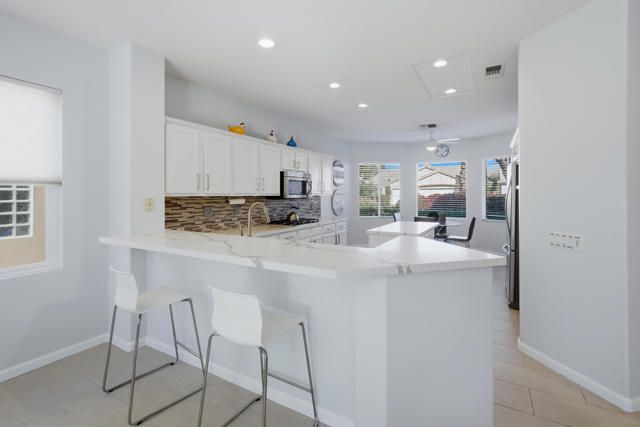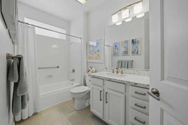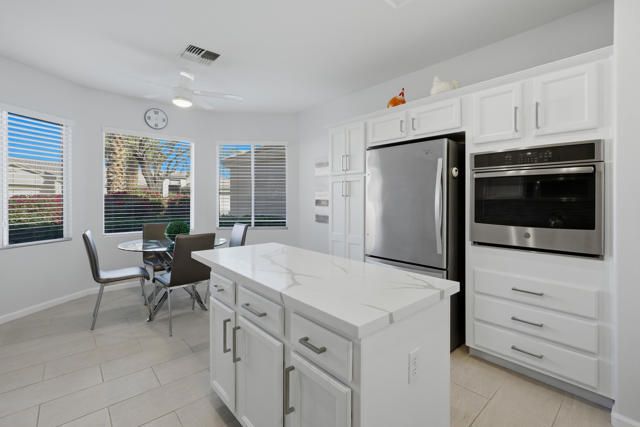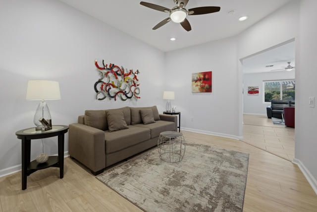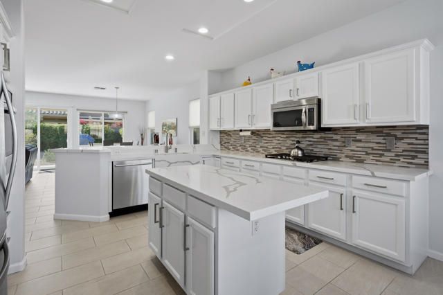 Sun City Palm Desert - St. Croix. Sun City's most popular floorplan, this beautifully maintained St. Croix offers exceptional space, upgrades, and an ideal location just around the corner from the Sunset View Clubhouse. Offered furnished, outside escrow and featuring 2 bedrooms, 2 bathrooms, a den, a bonus office/hobby room, and an extended 2-car plus golf cart garage, this home delivers both comfort and flexibility. The private rear yard is enhanced by mature desert landscaping and a spacious patio--perfect for relaxing or entertaining. Inside, the home showcases an updated paint scheme, upgraded baseboards, and 12'' x 24'' tile laid on the offset throughout the main living areas, with vinyl plank flooring in the living room, den, hobby room, and bedrooms. The kitchen is well appointed with recessed lighting, quartz countertops, a breakfast bar, chef's island, stainless steel appliances including a wall oven, and ample storage--ideal for everyday living or hosting guests. The great room opens to a versatile den, with a pocket door leading to the office/hobby room for added privacy. The primary suite features a door to the rear patio, a generous walk-in closet, and an upgraded en-suite bathroom with granite counters, updated vanity, fixtures, lighting, and a stall shower with tile surround and rimless glass doors. The guest bathroom has also been upgraded with granite counters, modern fixtures, and lighting. Additional highlights include an interior laundry room, newer water heater, extended garage with space for a golf cart, and a majority of windows upgraded to vinyl. AC new 2019. Water heater new 2023. Offered furnished outside of escrow, this home is move-in ready and perfectly suited for enjoying the Sun City lifestyle.