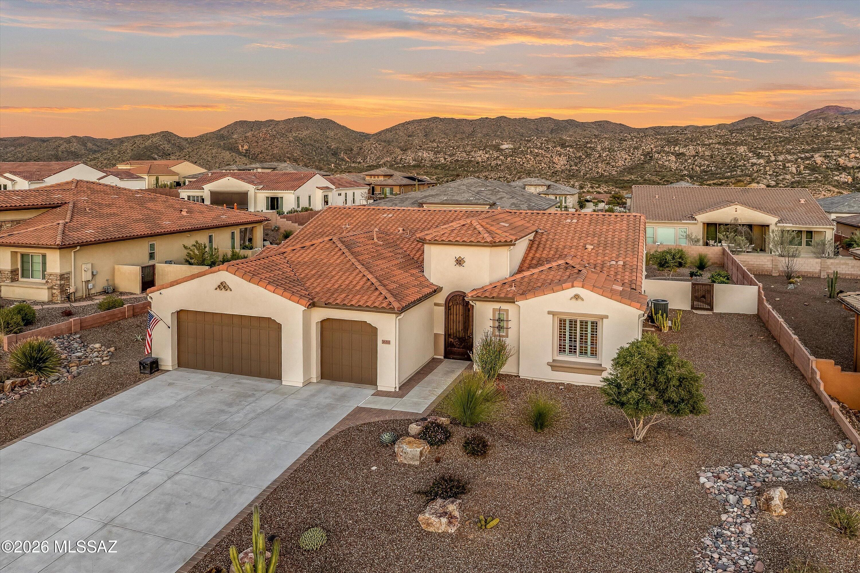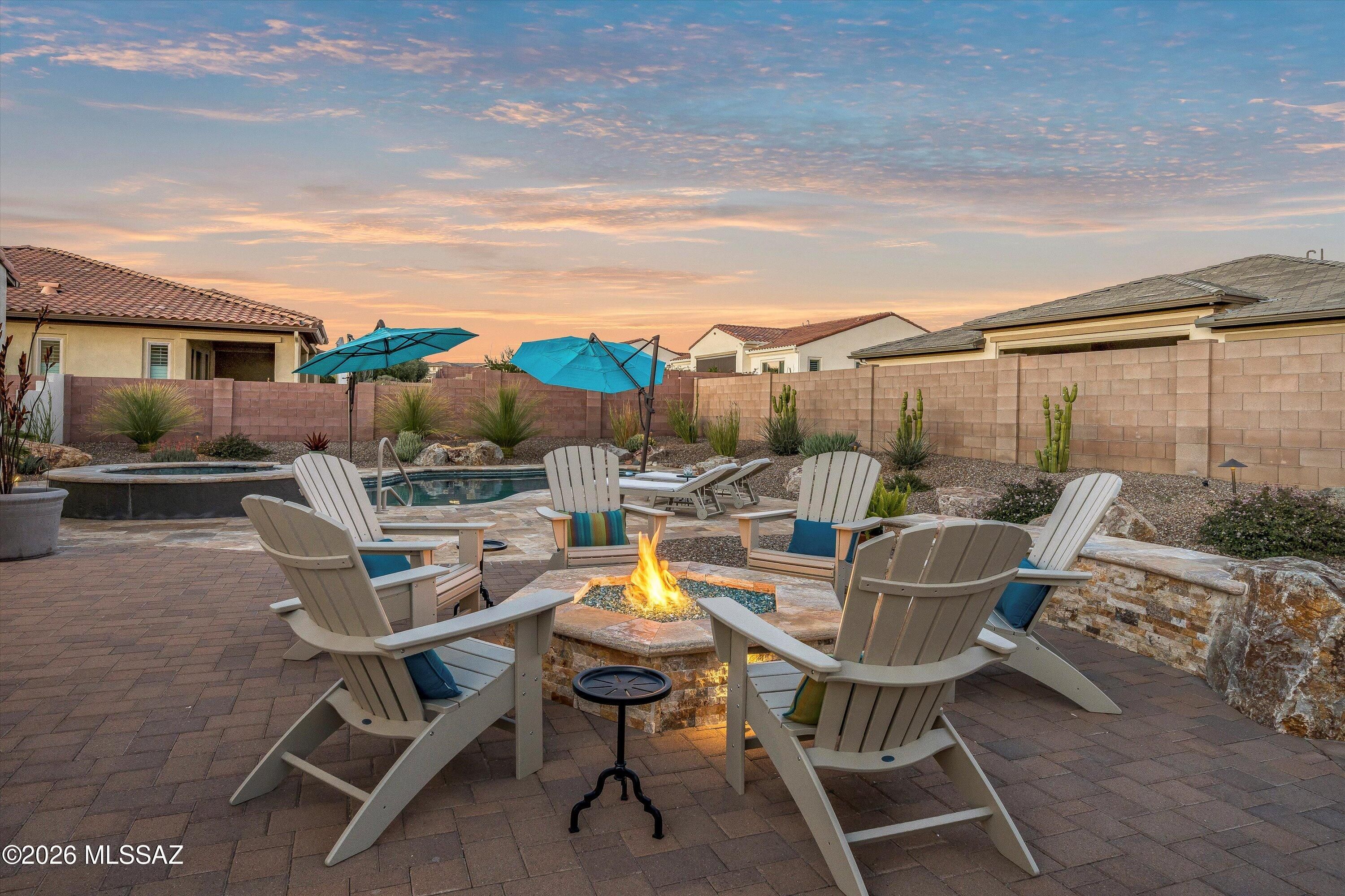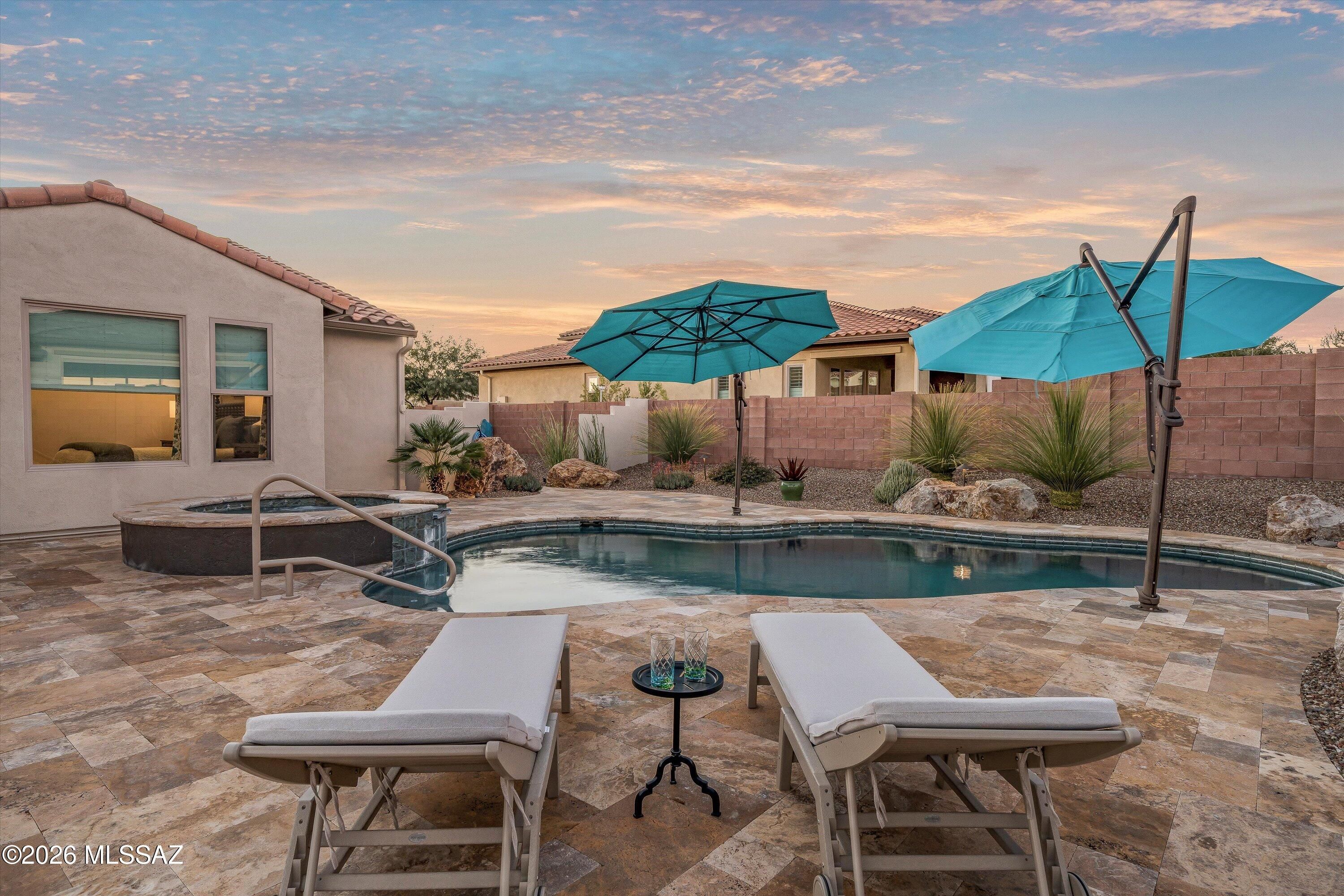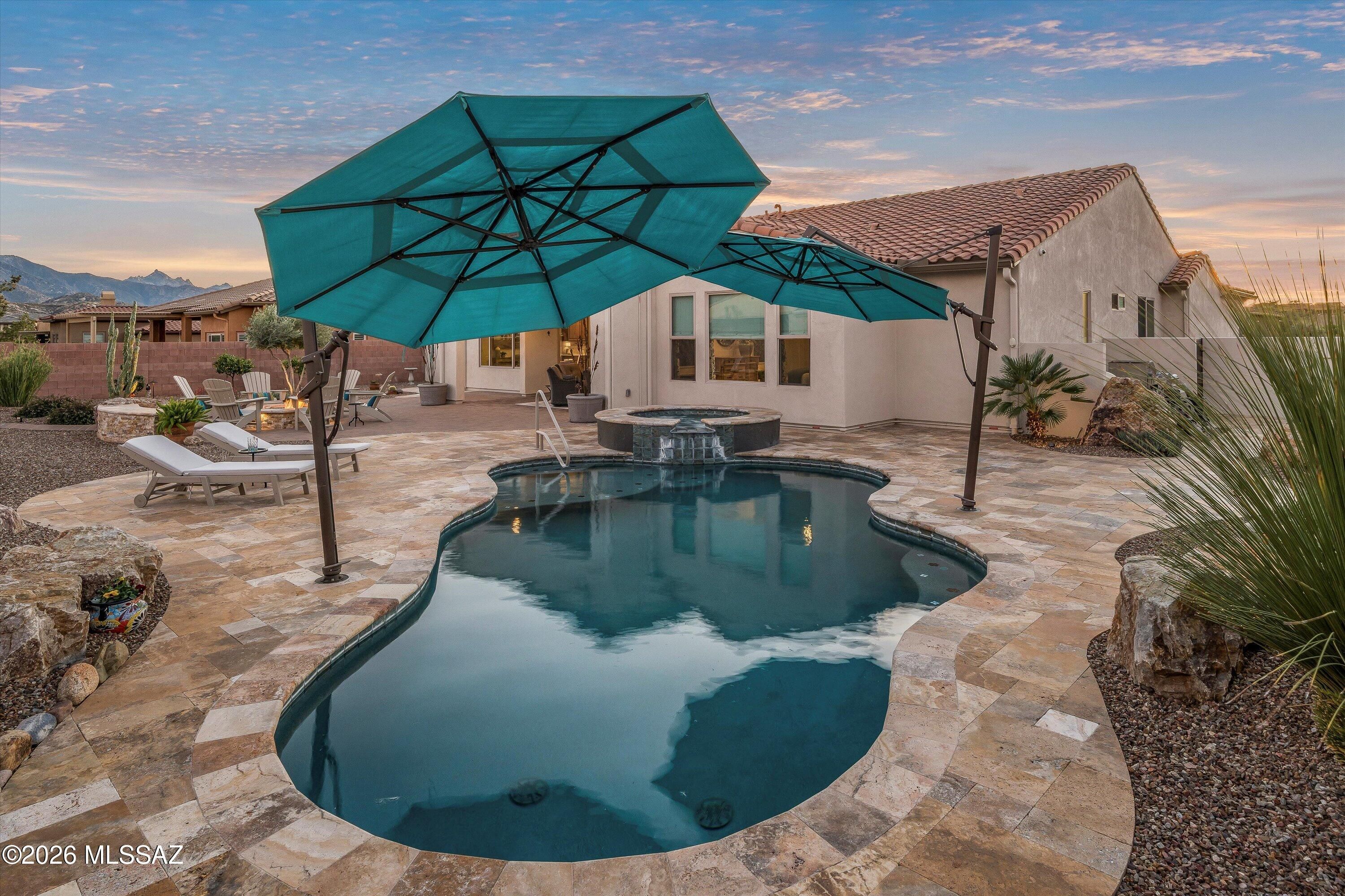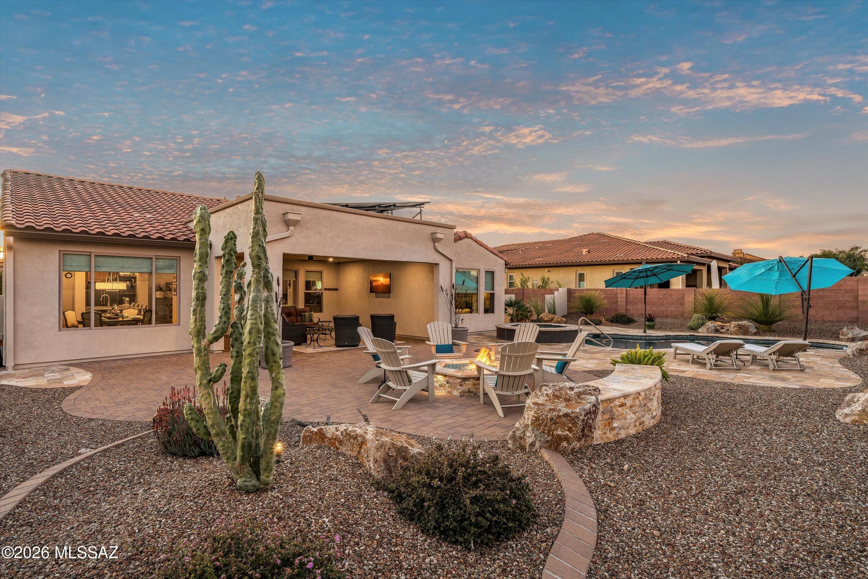 Located in The Preserve at SaddleBrooke, this refined Paloma model offers exceptional indoor and outdoor living on a spacious lot with a true resort-style setting. The backyard is designed for entertaining and relaxation, featuring a pool and spa with attached umbrellas and gas heater (2021), gas firepit, multiple patio seating areas, an extended covered patio with TV, and dramatic outdoor lighting. Inside, the home showcases a bright great room layout with kitchen, living, and dining spaces flowing seamlessly together beneath high ceilings and large Milgard windows. The chef's kitchen is highlighted by black slate Cafe appliances, a custom vent hood (gas range), stylish backsplash and a custom pantry. Two bedrooms feature private ensuites, complemented by a stylish updated powder room.