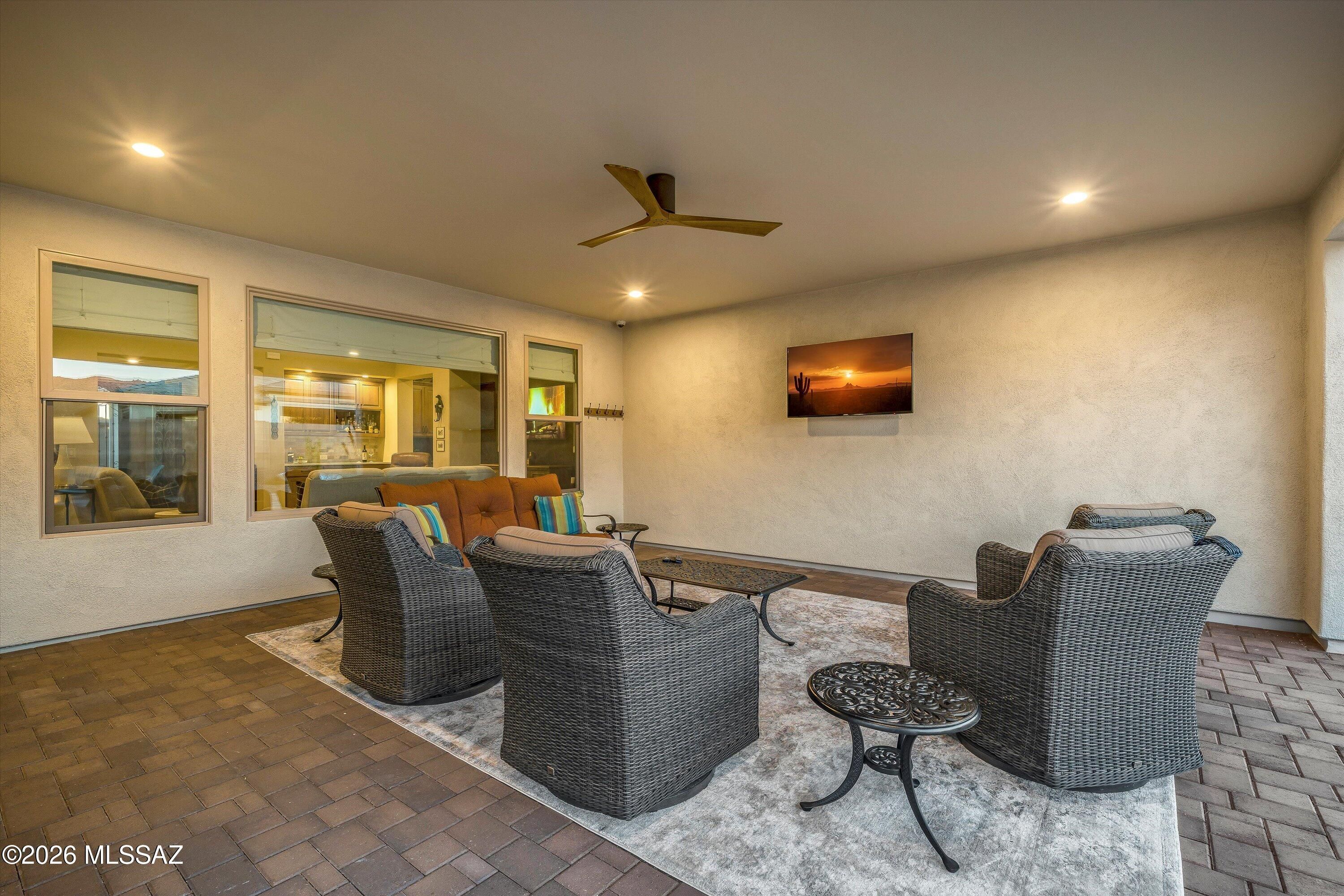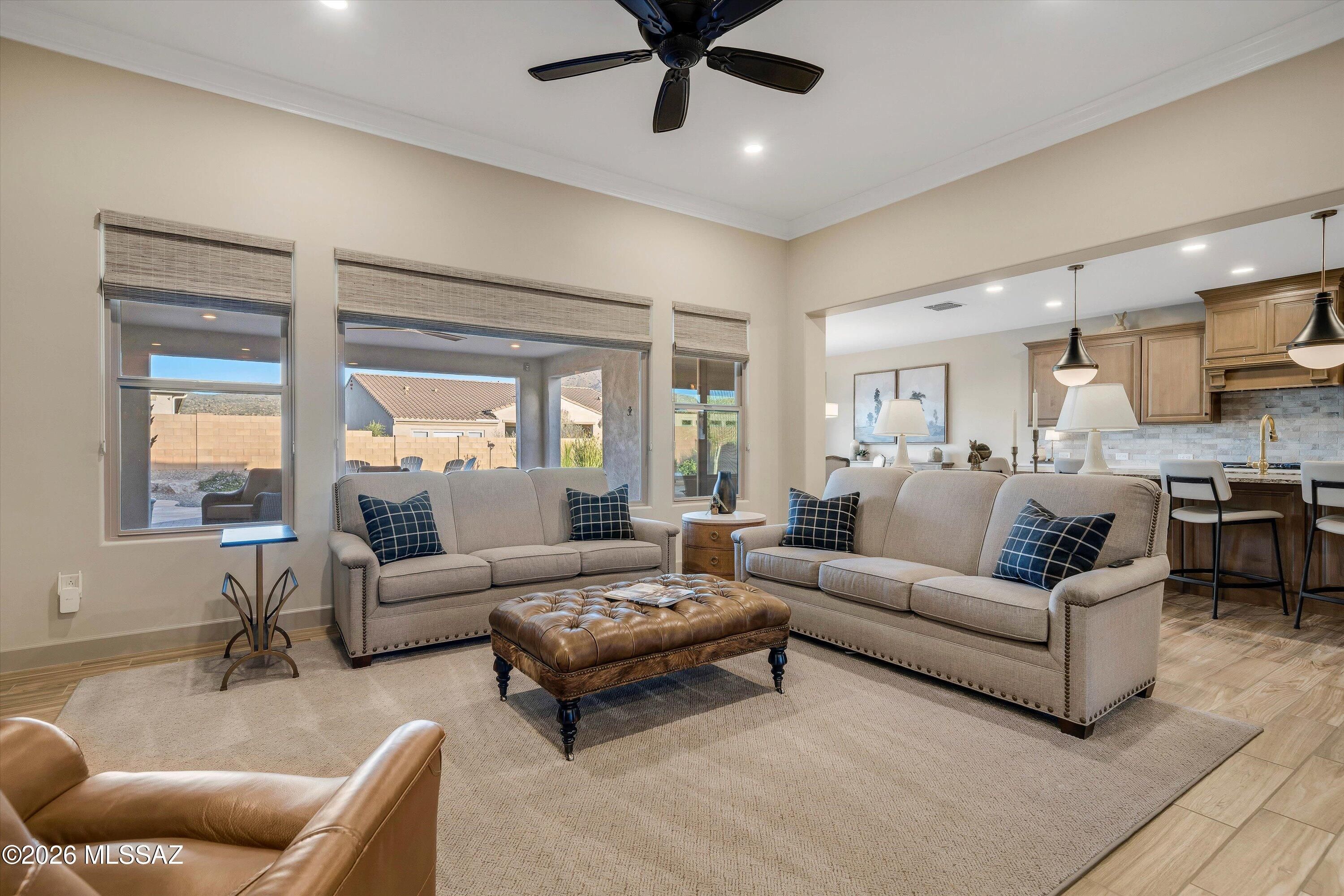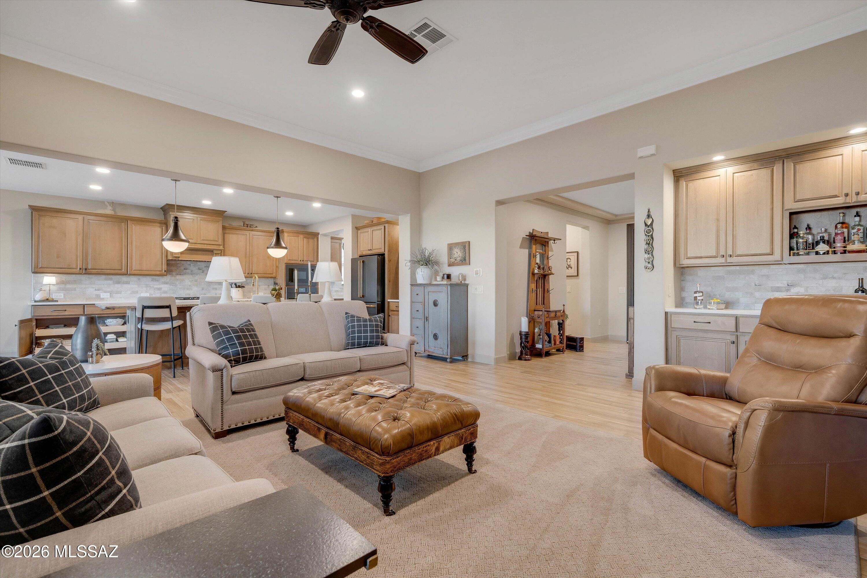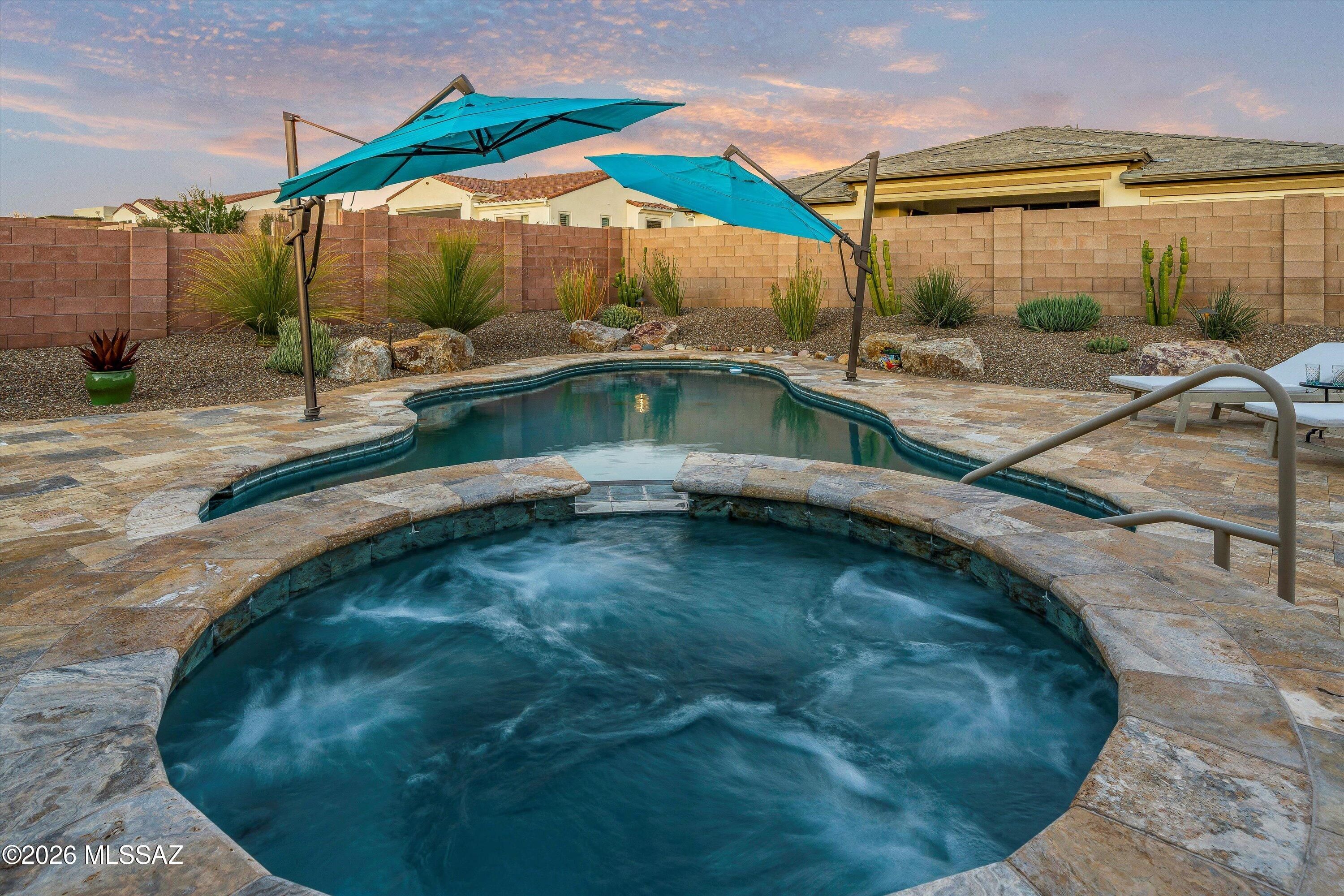 Located in The Preserve at SaddleBrooke, this refined Paloma model offers exceptional indoor and outdoor living on a spacious lot with a true resort-style setting. The backyard is designed for entertaining and relaxation, featuring a pool and spa with attached umbrellas and gas heater (2021), gas firepit, multiple patio seating areas, an extended covered patio with TV, and dramatic outdoor lighting. Inside, the home showcases a bright great room layout with kitchen, living, and dining spaces flowing seamlessly together beneath high ceilings and large Milgard windows. The chef's kitchen is highlighted by black slate Cafe appliances, a custom vent hood (gas range), stylish backsplash and a custom pantry. Two bedrooms feature private ensuites, complemented by a stylish updated powder room.