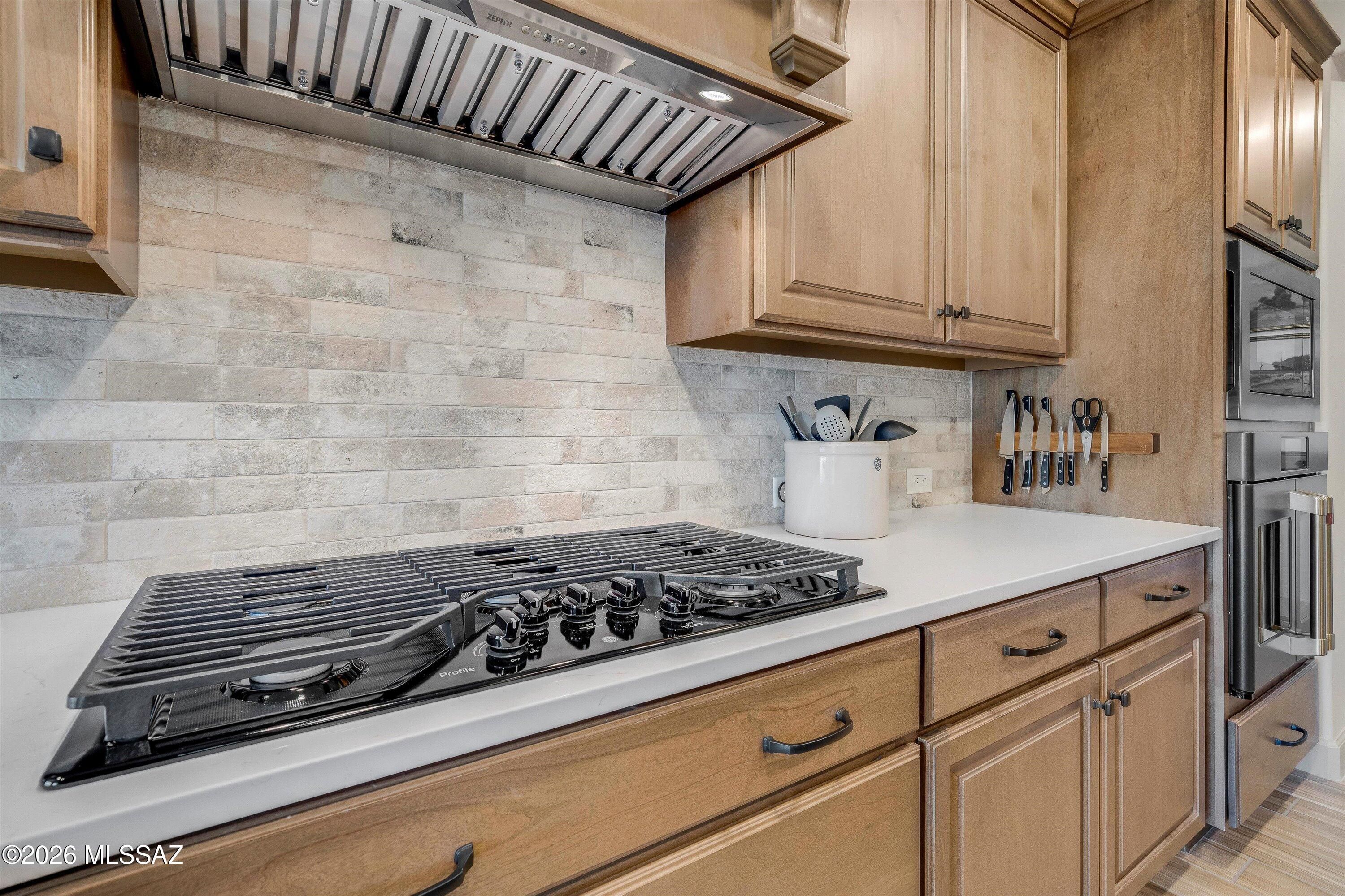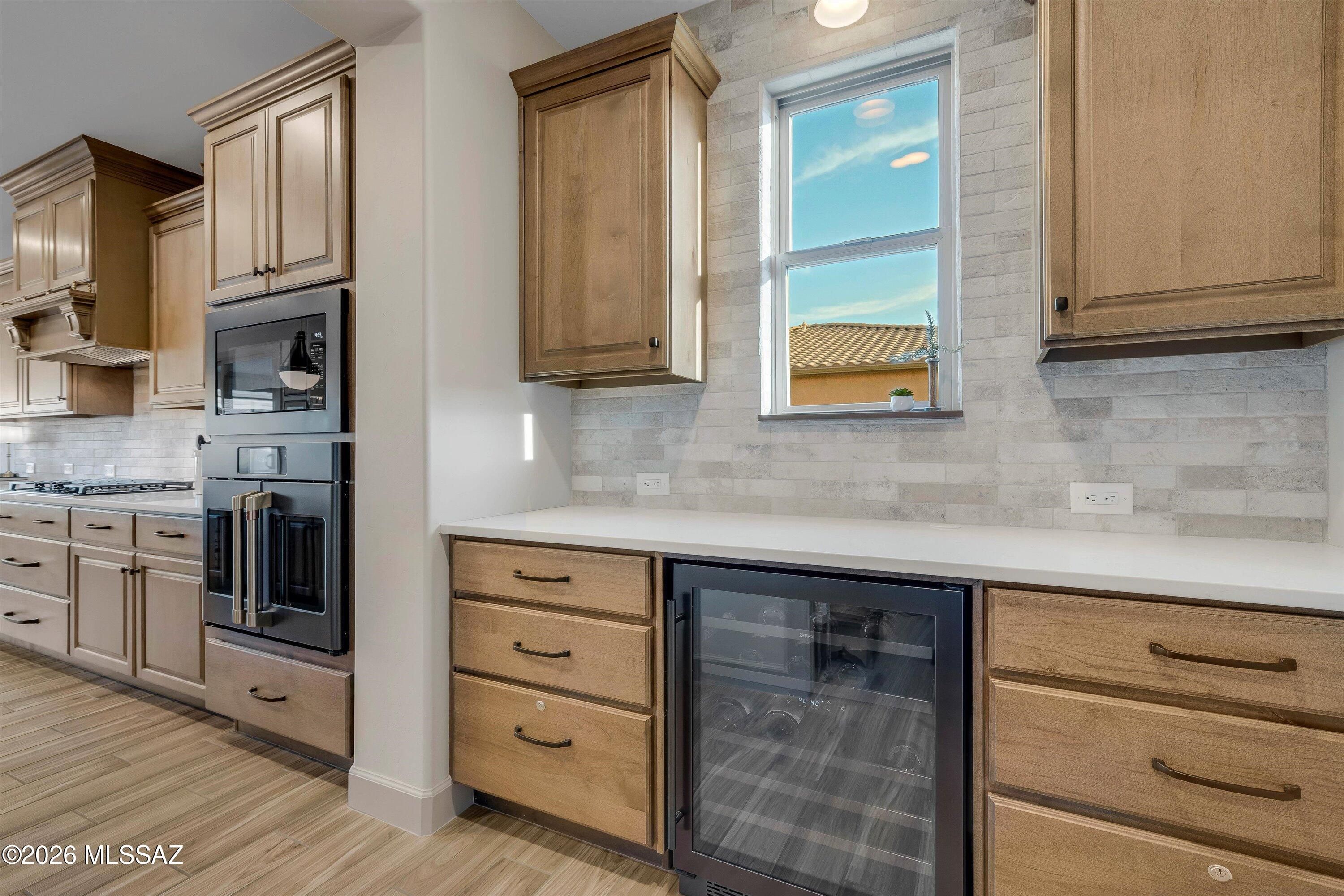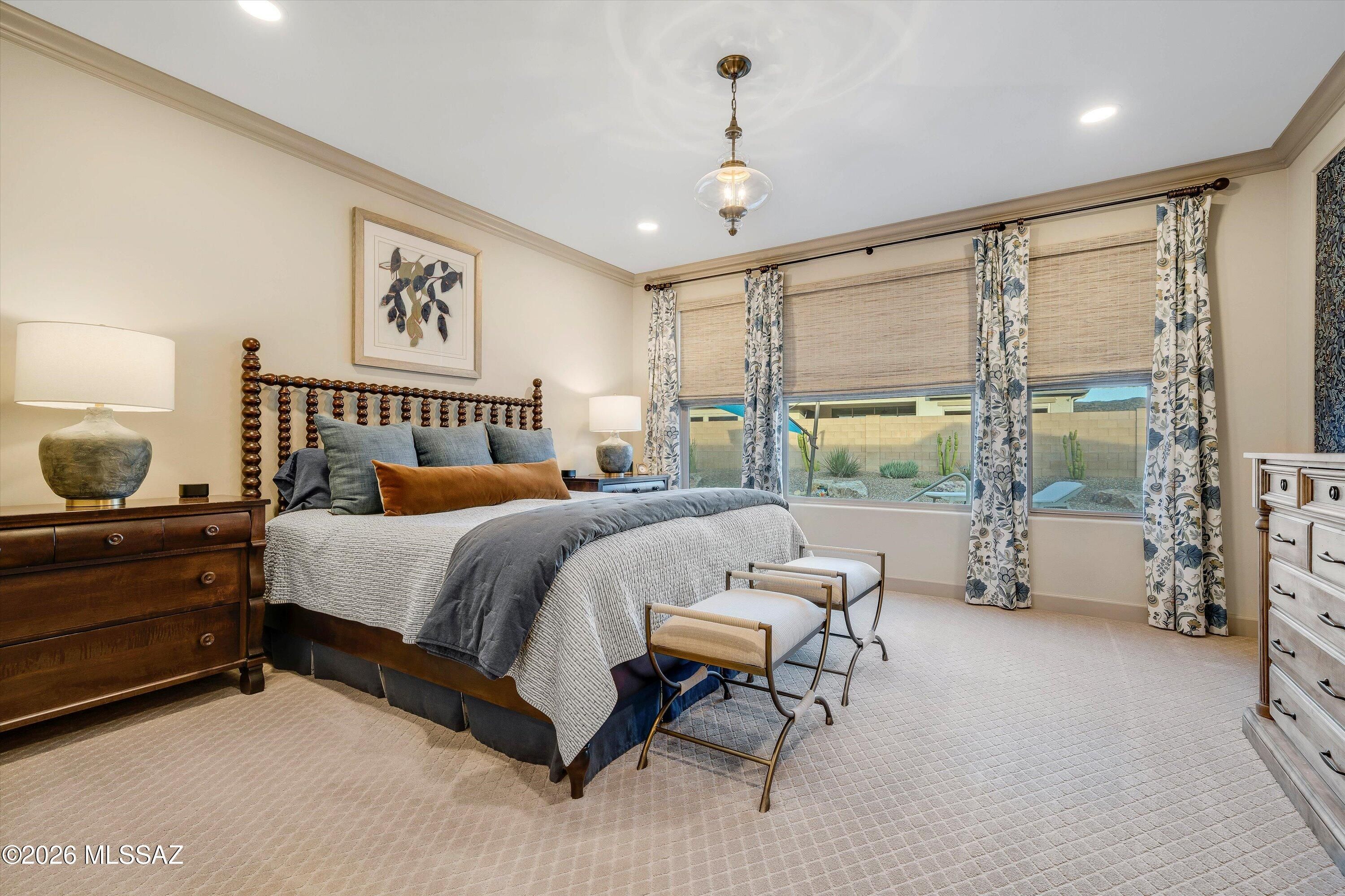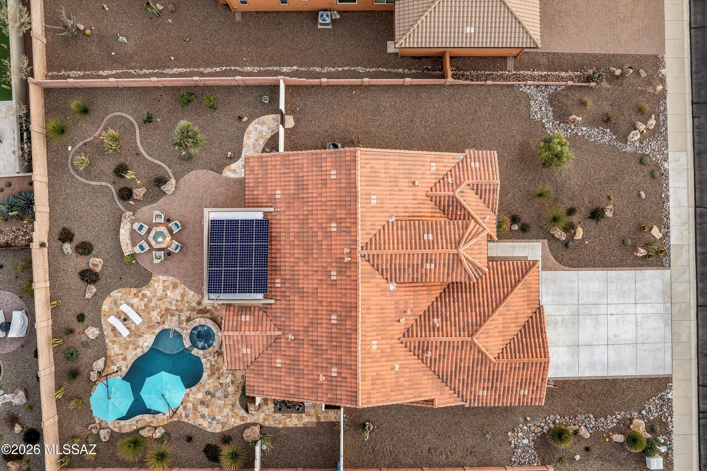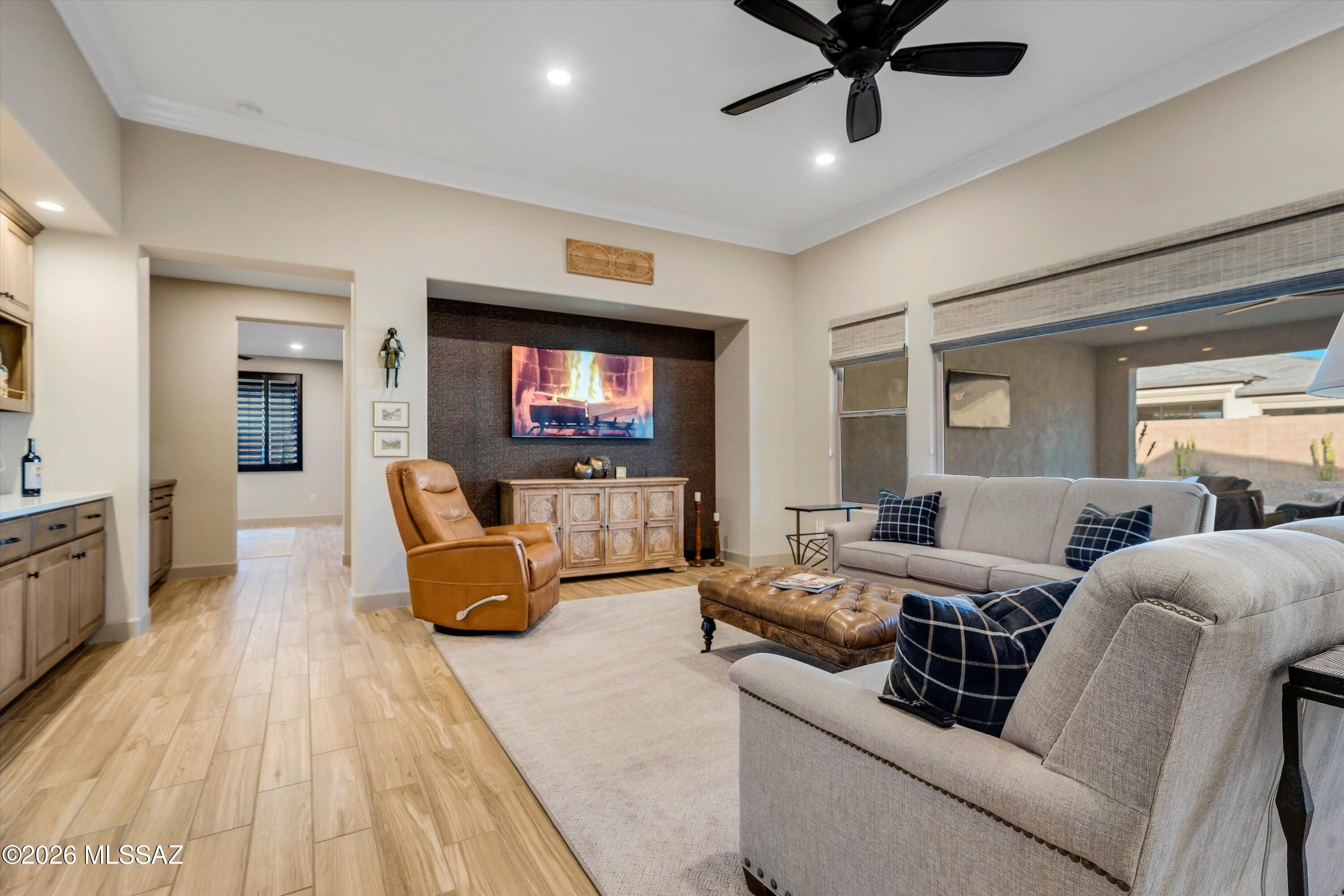 Located in The Preserve at SaddleBrooke, this refined Paloma model offers exceptional indoor and outdoor living on a spacious lot with a true resort-style setting. The backyard is designed for entertaining and relaxation, featuring a pool and spa with attached umbrellas and gas heater (2021), gas firepit, multiple patio seating areas, an extended covered patio with TV, and dramatic outdoor lighting. Inside, the home showcases a bright great room layout with kitchen, living, and dining spaces flowing seamlessly together beneath high ceilings and large Milgard windows. The chef's kitchen is highlighted by black slate Cafe appliances, a custom vent hood (gas range), stylish backsplash and a custom pantry. Two bedrooms feature private ensuites, complemented by a stylish updated powder room.
