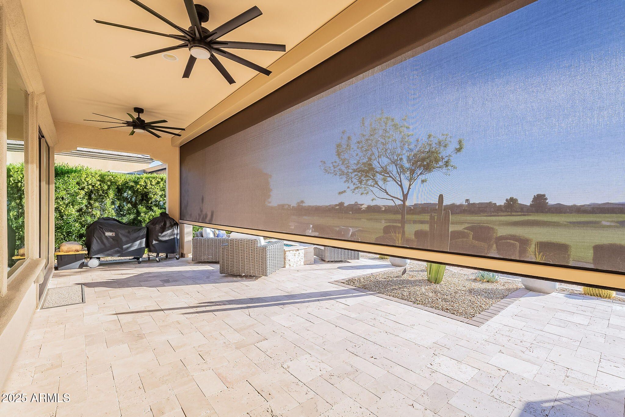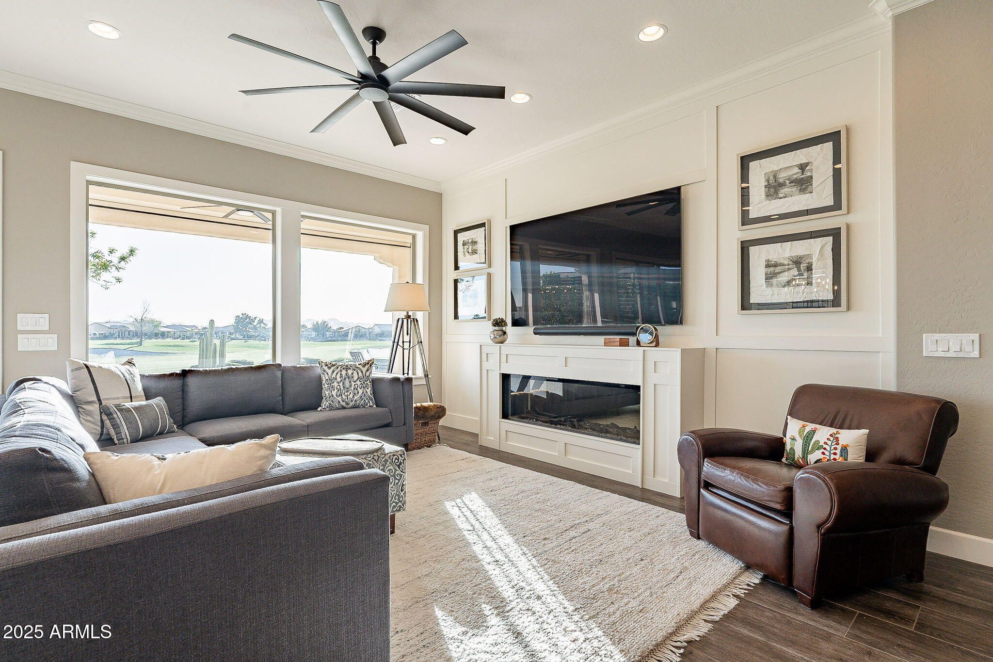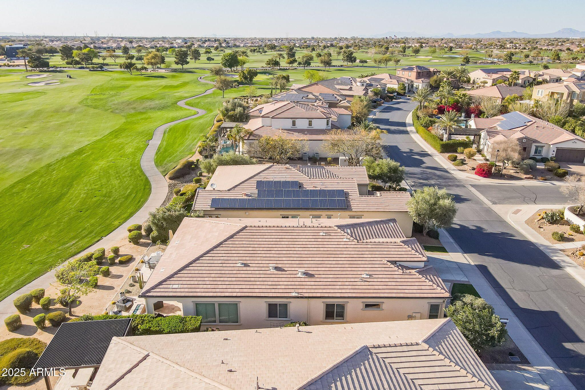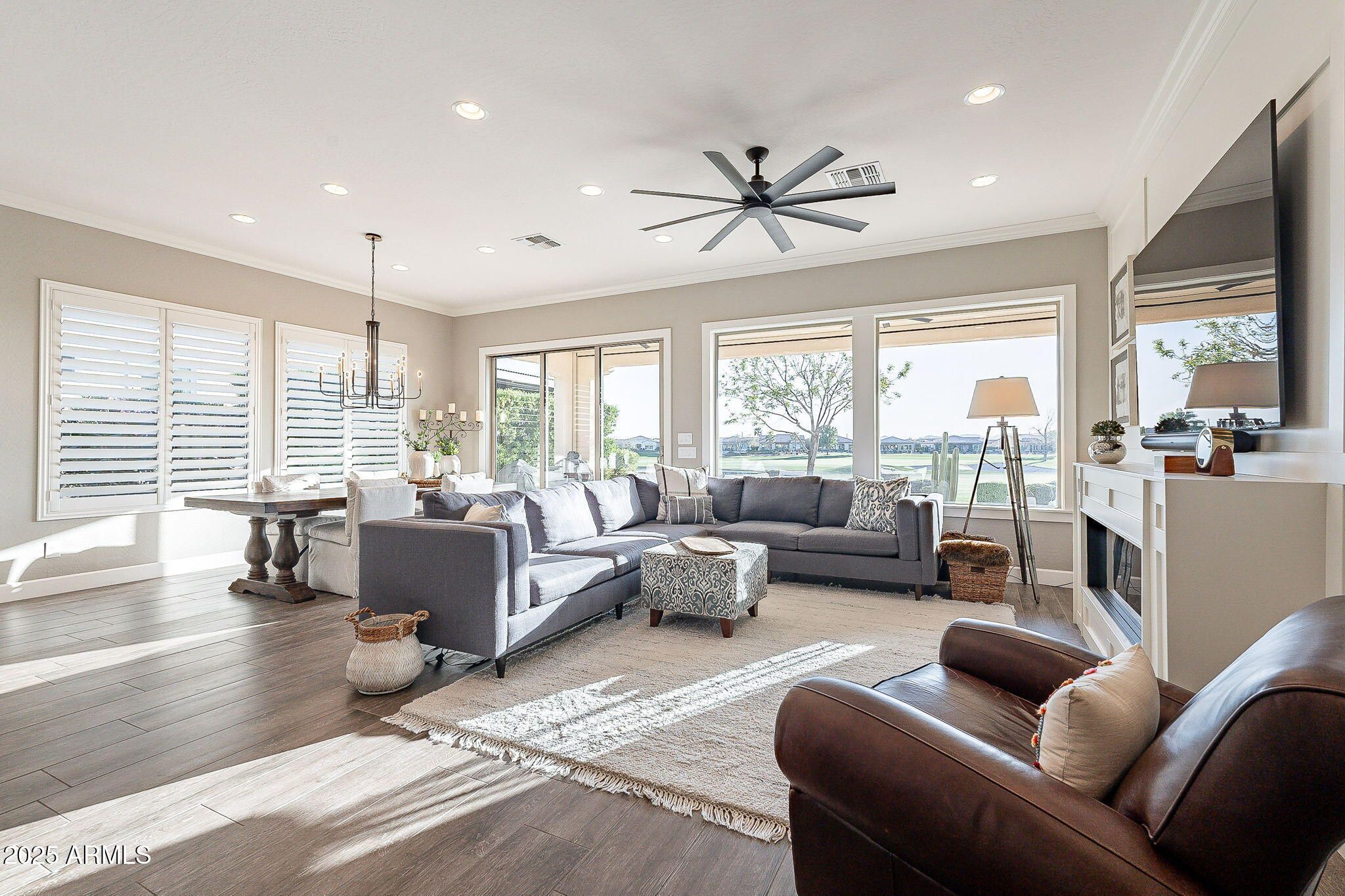 Welcome to this stunning Chroma floor plan on the golf course.. Enjoy a SW facing view & sunsets across two fairways, a lake, and the San Tan Mountains. Open great room floor plan includes oversized sliding doors leading to a fully landscaped private yard; gas fire pit; and automated sunscreen for casual outdoor living. Custom wainscoting; plantation shutters; built in bookcases, and premium gourmet kitchen complete the great room. With two dedicated bedrooms; a ''hidden room'' den and separate office, there's plenty of space for work and guests! Oversized laundry includes home office ''smart'' space. Tansferable golf membership assures option to purchase and no wait list. Enjoy two clubhouses; pools; fitness center; restaurants, spa in this active community.