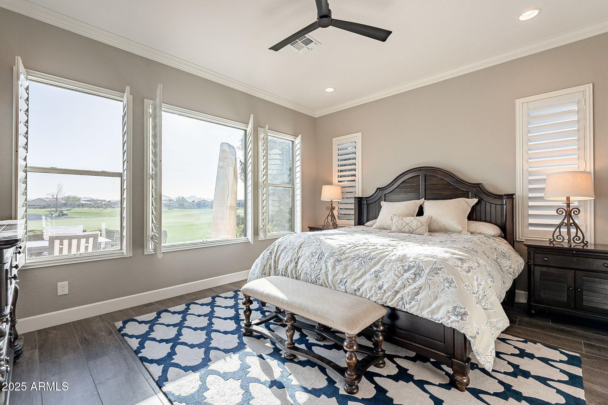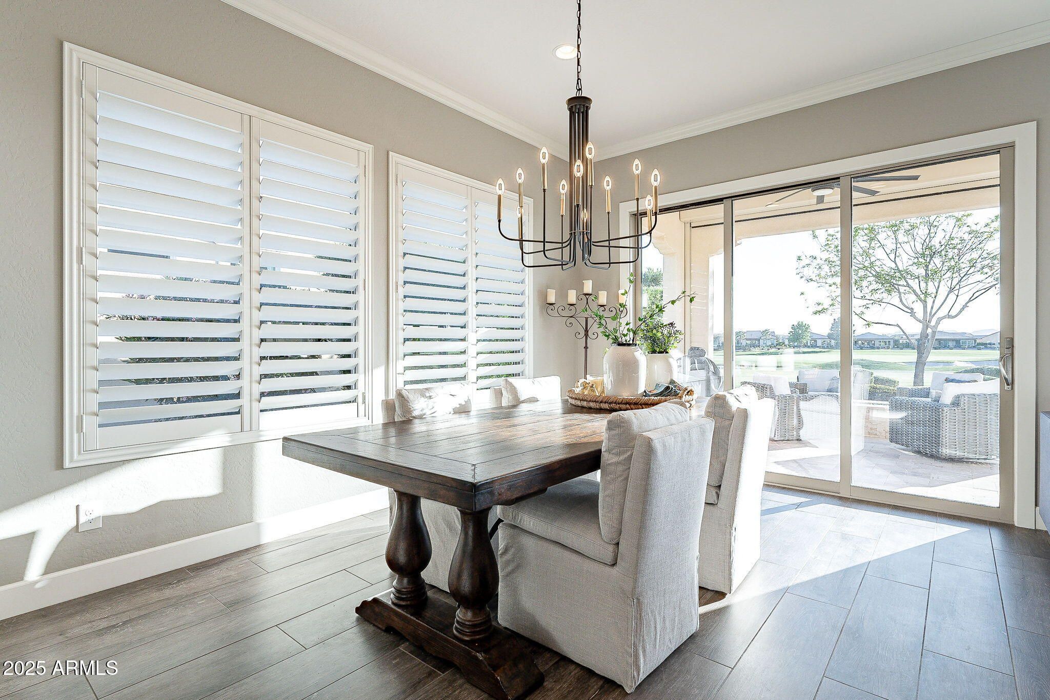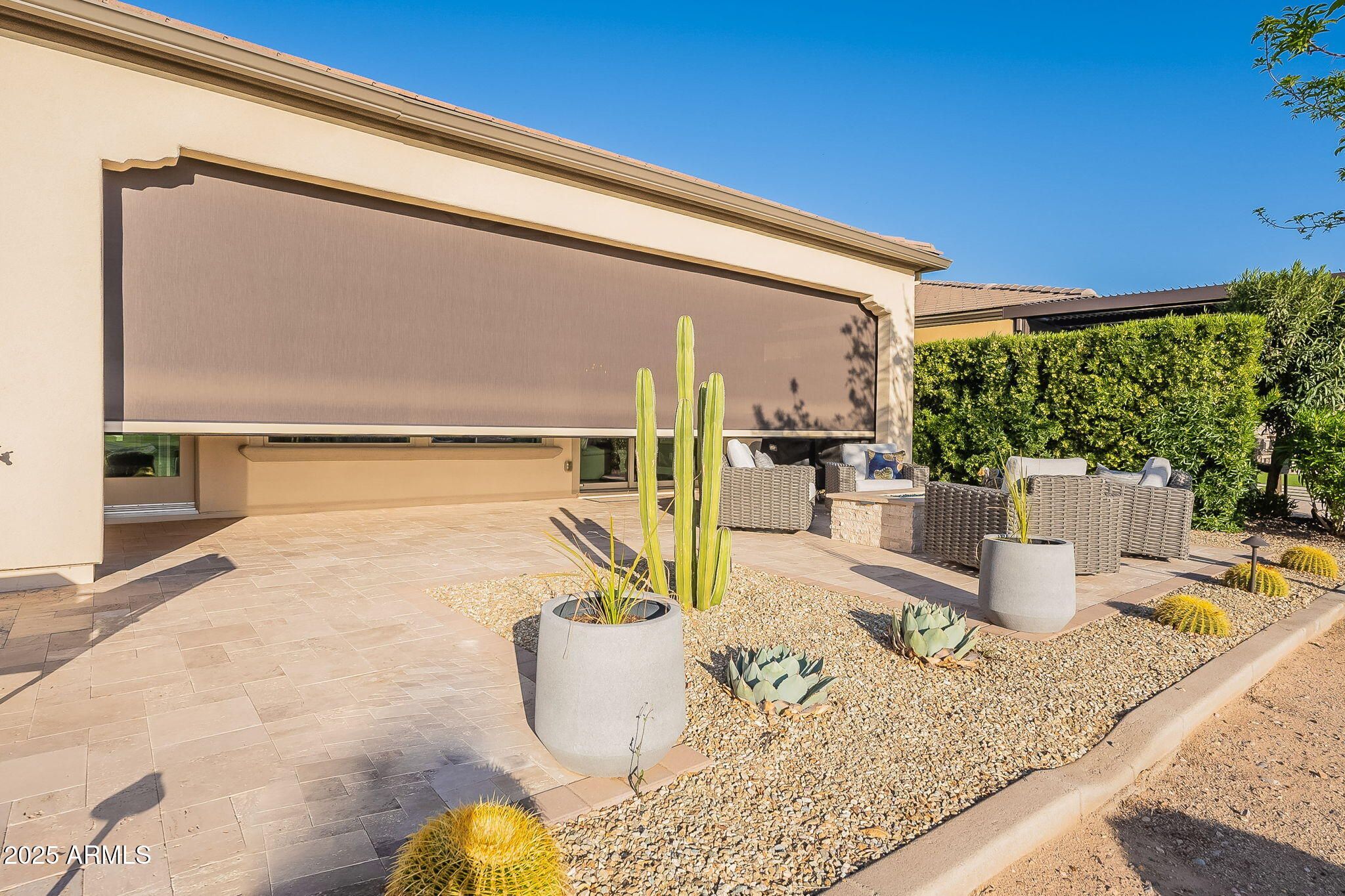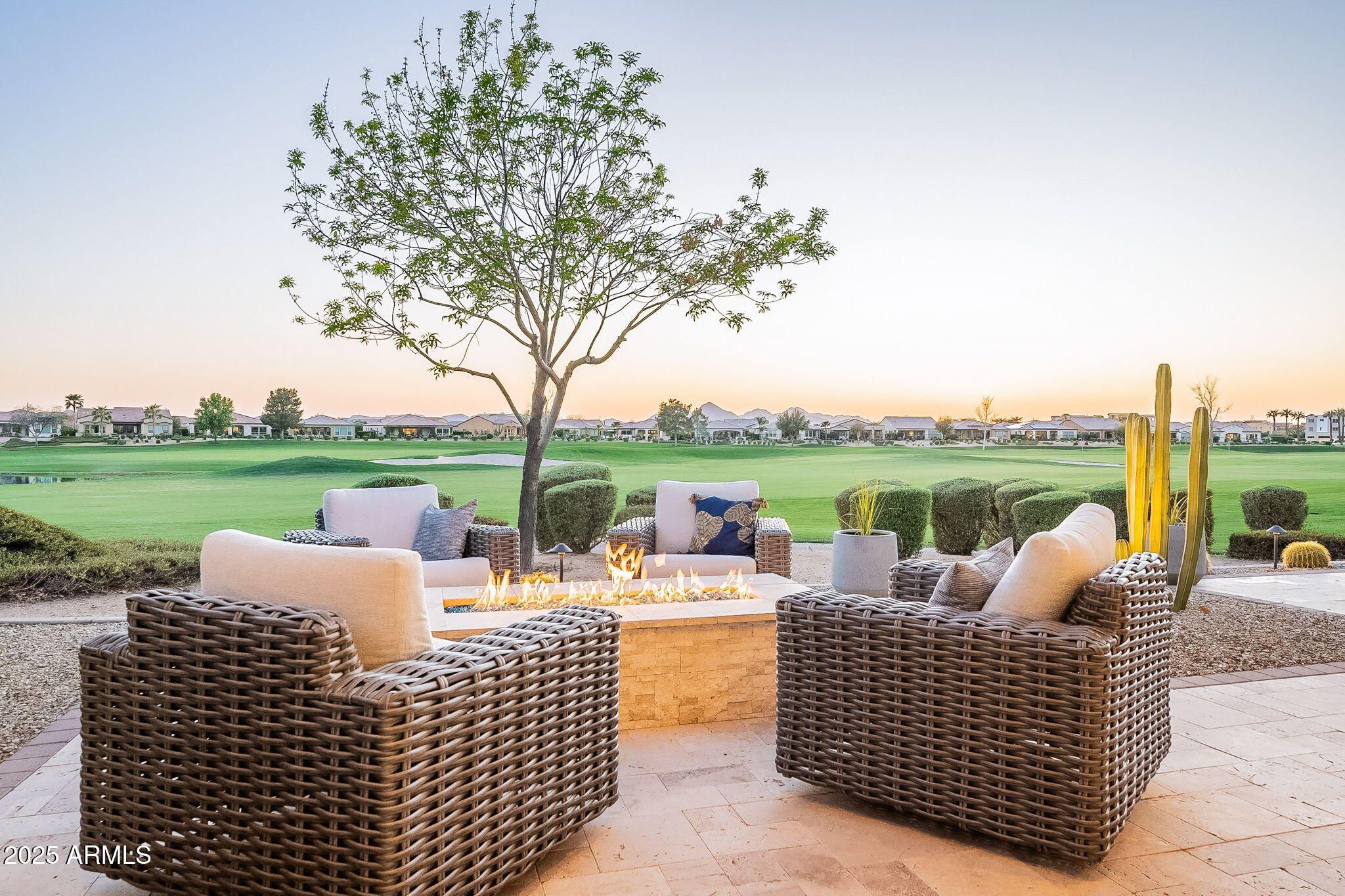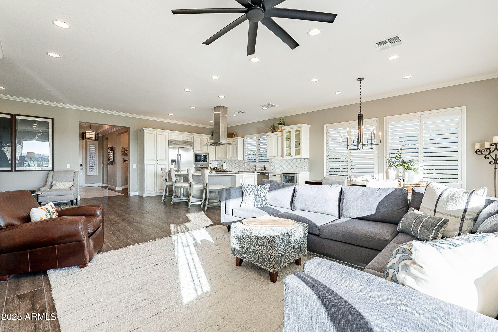 Welcome to this stunning Chroma floor plan on the golf course.. Enjoy a SW facing view & sunsets across two fairways, a lake, and the San Tan Mountains. Open great room floor plan includes oversized sliding doors leading to a fully landscaped private yard; gas fire pit; and automated sunscreen for casual outdoor living. Custom wainscoting; plantation shutters; built in bookcases, and premium gourmet kitchen complete the great room. With two dedicated bedrooms; a ''hidden room'' den and separate office, there's plenty of space for work and guests! Oversized laundry includes home office ''smart'' space. Tansferable golf membership assures option to purchase and no wait list. Enjoy two clubhouses; pools; fitness center; restaurants, spa in this active community.