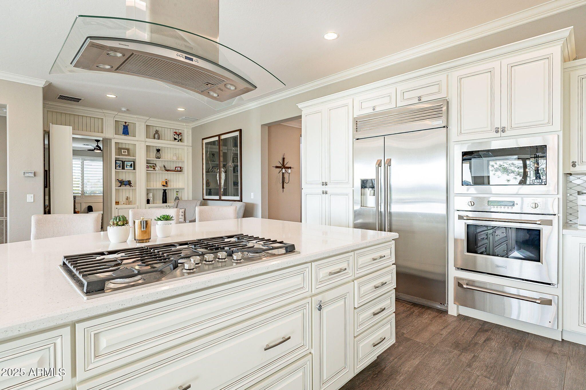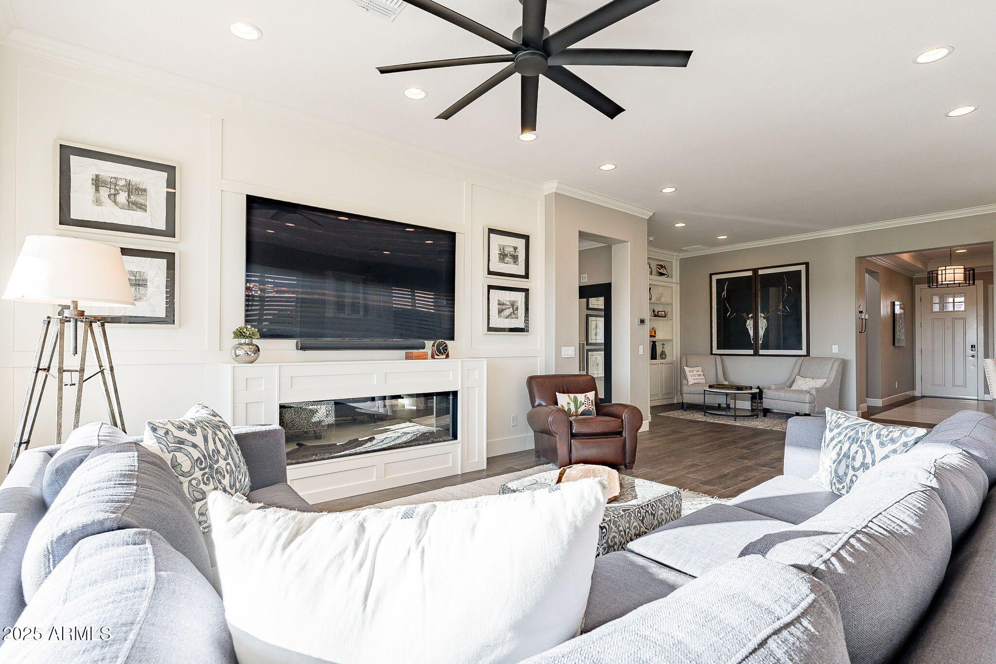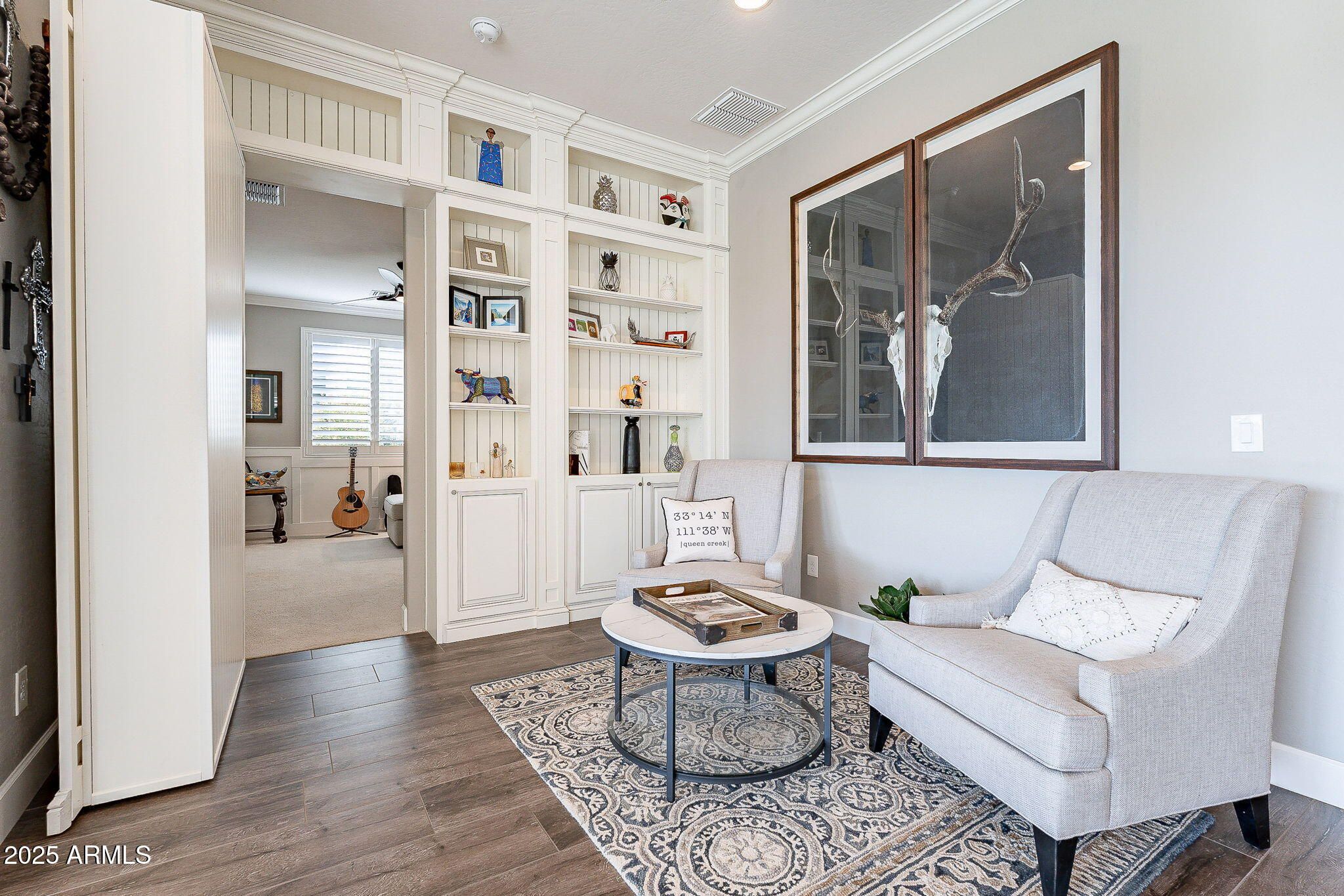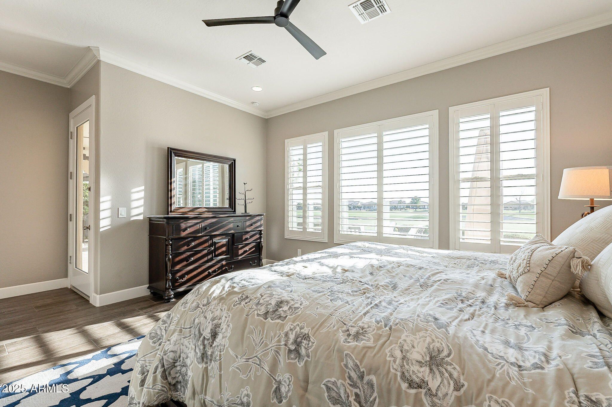 Welcome to this stunning Chroma floor plan on the golf course.. Enjoy a SW facing view & sunsets across two fairways, a lake, and the San Tan Mountains. Open great room floor plan includes oversized sliding doors leading to a fully landscaped private yard; gas fire pit; and automated sunscreen for casual outdoor living. Custom wainscoting; plantation shutters; built in bookcases, and premium gourmet kitchen complete the great room. With two dedicated bedrooms; a ''hidden room'' den and separate office, there's plenty of space for work and guests! Oversized laundry includes home office ''smart'' space. Tansferable golf membership assures option to purchase and no wait list. Enjoy two clubhouses; pools; fitness center; restaurants, spa in this active community.