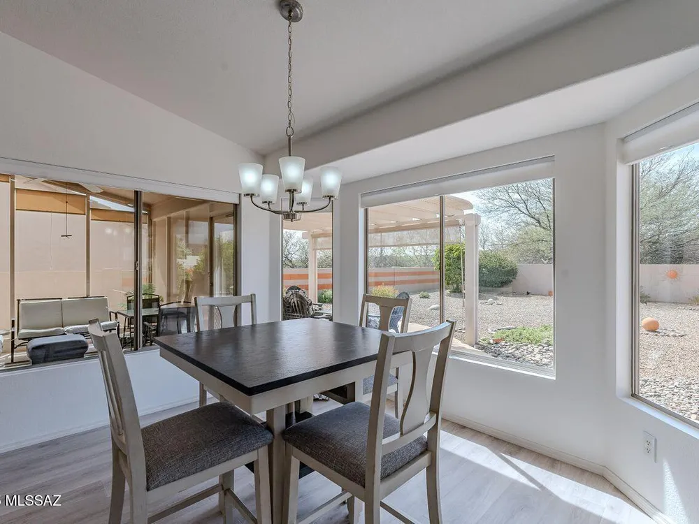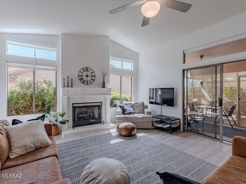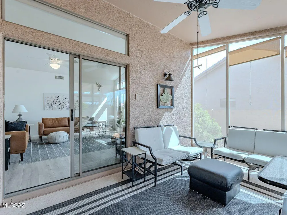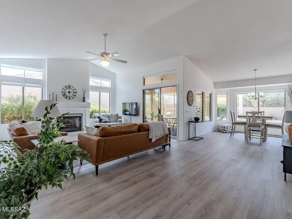 Flooded with natural light, this elegant Sonora floorplan seamlessly connects the open living, dining, and kitchen spaces. Fully renovated, the kitchen boasts quartz counters, new cabinets, SS appliances, pantry and views. The spacious main suite offers a custom closet, seating area, dual sinks, quartz vanity, and walk-in shower. New Pergo floors, paint, blinds, fans, lights, and hardware highlight every detail. Cozy up by the gas fireplace or retreat to the Arizona room. Outdoors, relax under the Pergola or enjoy lush privacy with open space views. Beautifully furnished--at no cost to buyer. A must-see gem!