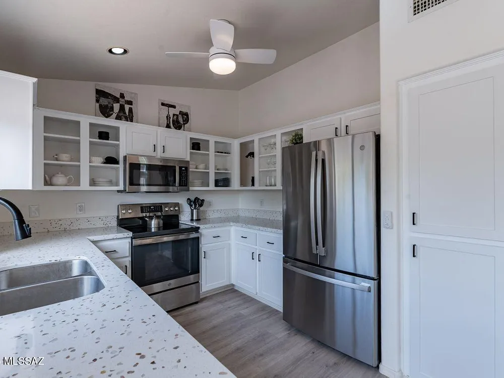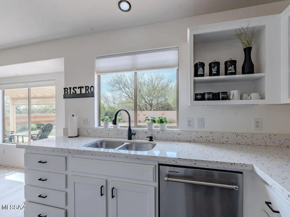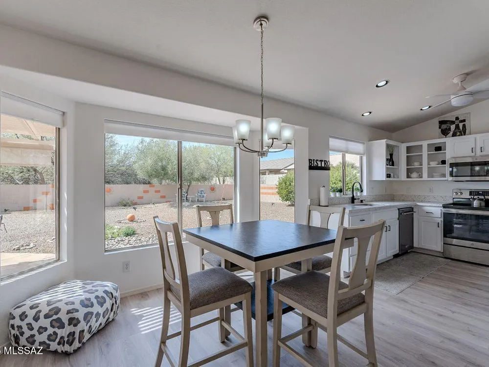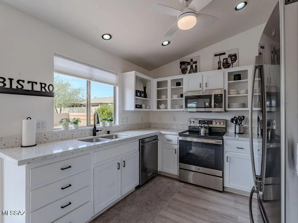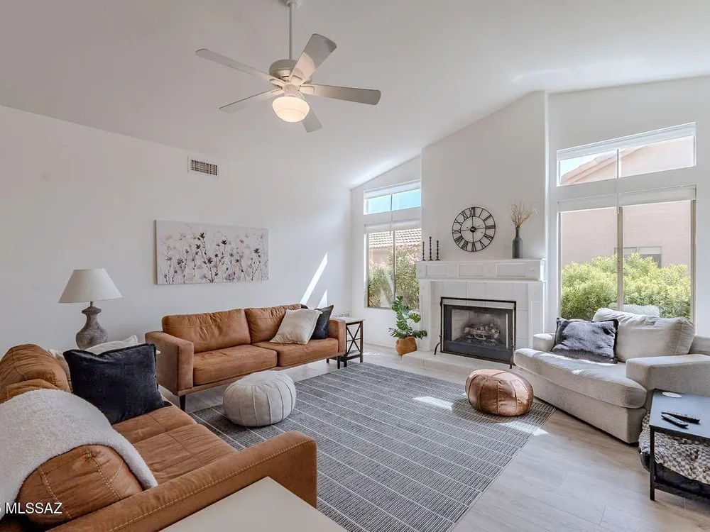 Flooded with natural light, this elegant Sonora floorplan seamlessly connects the open living, dining, and kitchen spaces. Fully renovated, the kitchen boasts quartz counters, new cabinets, SS appliances, pantry and views. The spacious main suite offers a custom closet, seating area, dual sinks, quartz vanity, and walk-in shower. New Pergo floors, paint, blinds, fans, lights, and hardware highlight every detail. Cozy up by the gas fireplace or retreat to the Arizona room. Outdoors, relax under the Pergola or enjoy lush privacy with open space views. Beautifully furnished--at no cost to buyer. A must-see gem!