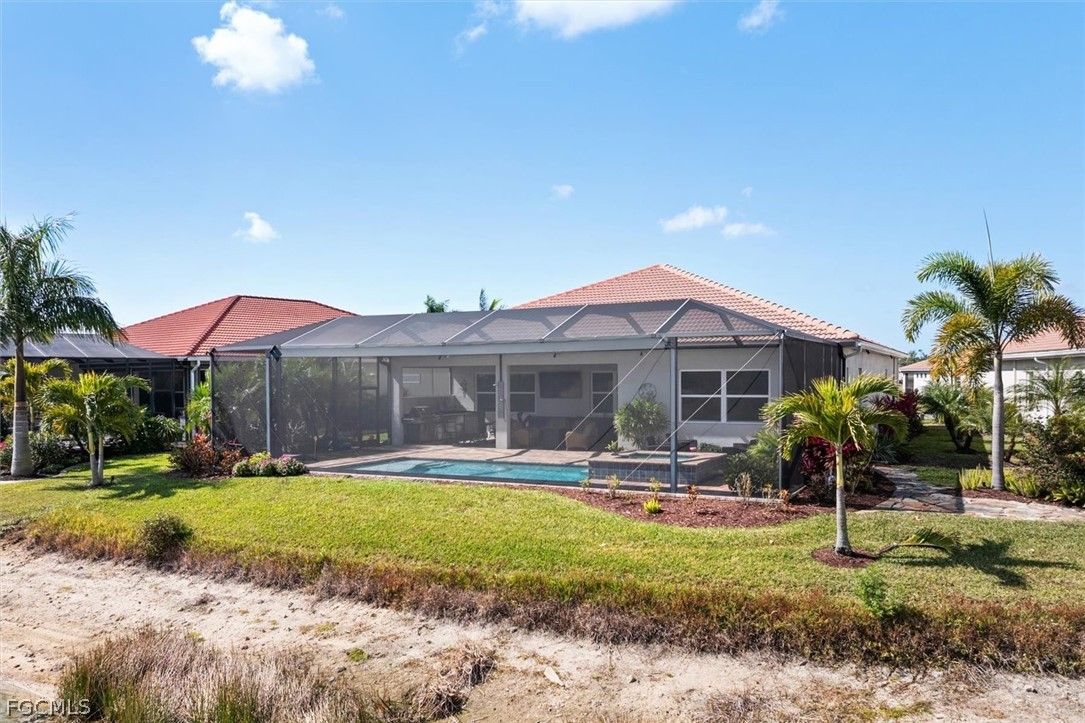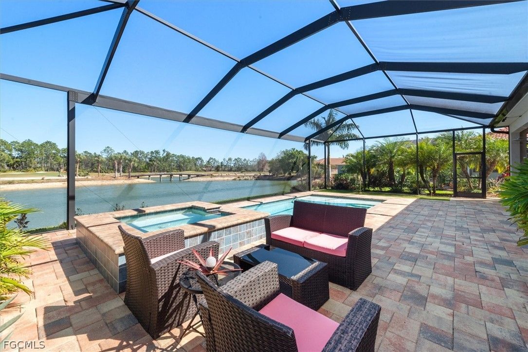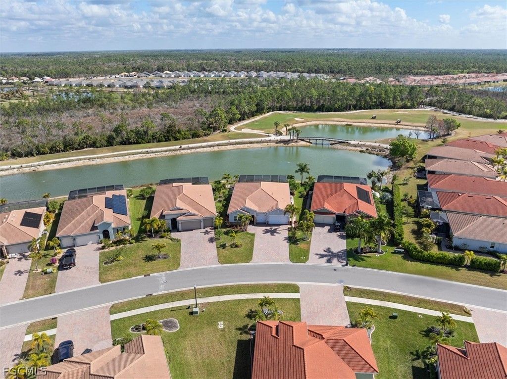 Perfectly positioned on one of the most coveted lots in the community, this extraordinary property boasts nearly 80 feet of rear waterfront frontage and sweeping panoramic views of the lake, 3rd green, signature 4th tee box, scenic bridge, and preserve - a truly breathtaking setting for everyday living. The popular Abbey open-concept floor plan features a 3-car garage, 3 bedrooms, 2.5 bathrooms, and a den, blending spacious design with thoughtful upgrades. This well-appointed home includes impact-resistant windows, tile flooring throughout, crown molding in the living areas and bedrooms, large ceiling fans inside and on the lanai for year-round comfort, and a hard-wired ADT security system for added peace of mind. The garage showcases a new epoxy floor, offering a clean, durable finish. The kitchen is designed to impress with premium staggered cabinetry with crown molding, granite countertops, upgraded stainless steel appliances, and a large pantry - all flowing seamlessly into the main living space. Step outside to the impressive lanai where a saltwater heated pool and spa take center stage. The outdoor living area is complete with an outdoor kitchen, a pool shower with hot water, and a private chipping and putting green with artificial turf, offering the ultimate Florida lifestyle experience. The property, including the lanai features professional landscaping, irrigation lines for potted plants in both the front and rear, and low-voltage landscape lighting around the entire house and a separate system for the pool area, creating a stunning evening ambiance. The home and pavers have been professionally cleaned and the pavers sealed, providing a fresh, polished look. Residents of Magnolia Landing enjoy outstanding amenities including a resort-style pool, lap pool, fitness center, pickleball, bocce ball, and shuffleboard courts. HOA dues cover HD cable, landscaping, irrigation, on-site management, and more - providing convenient, low-maintenance living. Optional golf memberships are available for the 18-hole Championship course, golf shop, and on-site restaurant. Ideally located just a short drive to shopping, dining, downtown Fort Myers, and Punta Gorda. Rarely does a lot and home combination like this become available - schedule your private showing today!