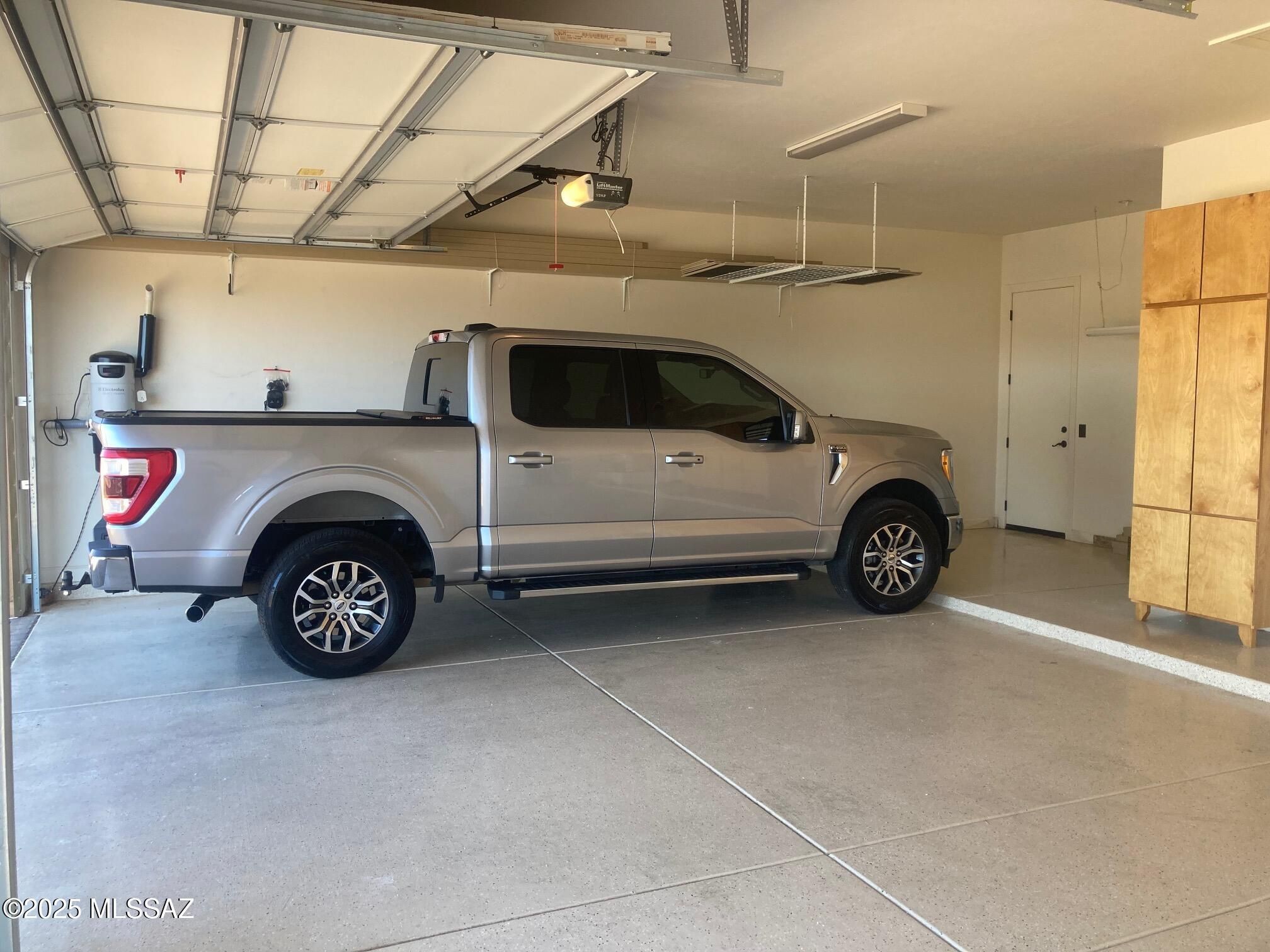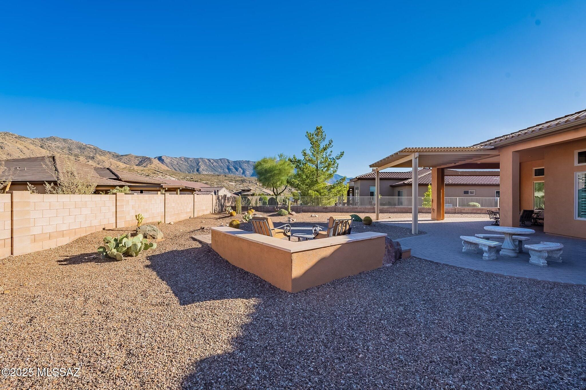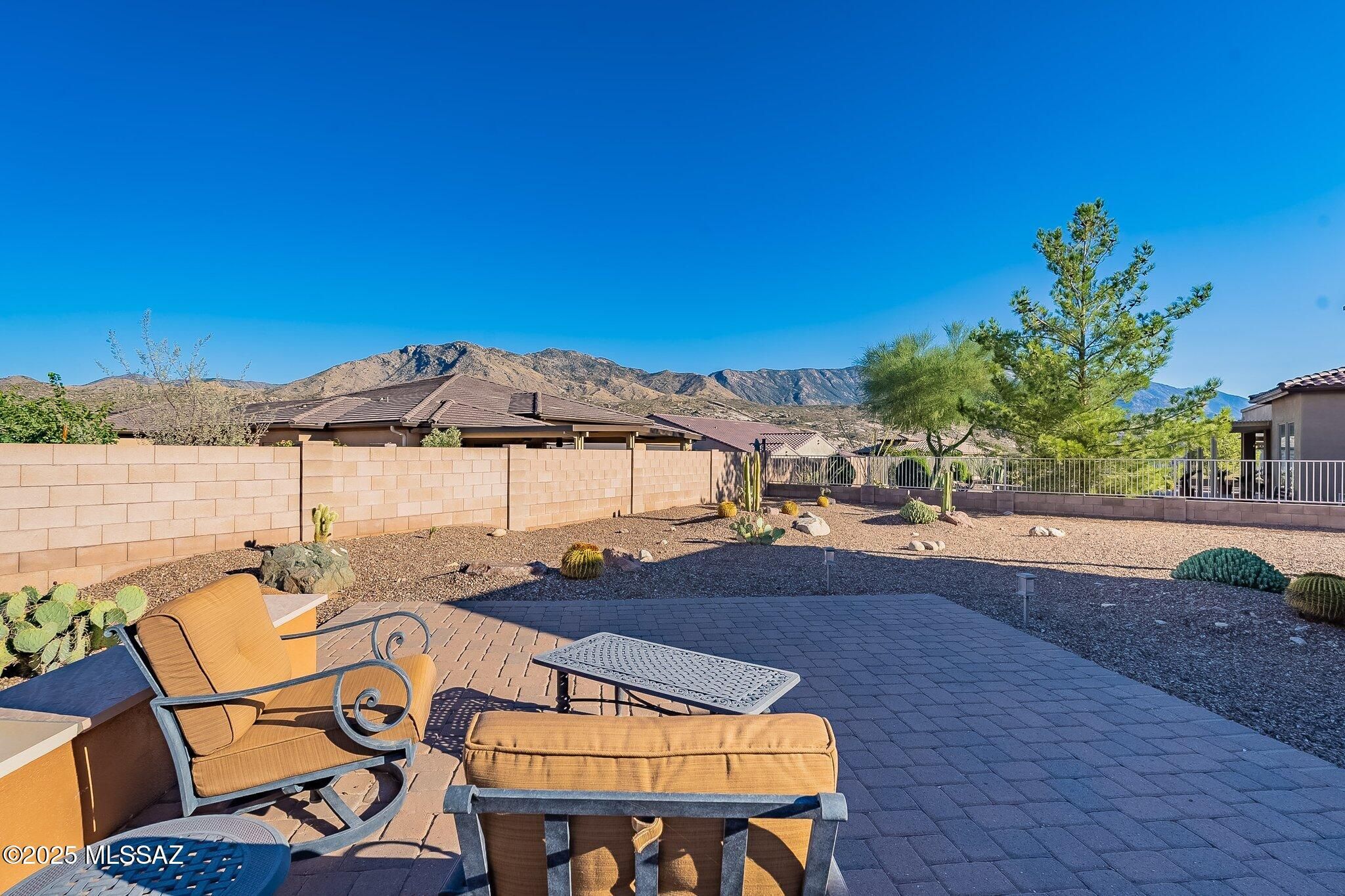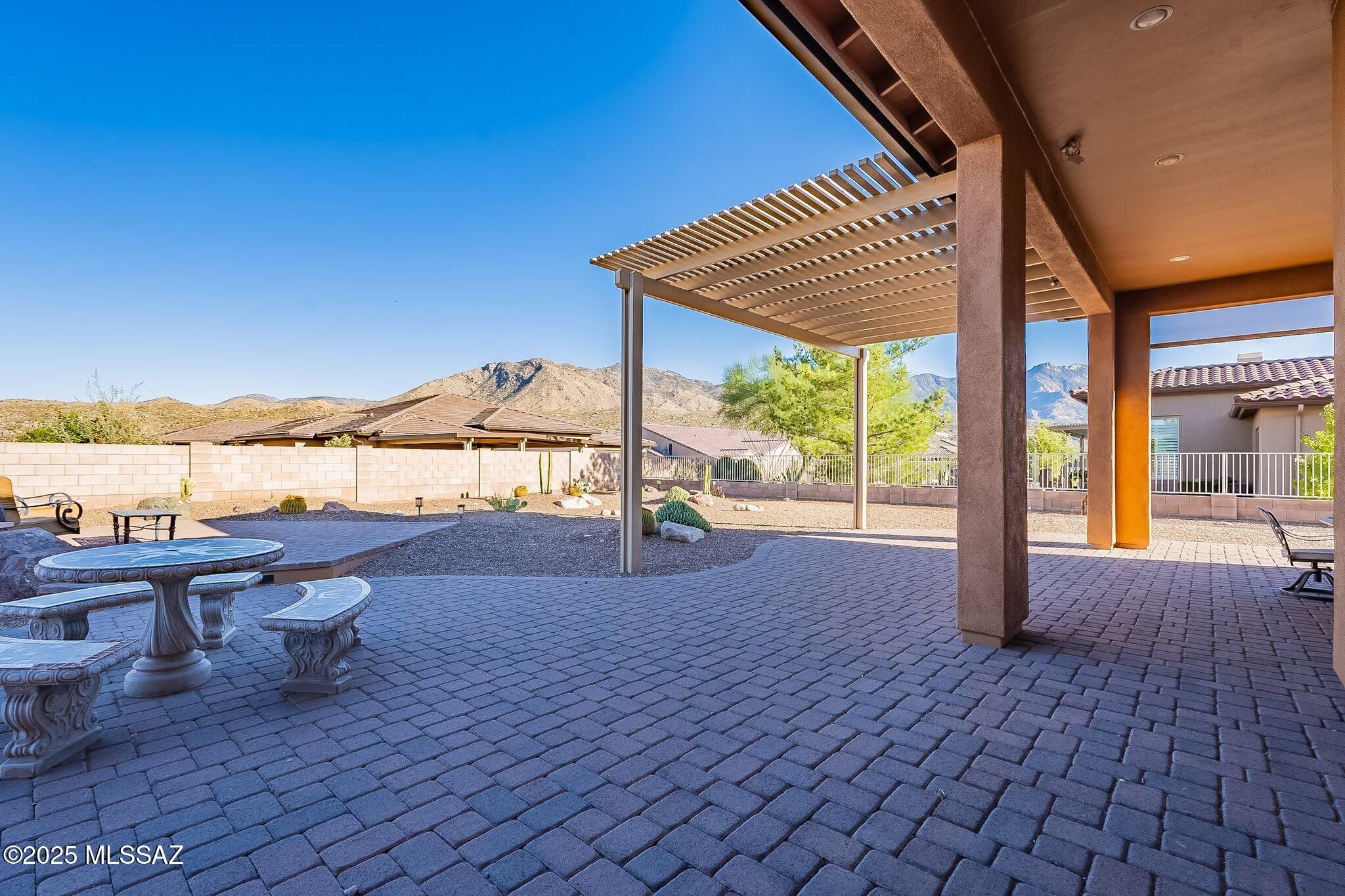 Desired east rear w/views of Catalina Mountains from extended back patio featuring a huge ramada, covered patio & raised sitting area. Versatile Canyon floor plan checks all the boxes. Open floor plan w/ Great Room, super Kitchen w/views to the outside living area, split bedrooms, wonderful master bedroom w/wood flooring, spacious master bathroom, large walk-in closet w/built ins, separate guest suite, den/office. Added bonus is the large sitting room/library or install a wall bed for additional guests. No need for a casita! Need room for an extended vehicle like a standard pickup. This 3 car garage with epoxy coating will accommodate it & includes space for a workbench. B/I vacuum, water softener, hot water recirculator . Exterior of the house painted & most windows upgraded in 2024