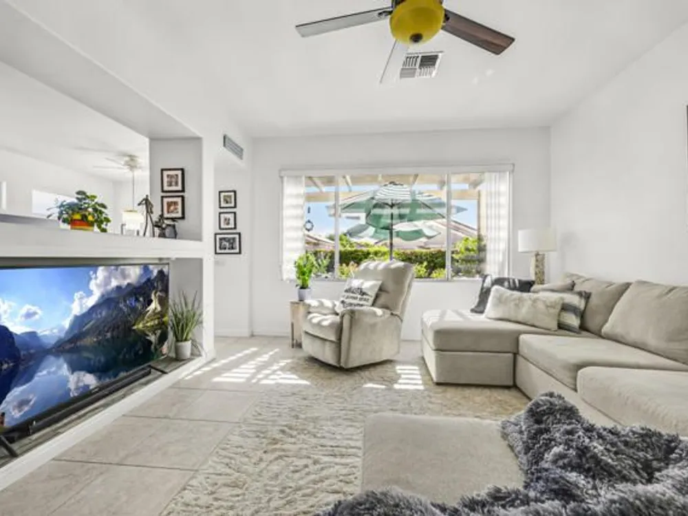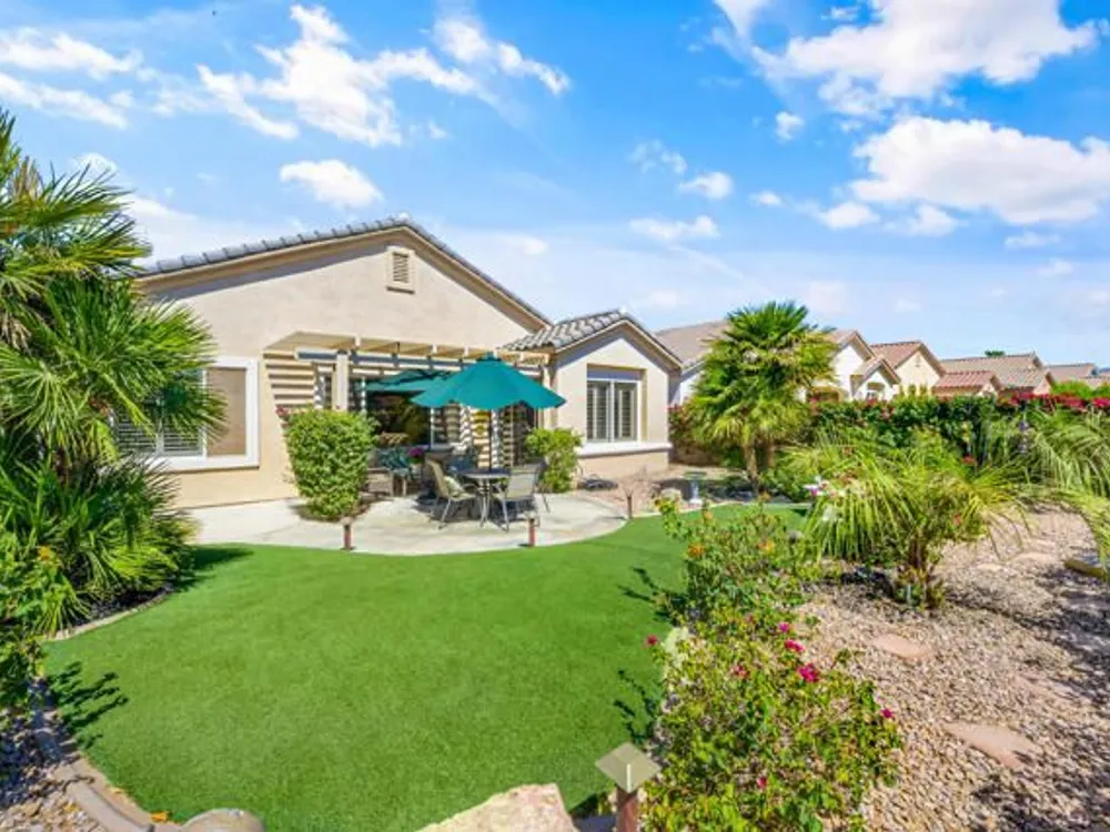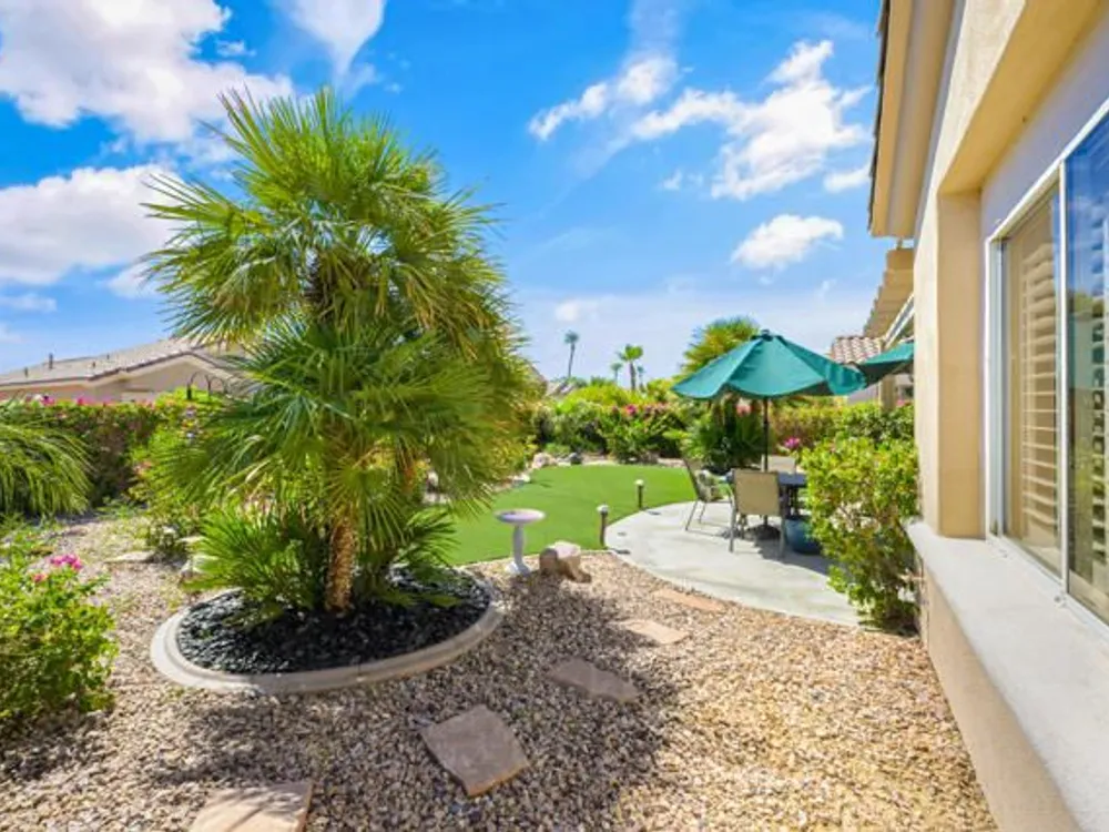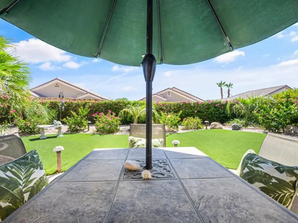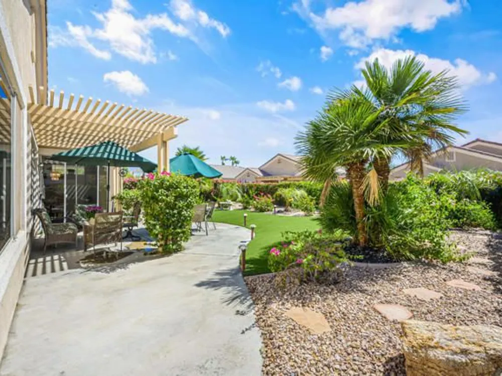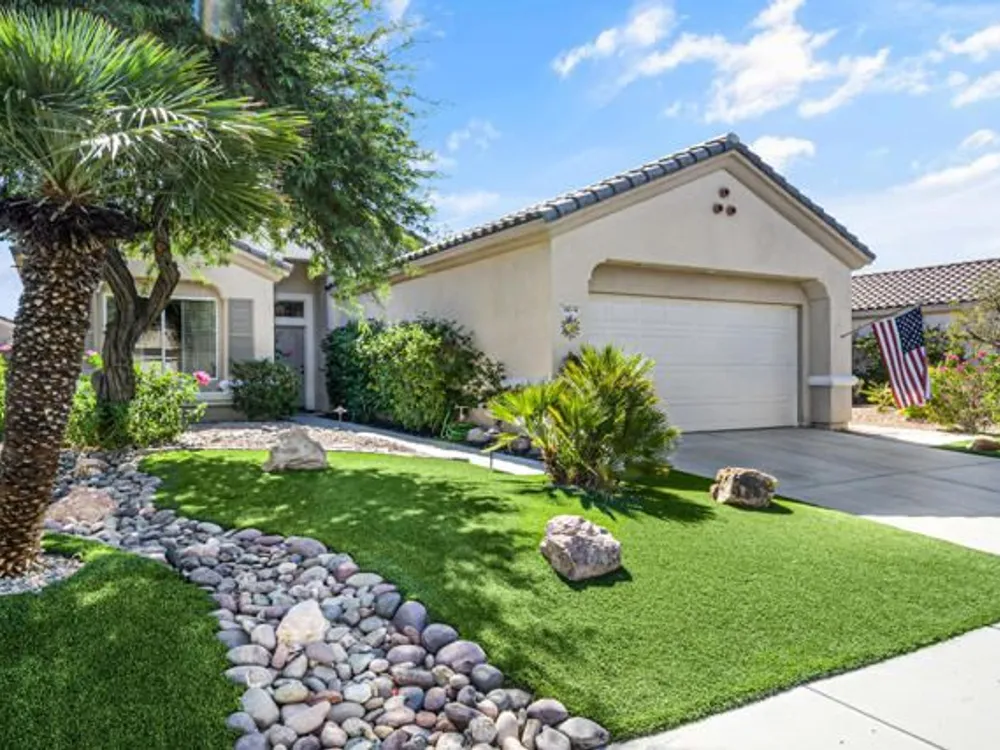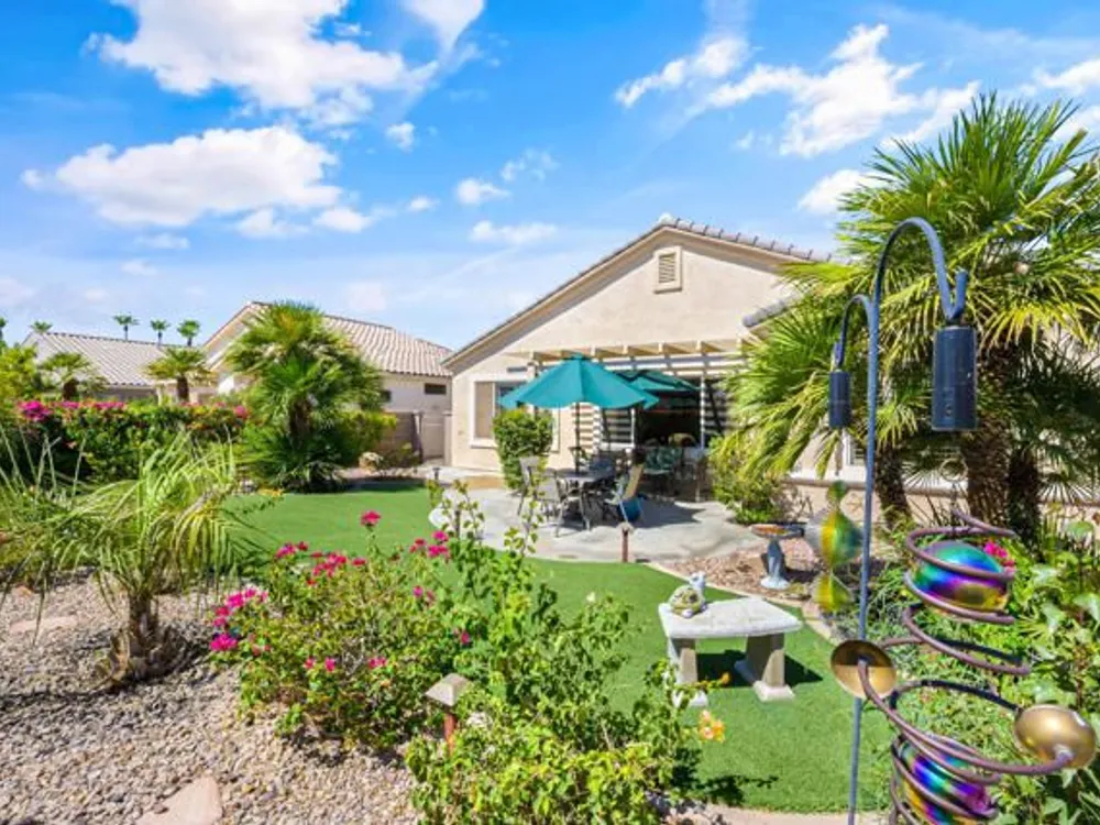 Welcome to 36574 Royal Sage Court, where comfort, charm, and pride of ownership meet! This well-maintained Lanai floor plan features 2 bedrooms, 2 bathrooms with 1,213 square feet (EST.) offers privacy, neutral tones, and plenty of natural light throughout. The kitchen features warm oak cabinetry, custom backsplash, white appliances including a new microwave installed in August 2025, a gas range, and a convenient breakfast bar that opens to the dining area, perfect for everyday living and easy entertaining. Enjoy morning sunlight from the cozy dining nook, which features plantation shutters that frame views to the lush yard space. A spacious living area is light and inviting, ideal for relaxing or hosting. The primary suite offers plush newer carpeting, a large walk-in closet, and an ensuite bath with dual sinks and a walk-in shower. Located on the other side of the home, the second bedroom provides privacy and views to the beautifully landscaped front yard. Your own private backyard oasis awaits, complete with peek-a-boo mountain views to the east, artificial turf, colorful desert landscaping with miniature palms, an alumawood covered patio, room to dine, lounge garden and relax in the sun. Sun City Palm Desert is one of the Coachella Valley's premier 55+ active adult communities featuring two championship golf courses, an 18-hole putting course, three clubhouses, two fitness centers, an indoor swimming pool, outdoor pools and two restaurants. Enjoy over 80 social clubs, tennis, pickleball, softball and so much more! *Turnkey furnishings are available outside of escrow.*