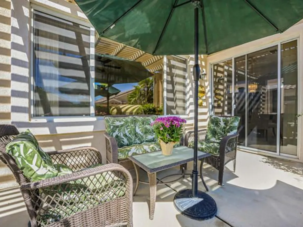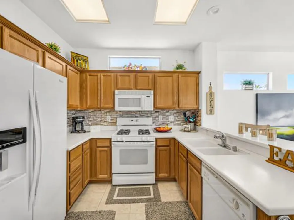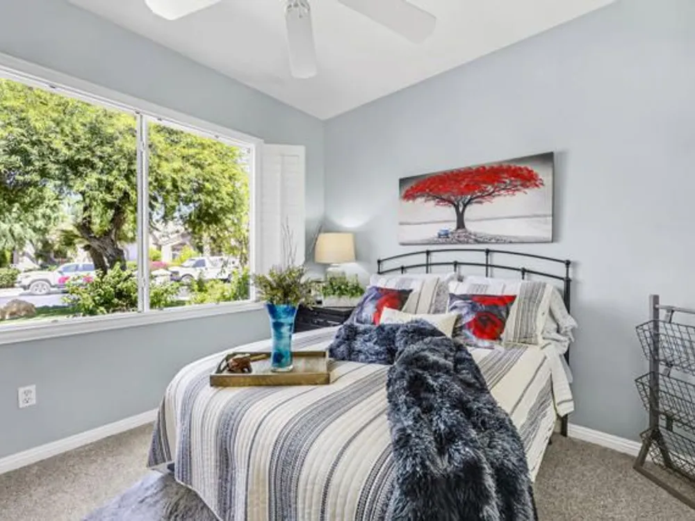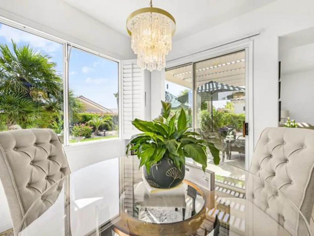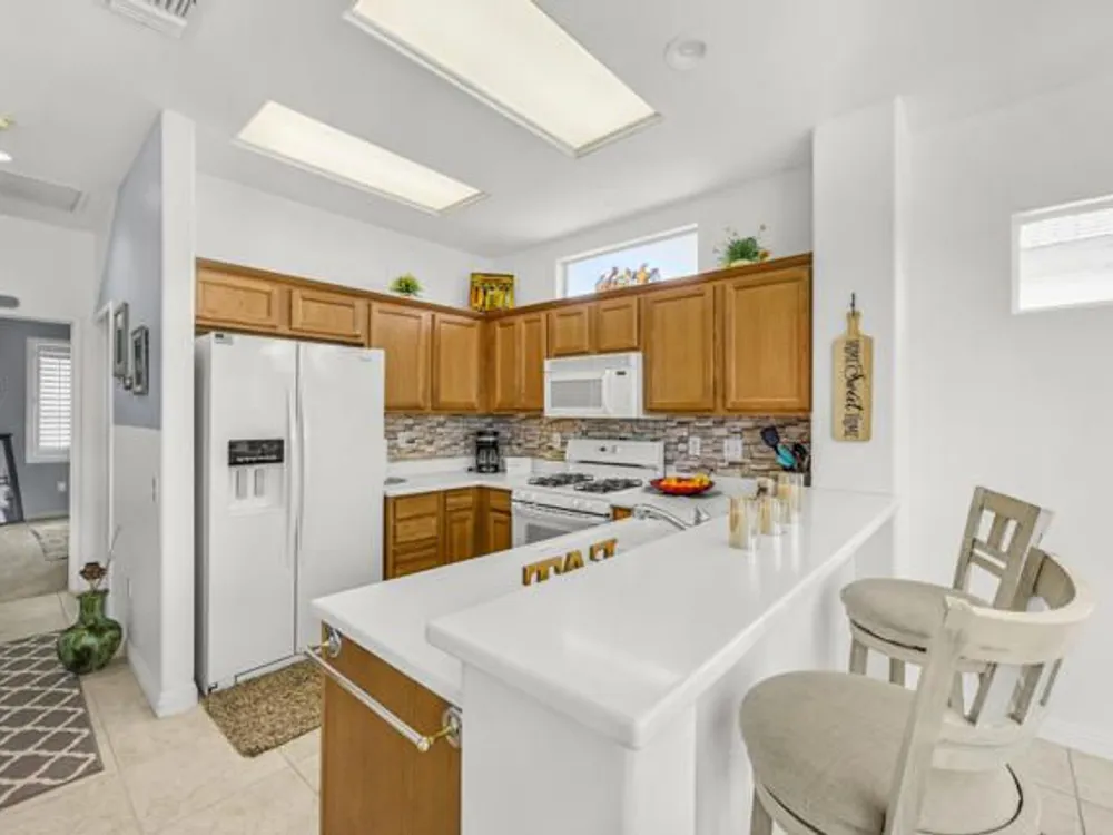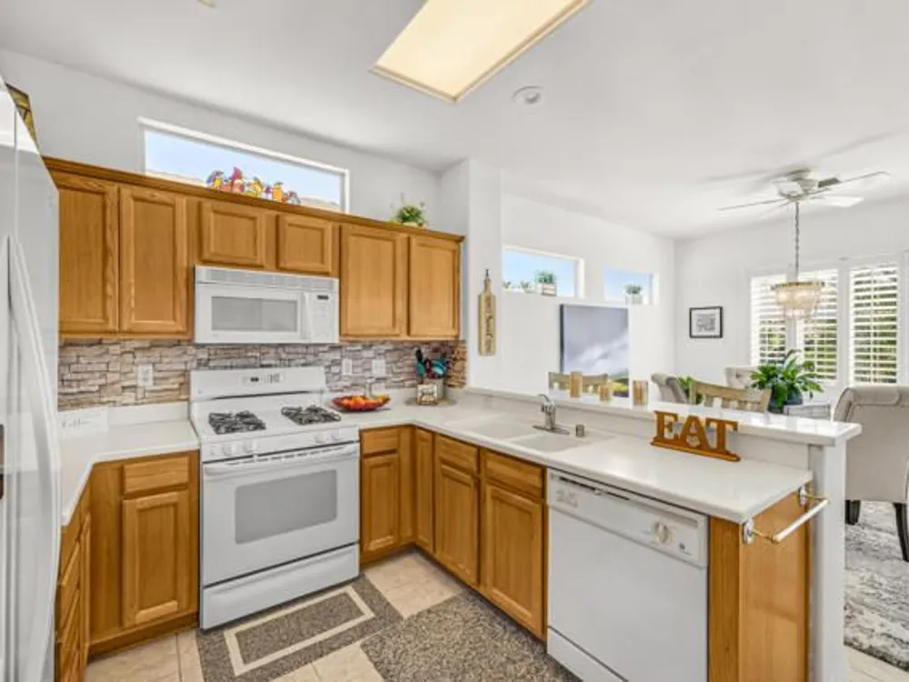 Welcome to 36574 Royal Sage Court, where comfort, charm, and pride of ownership meet! This well-maintained Lanai floor plan features 2 bedrooms, 2 bathrooms with 1,213 square feet (EST.) offers privacy, neutral tones, and plenty of natural light throughout. The kitchen features warm oak cabinetry, custom backsplash, white appliances including a new microwave installed in August 2025, a gas range, and a convenient breakfast bar that opens to the dining area, perfect for everyday living and easy entertaining. Enjoy morning sunlight from the cozy dining nook, which features plantation shutters that frame views to the lush yard space. A spacious living area is light and inviting, ideal for relaxing or hosting. The primary suite offers plush newer carpeting, a large walk-in closet, and an ensuite bath with dual sinks and a walk-in shower. Located on the other side of the home, the second bedroom provides privacy and views to the beautifully landscaped front yard. Your own private backyard oasis awaits, complete with peek-a-boo mountain views to the east, artificial turf, colorful desert landscaping with miniature palms, an alumawood covered patio, room to dine, lounge garden and relax in the sun. Sun City Palm Desert is one of the Coachella Valley's premier 55+ active adult communities featuring two championship golf courses, an 18-hole putting course, three clubhouses, two fitness centers, an indoor swimming pool, outdoor pools and two restaurants. Enjoy over 80 social clubs, tennis, pickleball, softball and so much more! *Turnkey furnishings are available outside of escrow.*