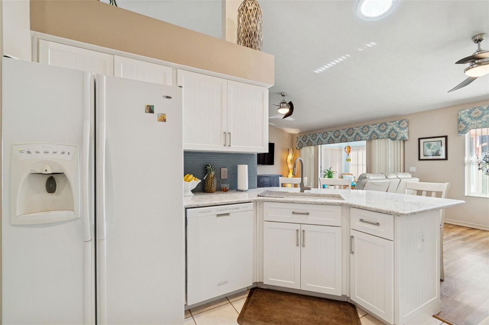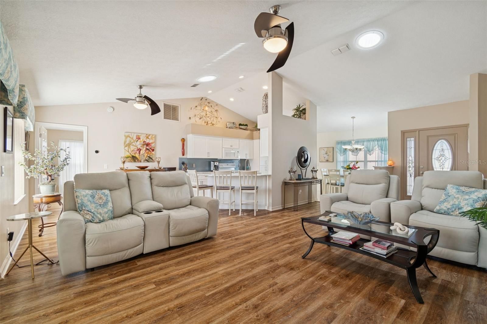 Welcome to this beautifully maintained 3-bedroom, 2-bath home with over 1,500 square feet, located in a desirable 55+ community offering resort-style amenities where residents enjoy access to a fitness center, swimming pool, clubhouse, tennis courts, along with trash service, cable TV, internet, scenic walking trails, Lake water access, boat ramp and lake Dock included. The home features a stunning curb appeal with a paver driveway and walkway leading up to the front porch, thoughtfully designed split floor plan with a formal dining room, tile and luxury vinyl plank (LVP) flooring throughout, and ceiling fans in all bedrooms, living room, patio lanai. The kitchen is equipped with quartz countertops, all appliances included, and opens seamlessly to the main living areas—perfect for both everyday living and entertaining. A dedicated laundry room includes a washer and dryer, both conveying with the sale. The spacious primary suite offers walk-in closets, a walk-in shower, soaking tub, quartz countertops, and a pocket door leading into the en-suite bathroom. A hall bathroom with direct access to one of the secondary bedrooms provides added convenience for guests. Additional highlights include rain gutters, a screened-in rear lanai, two solar tubes for enhanced natural light, screen garage door, plus garage door control. Major updates includes a new irrigation control installed in 2023, a newly paved driveway (2021), HVAC system (2021), roof replaced in 2016, New cabinets refacing and a Nest smart thermostat for energy efficiency and comfort. This move-in-ready home combines comfort, upgrades, and low-maintenance living in an amenity-rich community— schedule your private showing today. On site Boat/RV storage available with additional fee