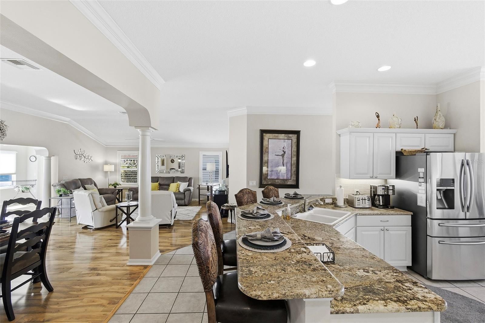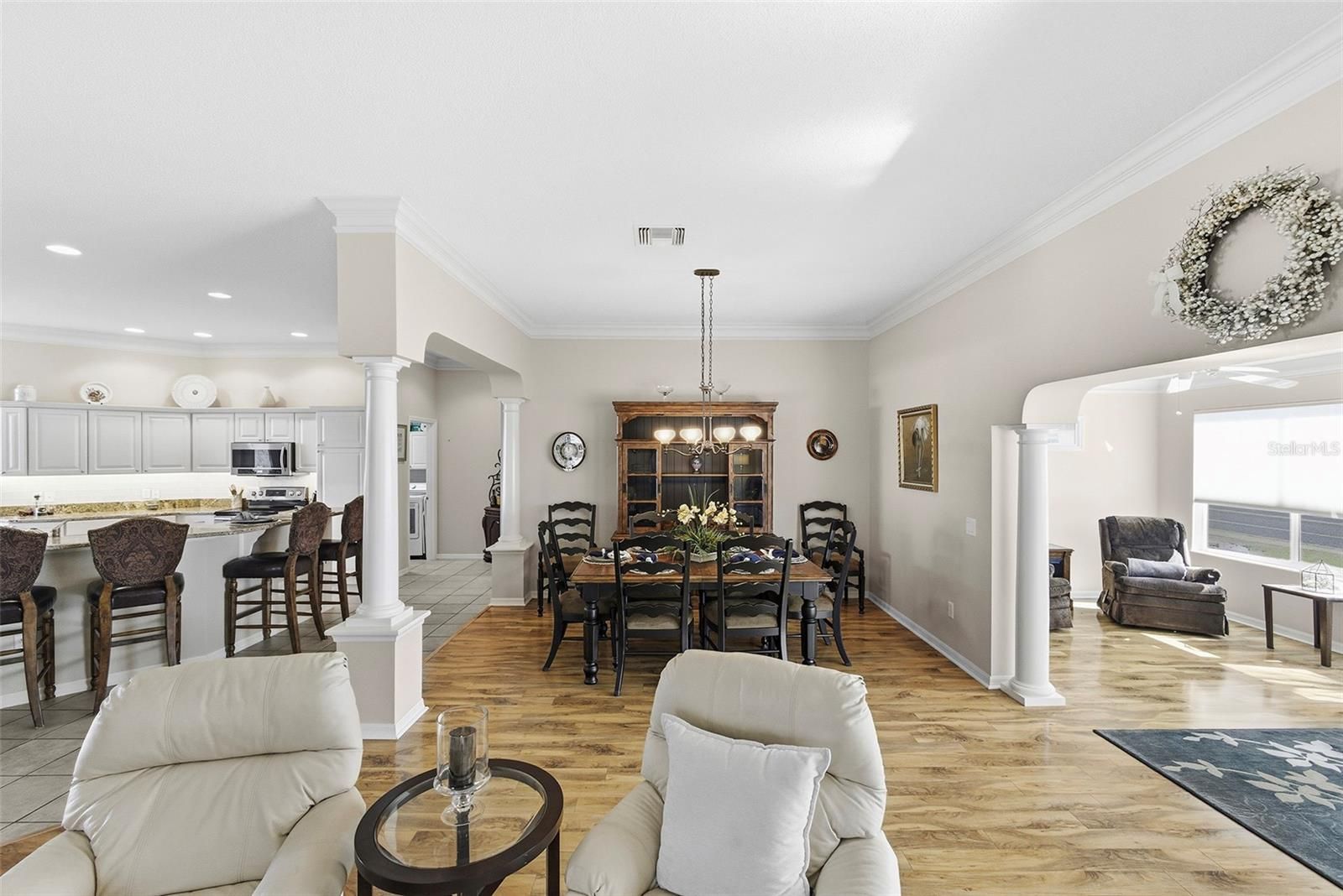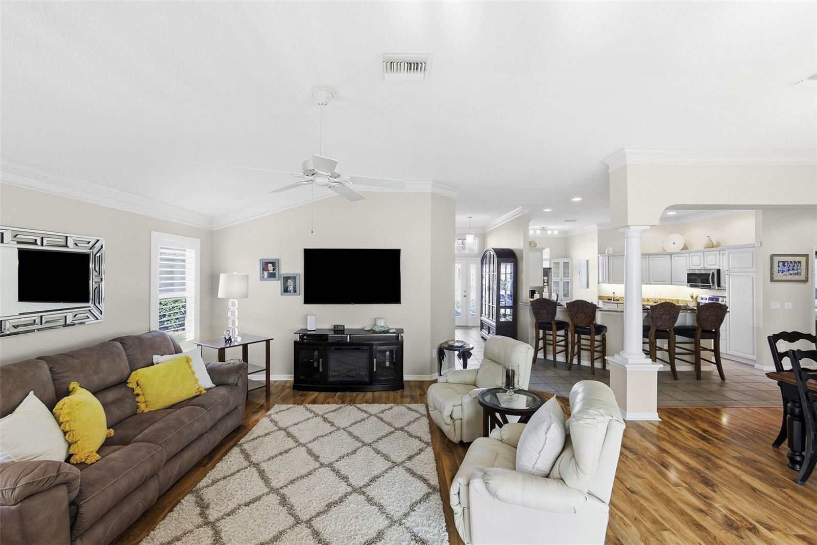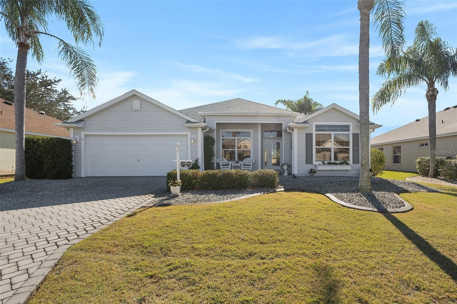 Village of Mallory Square • Camellia Designer Model • 3 Bedroom | 2 Bath • Open Floorplan • Enclosed Lanai • Side Patio with Remote Awning • No Carpet • Plantation Shutters • Crown Molding • Granite Countertops • Roof 2021 • No Bond Balance Welcome home to this beautifully maintained Camellia Designer Model located in the highly desirable Village of Mallory Square, offering an inviting open floorplan, thoughtful upgrades, and exceptional outdoor living. Situated on a quiet cul-de-sac street, the home welcomes you with charming curb appeal featuring a pavered driveway, leaded glass front door, low-maintenance tropical landscaping, and an open front patio that is perfect for morning coffee or evening relaxation. Step inside to discover vaulted volume ceilings and a bright, airy interior enhanced by plantation shutters, crown molding, and solid-surface flooring throughout with absolutely no carpet. The spacious living and dining areas flow seamlessly, creating an ideal setting for both everyday living and entertaining. The kitchen is both functional and stylish, showcasing granite countertops, newer stainless steel appliances, soft light creamy cabinetry, under-cabinet lighting, and a convenient eat-in nook for casual dining. From the main living area, extend your living space into the enclosed lanai, adding approximately 300 square feet of additional living area perfect for relaxing, reading, or hosting guests. Just beyond, a side patio with a remote-control awning provides a shaded outdoor retreat for grilling or enjoying Florida’s beautiful weather. The primary suite is a private haven, offering generous space, double walk-in closets, and a well-appointed en-suite bath with dual vanities and large linen storage. Two additional bedrooms provide flexibility, including a third bedroom currently configured as a den with a built-in desk and Murphy bed, making it ideal for a home office, hobby room, or guest space with abundant storage. Additional highlights include a roof replaced in 2021, pristine overall condition, and no bond balance, adding tremendous value and peace of mind. Ideally located in Mallory Square with convenient access to golf, recreation centers, shopping, dining, and nightly entertainment, this home offers the perfect blend of comfort, style, and The Villages lifestyle.