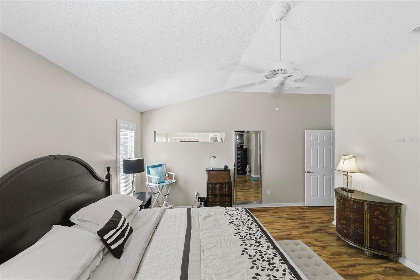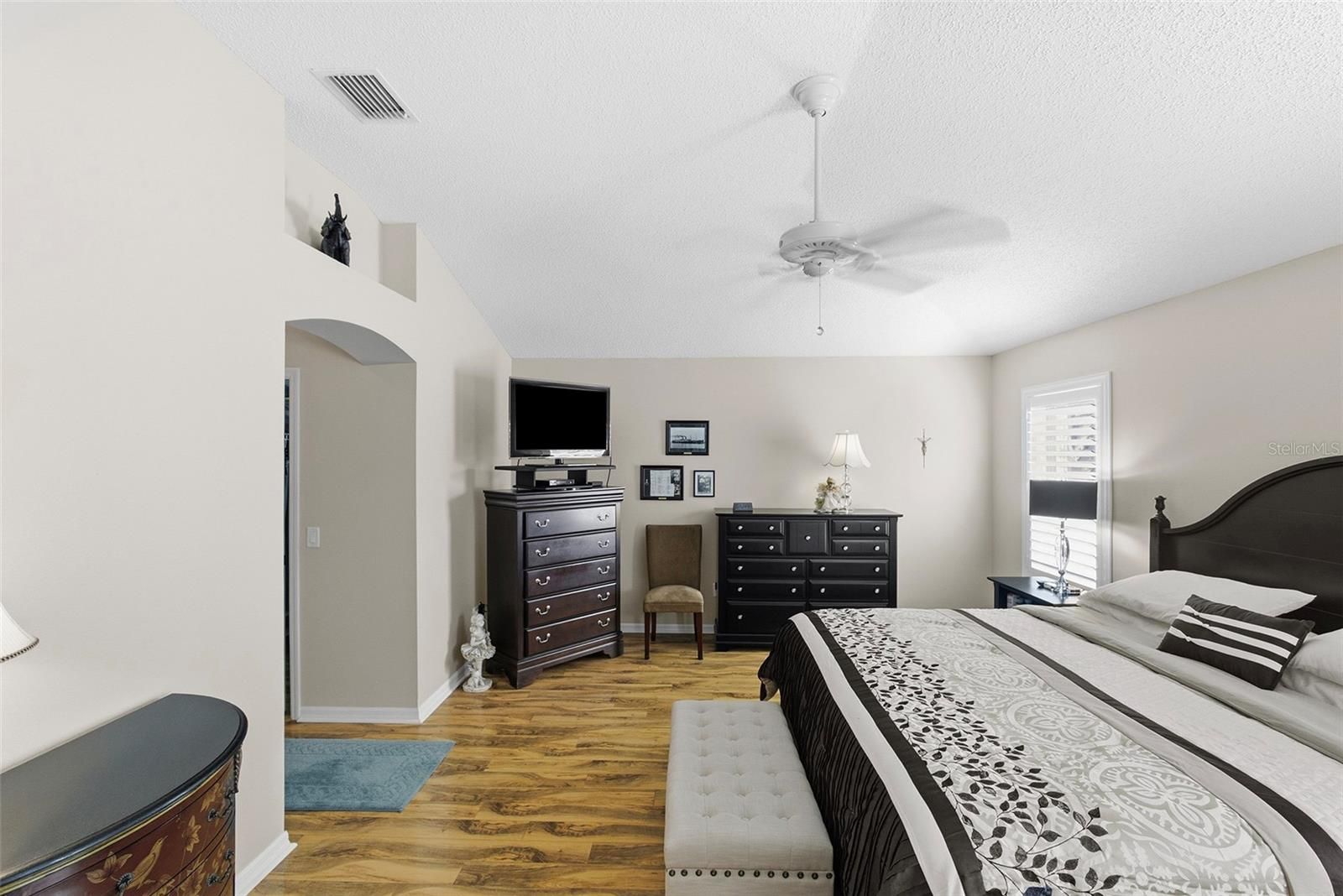 - Ceiling Fan(s), Crown Molding, Eat-in Kitchen, Living/Dining Room, Open Floorplan, Main Level Primary, Stone Counters, Vaulted Ceiling(s), Walk-In Closet(s), Window Treatments