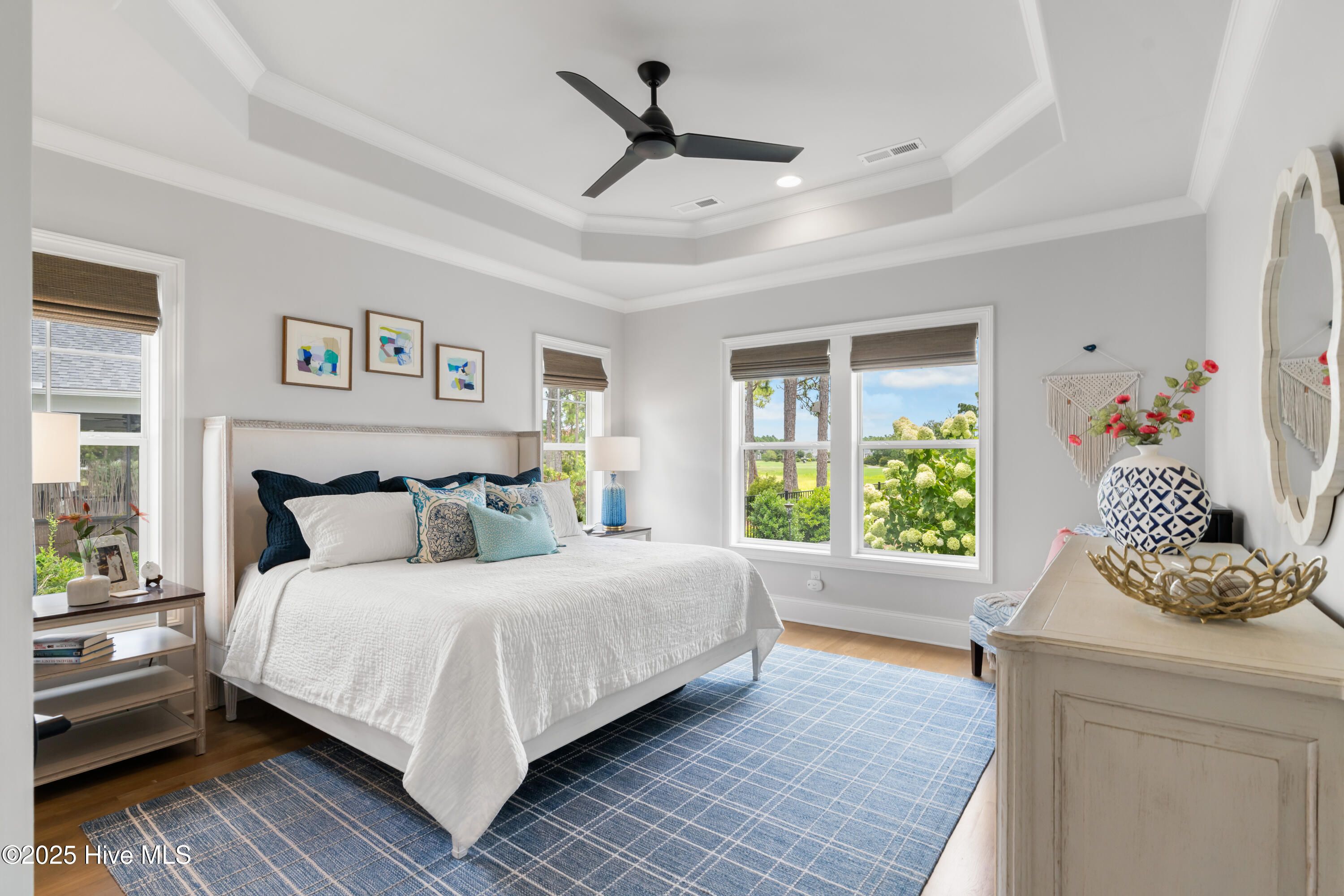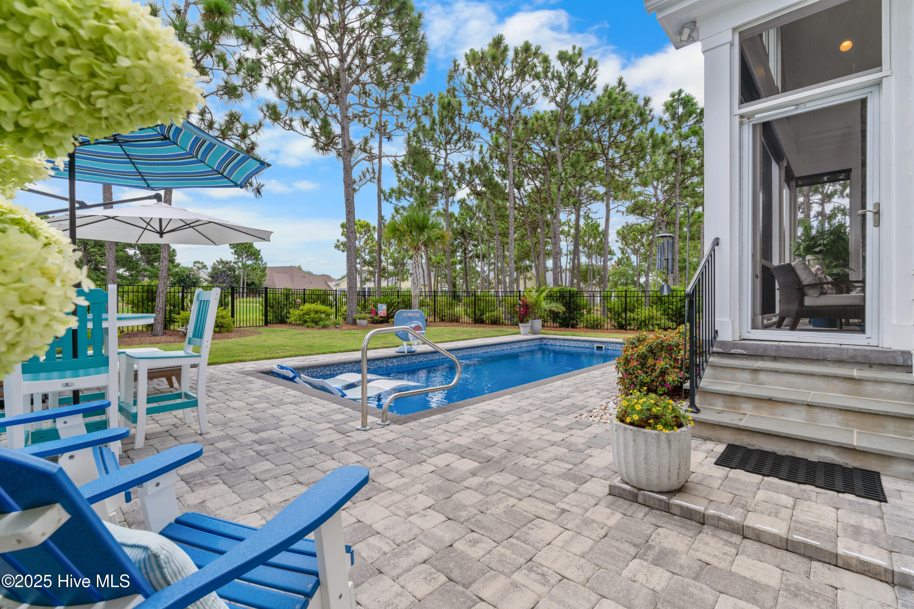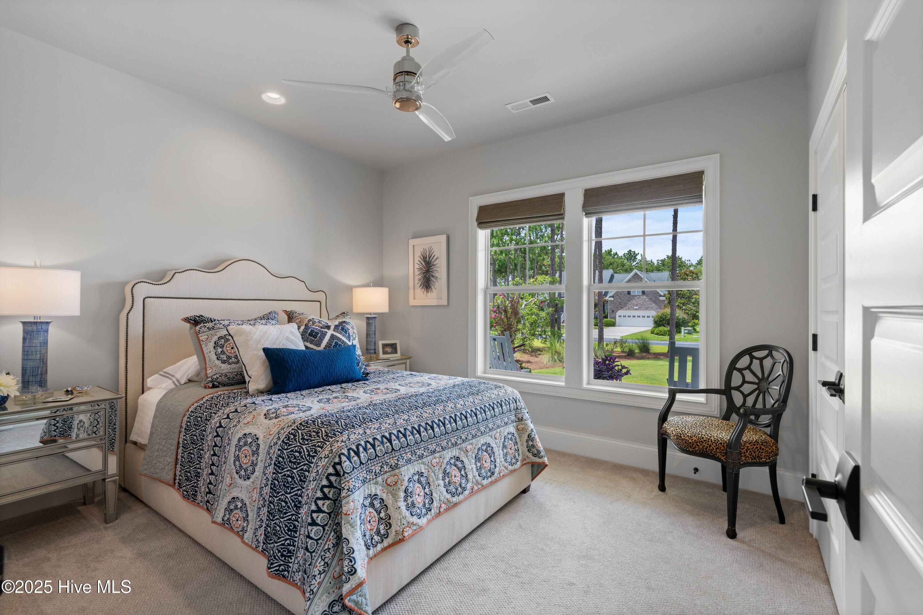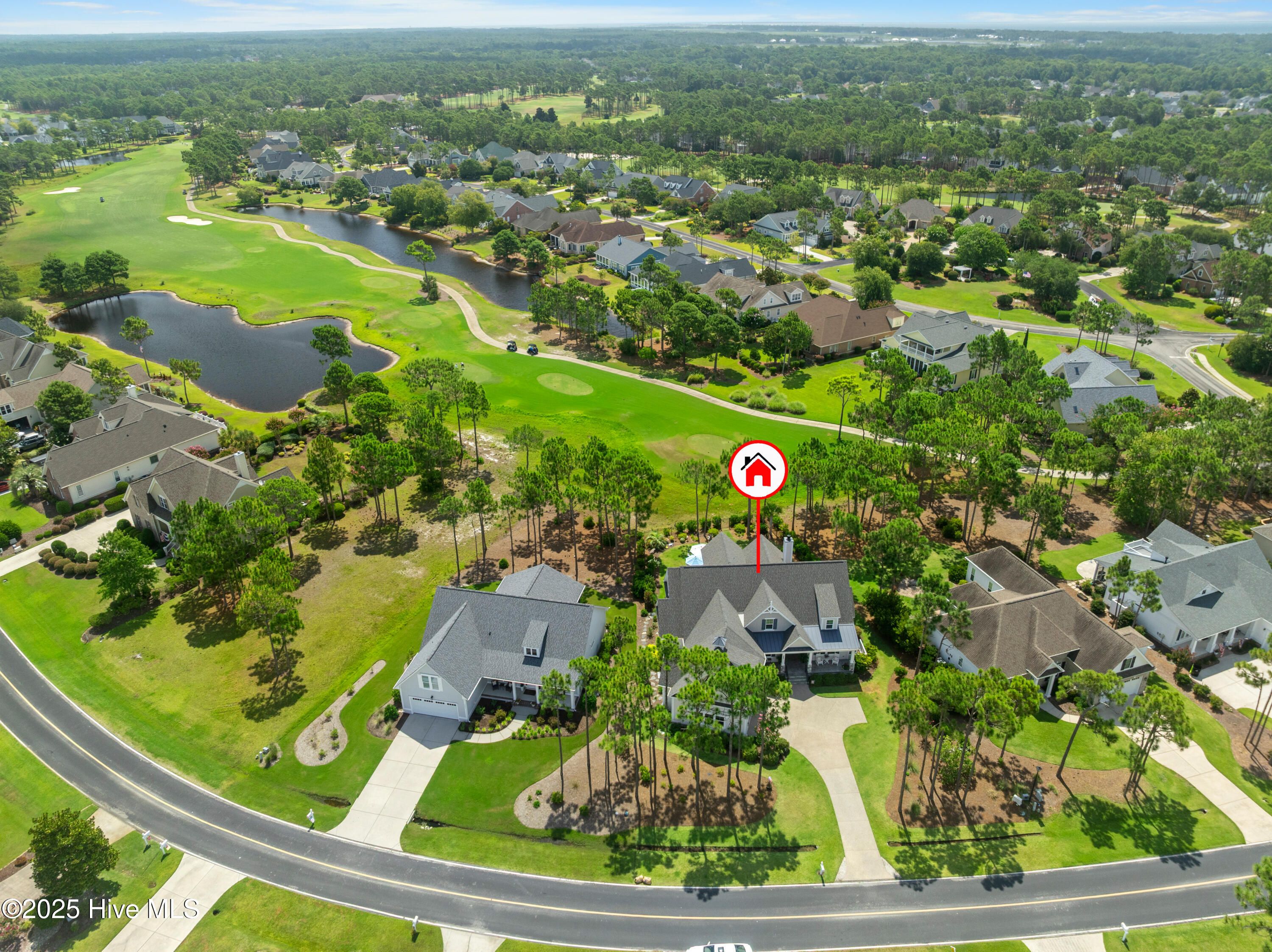 Custom George Crane with expansive golf views and pool. Welcome to 3660 Wingfoot Drive, a custom-built masterpiece by George Crane offering premier golf course frontage and a private pool. Overlooking the ninth tee box of the Cate 9 at the prestigious St. James Members Club, this nearly new home combines exceptional craftsmanship, thoughtful upgrades, and panoramic views, all just a short stroll to the Members Club's golf, tennis, fitness center, indoor pool, sauna, and dining. From the moment you arrive, the attention to detail is unmistakable. An aggregate driveway leads to a stamped concrete front porch framed by double hardwood doors. Inside, a bright open-concept design features coffered ceilings, upgraded lighting throughout, and rich hardwood floors across the main level. Wainscoting accents the entryway and office, where a barn door adds character and privacy. The gourmet kitchen is a showpiece with upgraded cabinetry and hardware, decorative tile backsplash, and high-end appliances. A walk-in butler's pantry offers custom shelving, a wine/drink cooler, and dedicated storage for small appliances. The adjoining great room showcases a gas linear fireplace with shiplap and stone accents, flanked by custom built-ins and a wall of windows framing views of the pool and golf course. The main-level primary suite is a serene retreat with a spa-inspired bath featuring a zero-entry glass and tile shower, built-in cabinetry, and a dressing-room-style custom closet. Two guest bedrooms share a Jack and Jill bath with a walk-in glass-and-tile shower and premium fixtures. A laundry room and drop zone complete the first floor. Upstairs, a fourth bedroom, full bath, and spacious game room provide flexible living space. The game room includes custom shelving, an upgraded granite-topped bar, and beverage cooler. Additional thoughtful upgrades include solid five-panel bedroom doors, custom blackout Roman shades in every bedroom, professionally designed closet systems, upgraded cabinetry and hardware throughout, custom tile in all bathrooms and the laundry room, and epoxy coating on the garage floor. The home is equipped with a whole-house reverse osmosis and water softener system, tankless water heater, and an encapsulated crawlspace with dehumidifier. A Sonos sound system serves the family room, kitchen, and screened porch, with wiring extending to the primary suite and game room. Step outside to a private backyard oasis designed for both relaxation and entertaining. The saltwater pool features a splash deck, built-in seating along one side, water jets, and underwater lighting. Adjacent to the pool, a fully outfitted outdoor full bath offers a shower, toilet, sink, and sun shade. The screened-in porch provides seamless indoor-outdoor living with stamped concrete flooring, a floor-to-ceiling stone wood-burning fireplace, and custom sun and wind shades. Professionally designed landscaping includes irrigation and lighting in both the front and back, plus a separate attached tool shed for convenience. This home represents more than luxury; it's a lifestyle. Experience the unparalleled quality, design, and comfort of this George Crane custom home in the heart of St. James Plantation.