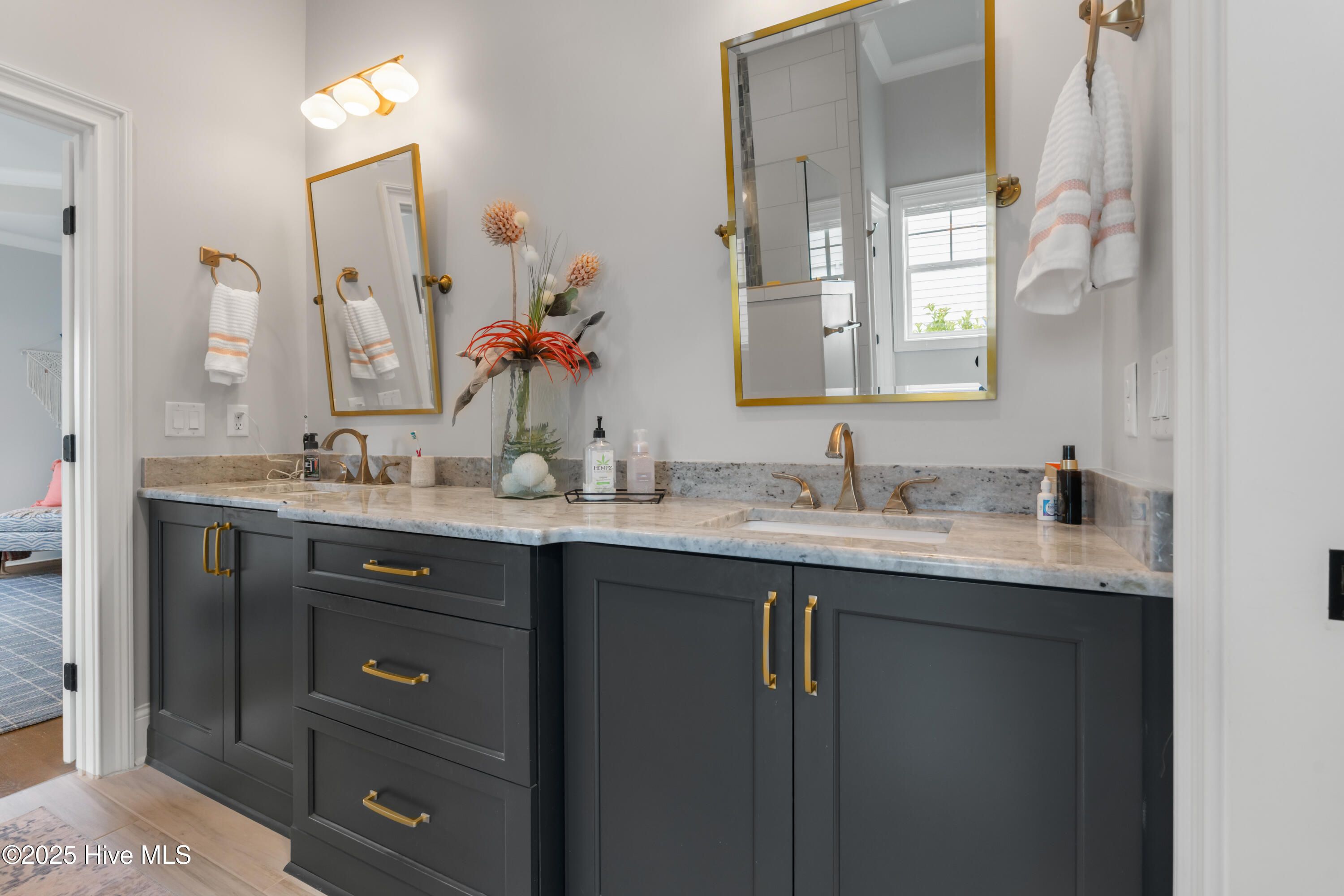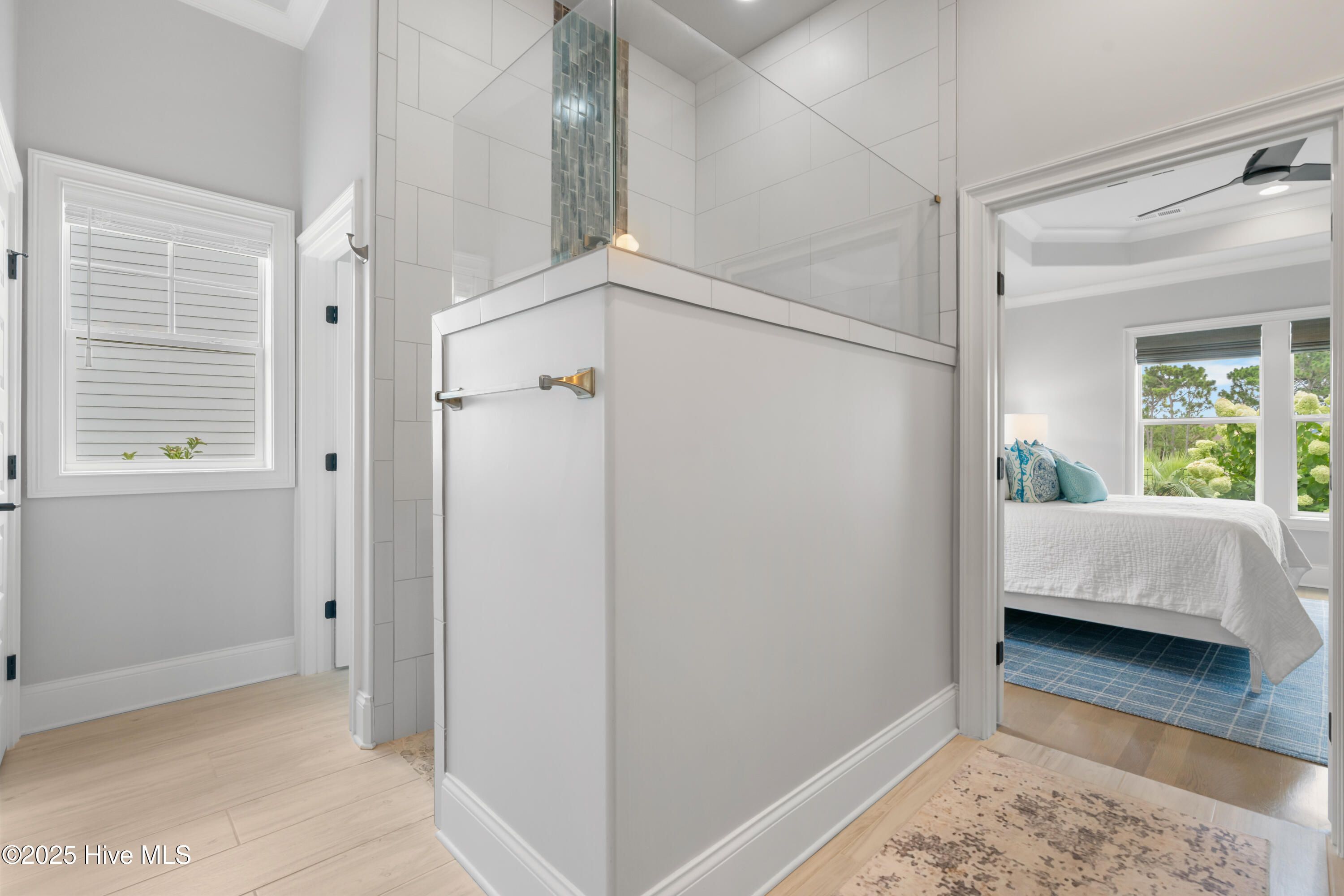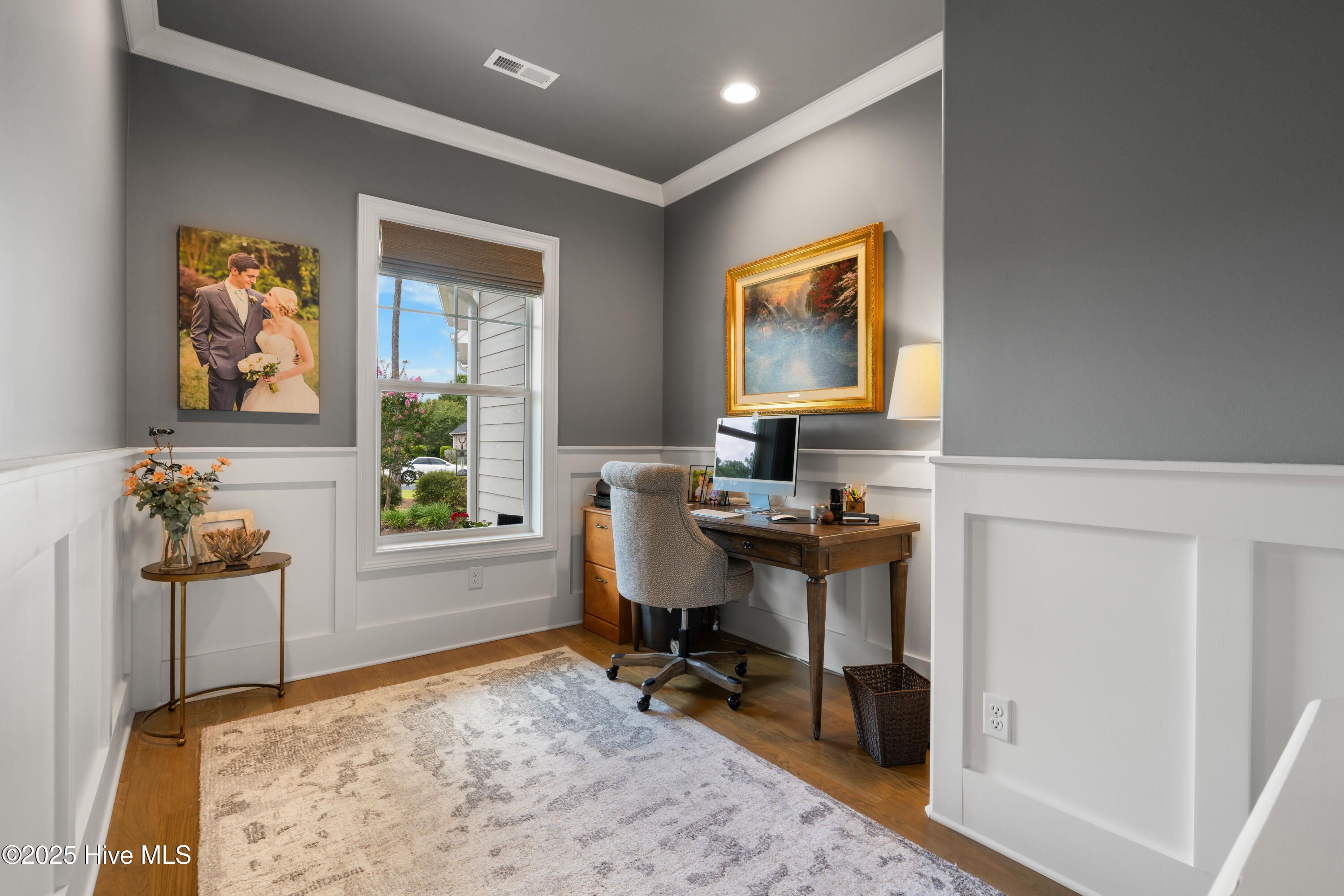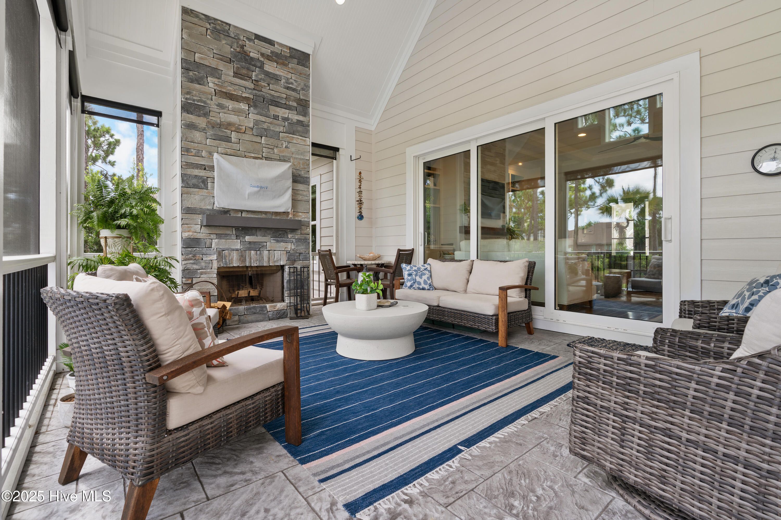 Custom George Crane with expansive golf views and pool. Welcome to 3660 Wingfoot Drive, a custom-built masterpiece by George Crane offering premier golf course frontage and a private pool. Overlooking the ninth tee box of the Cate 9 at the prestigious St. James Members Club, this nearly new home combines exceptional craftsmanship, thoughtful upgrades, and panoramic views, all just a short stroll to the Members Club's golf, tennis, fitness center, indoor pool, sauna, and dining. From the moment you arrive, the attention to detail is unmistakable. An aggregate driveway leads to a stamped concrete front porch framed by double hardwood doors. Inside, a bright open-concept design features coffered ceilings, upgraded lighting throughout, and rich hardwood floors across the main level. Wainscoting accents the entryway and office, where a barn door adds character and privacy. The gourmet kitchen is a showpiece with upgraded cabinetry and hardware, decorative tile backsplash, and high-end appliances. A walk-in butler's pantry offers custom shelving, a wine/drink cooler, and dedicated storage for small appliances. The adjoining great room showcases a gas linear fireplace with shiplap and stone accents, flanked by custom built-ins and a wall of windows framing views of the pool and golf course. The main-level primary suite is a serene retreat with a spa-inspired bath featuring a zero-entry glass and tile shower, built-in cabinetry, and a dressing-room-style custom closet. Two guest bedrooms share a Jack and Jill bath with a walk-in glass-and-tile shower and premium fixtures. A laundry room and drop zone complete the first floor. Upstairs, a fourth bedroom, full bath, and spacious game room provide flexible living space. The game room includes custom shelving, an upgraded granite-topped bar, and beverage cooler. Additional thoughtful upgrades include solid five-panel bedroom doors, custom blackout Roman shades in every bedroom, professionally designed closet systems, upgraded cabinetry and hardware throughout, custom tile in all bathrooms and the laundry room, and epoxy coating on the garage floor. The home is equipped with a whole-house reverse osmosis and water softener system, tankless water heater, and an encapsulated crawlspace with dehumidifier. A Sonos sound system serves the family room, kitchen, and screened porch, with wiring extending to the primary suite and game room. Step outside to a private backyard oasis designed for both relaxation and entertaining. The saltwater pool features a splash deck, built-in seating along one side, water jets, and underwater lighting. Adjacent to the pool, a fully outfitted outdoor full bath offers a shower, toilet, sink, and sun shade. The screened-in porch provides seamless indoor-outdoor living with stamped concrete flooring, a floor-to-ceiling stone wood-burning fireplace, and custom sun and wind shades. Professionally designed landscaping includes irrigation and lighting in both the front and back, plus a separate attached tool shed for convenience. This home represents more than luxury; it's a lifestyle. Experience the unparalleled quality, design, and comfort of this George Crane custom home in the heart of St. James Plantation.