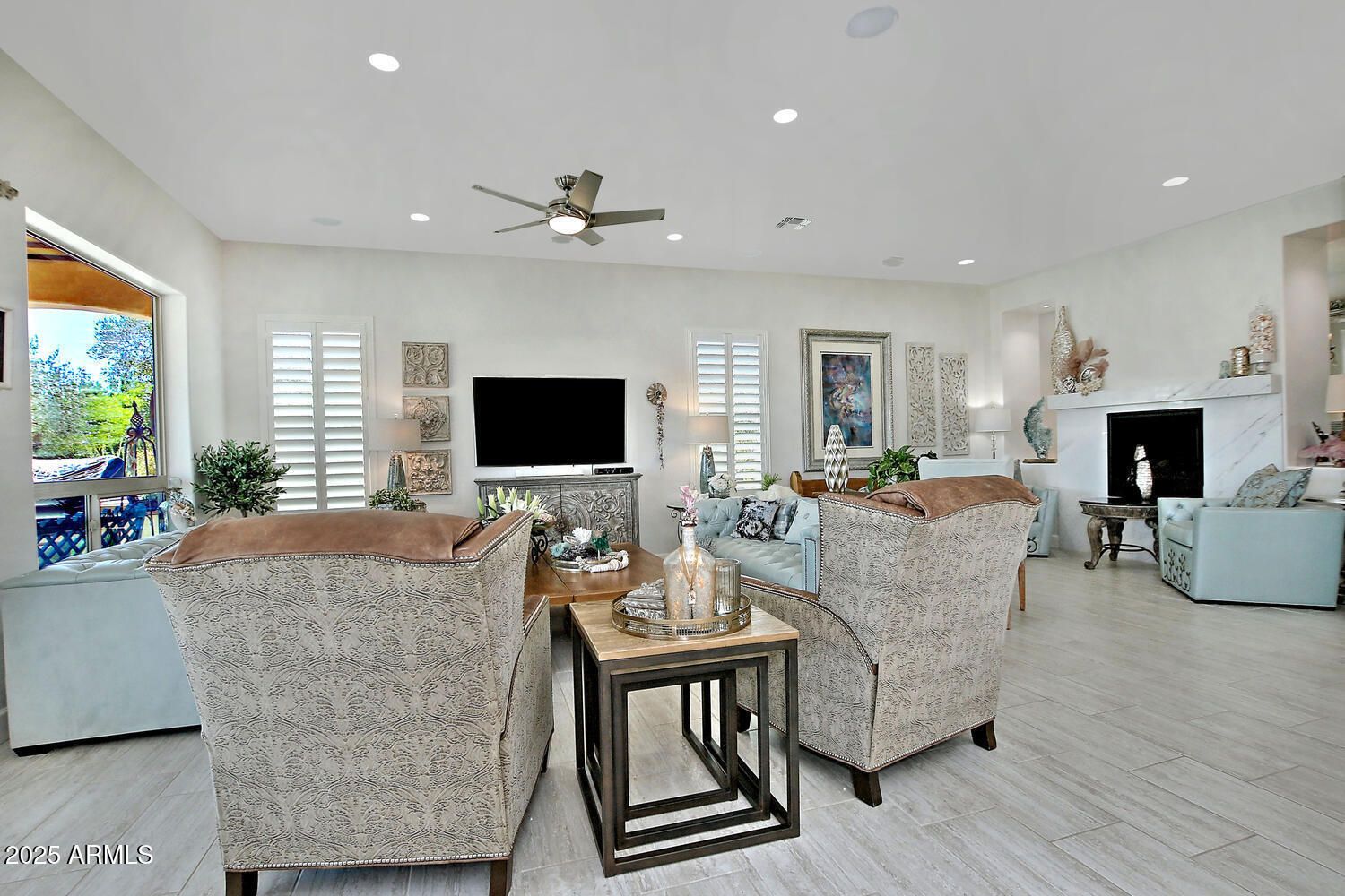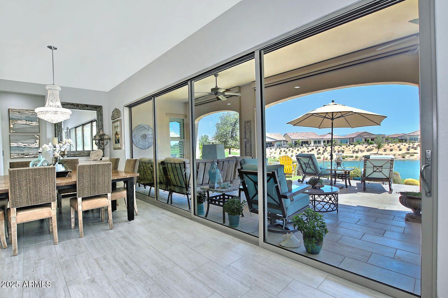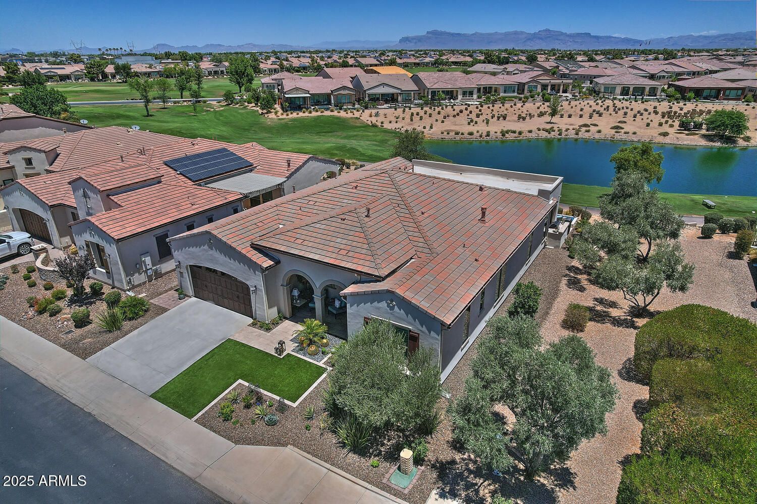 LIVING YOUR DREAM. Stunning Mountain & Water Views on the golf course. Perched on the coveted signature 16th hole green, this spectacular home offers breathtaking views of the Superstition Mountains, lush fairways, and tranquil water features — all from your own backyard oasis. Enjoy the ideal north-facing exposure for year-round comfort, along with a spacious covered patio featuring a built-in BBQ, granite pavers, and plenty of room for entertaining. Inside, the luxury chef's kitchen shines with a granite waterfall island, matching granite backsplash. The three-car extended garage boasts a textured floor, while the two-sided fireplace creates a warm and inviting connection between the dining and family rooms. This rare golf course lot combines exceptional views, elegant upgrades.