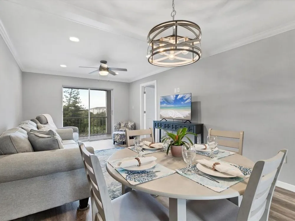 - Ceiling Fan(s), Crown Molding, Eat-in Kitchen, High Ceilings, Living/Dining Room, Open Floorplan, Solid Surface Counters, Thermostat, Tray Ceiling(s), Walk-In Closet(s), Window Treatments