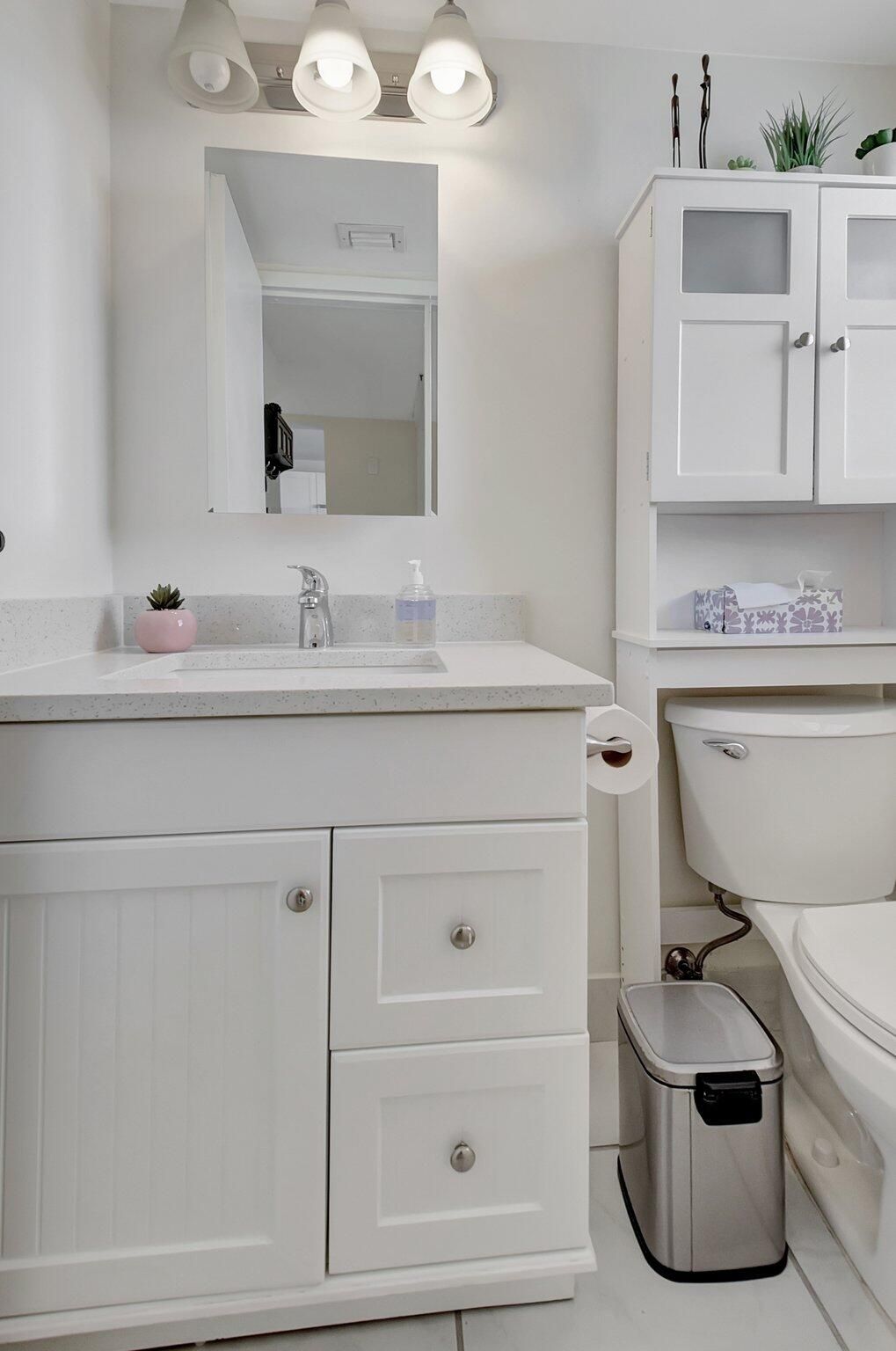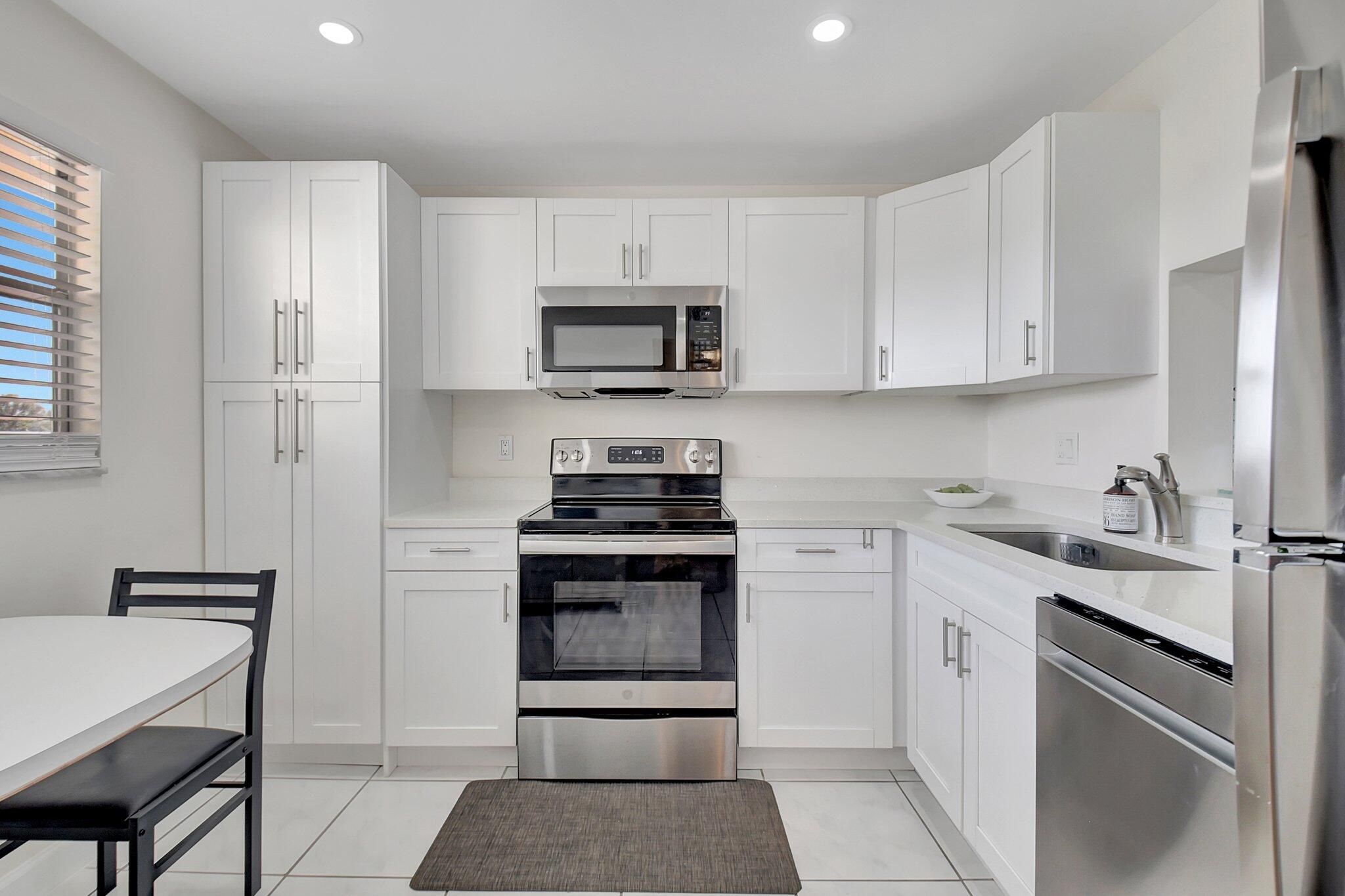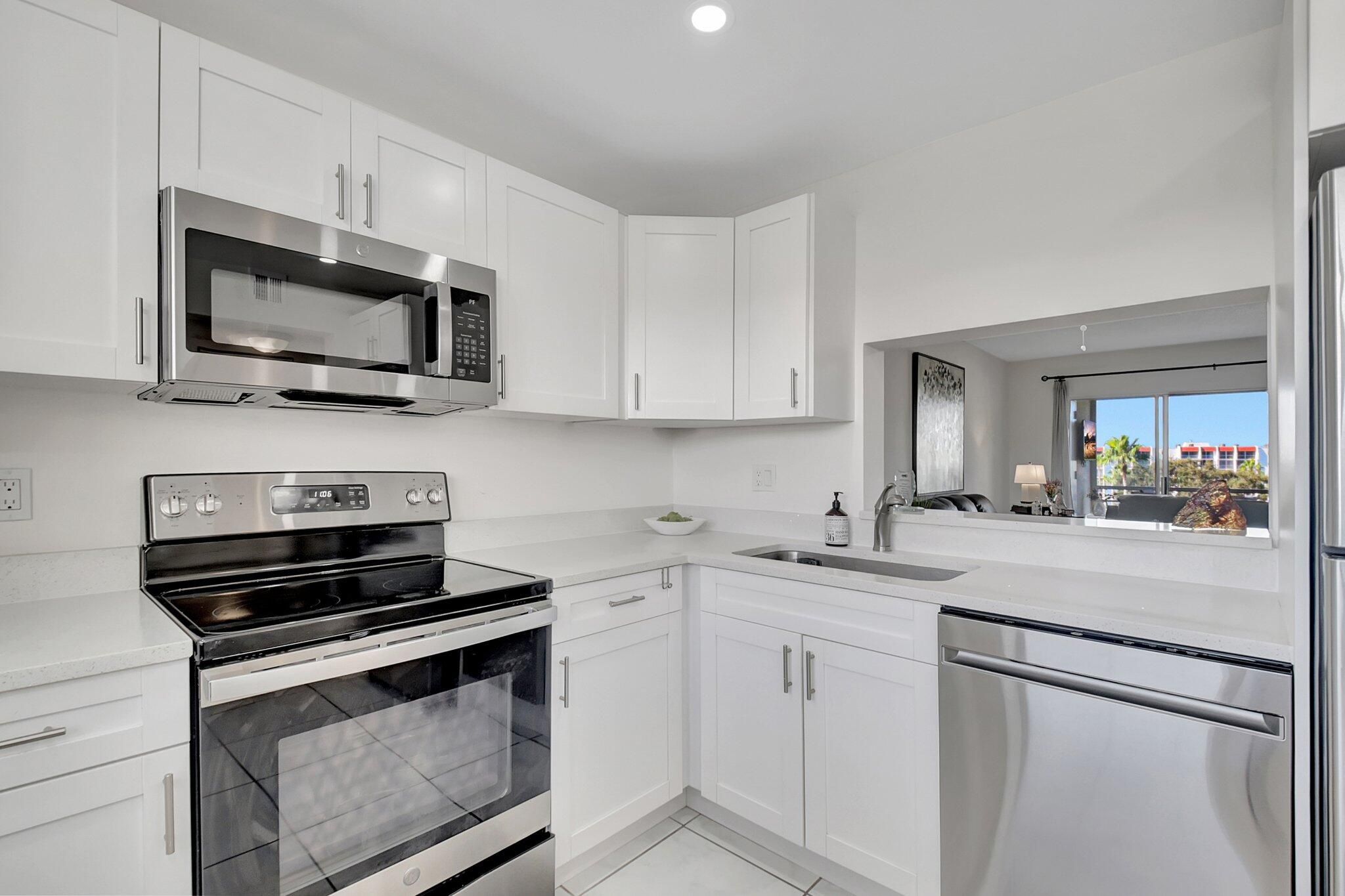 Enjoy the elegance of this fully renovated, spacious 1-bedroom, 1.5-bath condo nestled in the prestigious Poinciana Country Club. The kitchen boasts white shaker cabinets, quartz countertops, stainless steel appliances, and LED recessed lighting, creating a modern and sleek environment. The bathroom is beautifully updated with a tiled walk-in shower and an oversized vanity. The generously sized bedroom offers his and hers walk-in closets with organizers. Convenience is at your fingertips with a front-load washer and dryer in the utility closet, plus a storage closet on the balcony. Step out onto the balcony and relish views of the golf course and lagoon. You're just steps away from the clubhouse which features: A bar/restaurant offering lunch, dinner, and entertainment, A fitness center,