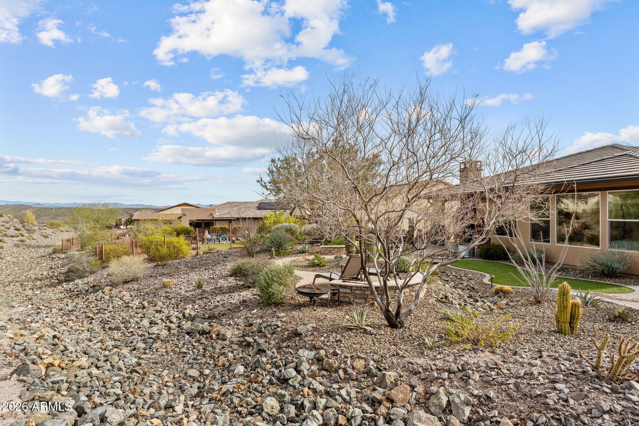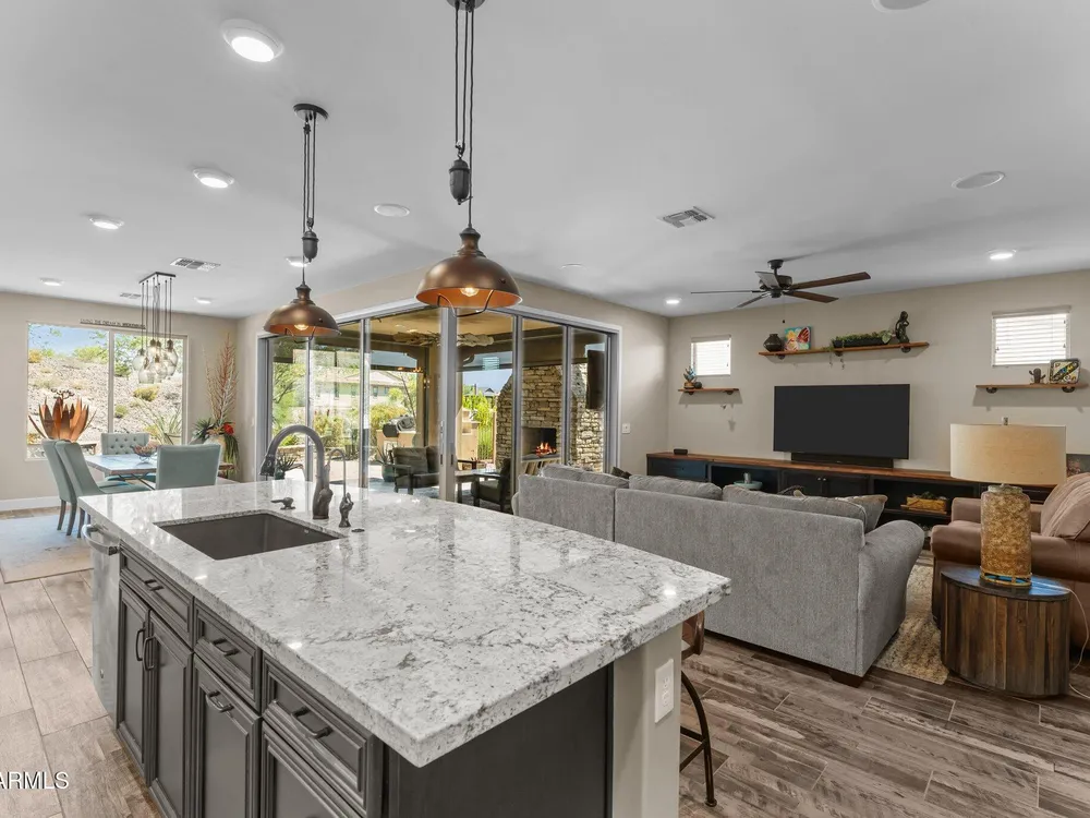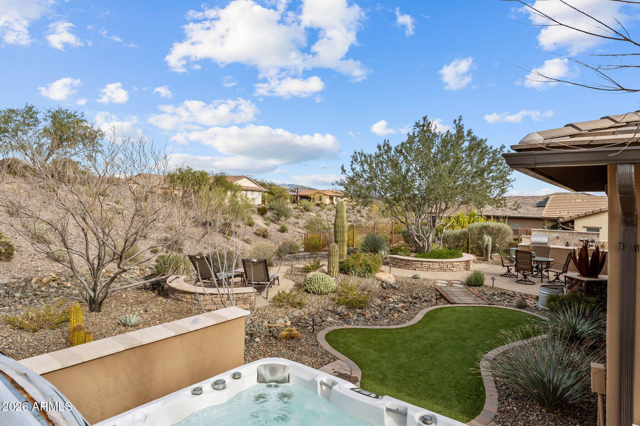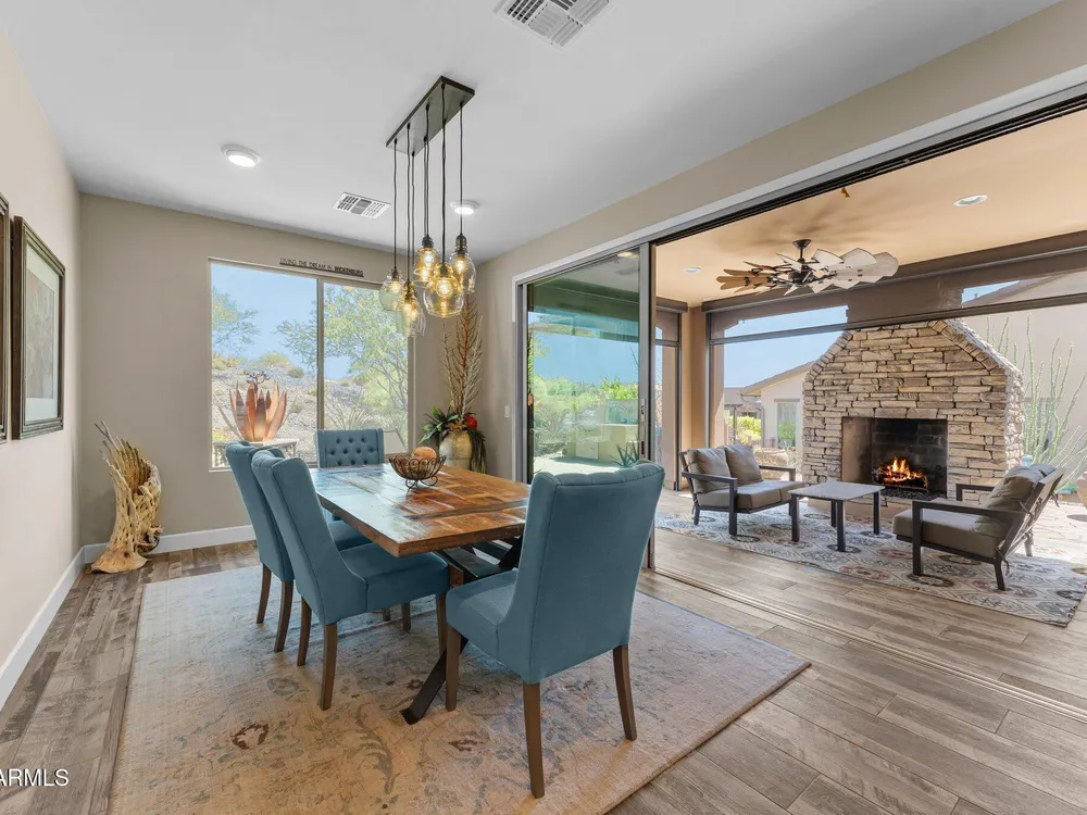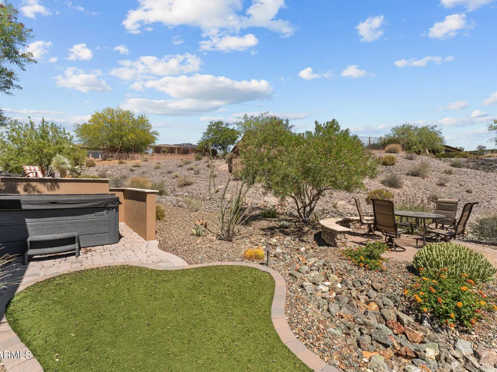 This exceptional Wickenburg Ranch home offers the perfect balance of luxury, functionality, and breathtaking outdoor living.With just under 2,000 sq feet, this 2-bedroom, 2-bathroom residence also features a versatile den or office with elegant French doors—ideal for remote work, a reading room, or additional guest space. Thoughtfully designed with an open-concept layout, the home showcases a spacious, light-filled living area and a beautifully appointed kitchen with generous counter space and storage—perfect for entertaining or quiet evenings at home. Expansive corner sliding glass doors span two walls, seamlessly connecting indoor living to an incredible outdoor oasis. Step outside to a covered patio where you'll find a striking stone fireplace, built-in barbecue, relaxing Sundance high-end hot tub, and custom down shades for year-round comfort. The professionally designed backyard features lush desert landscaping, a tranquil water feature, and a cozy fire pitcreating a peaceful yet impressive space for entertaining or unwinding under the stars. The entire irrigation system has been replaced with high quality PVC! With over $300,000 in upgrades and owned solar panels, this home is both refined and efficient. Every detailfrom the finishes to the layouthas been carefully curated for comfort, elegance, and modern desert living. Don't miss the opportunity to own one of the most beautifully upgraded homes in the Ranch.