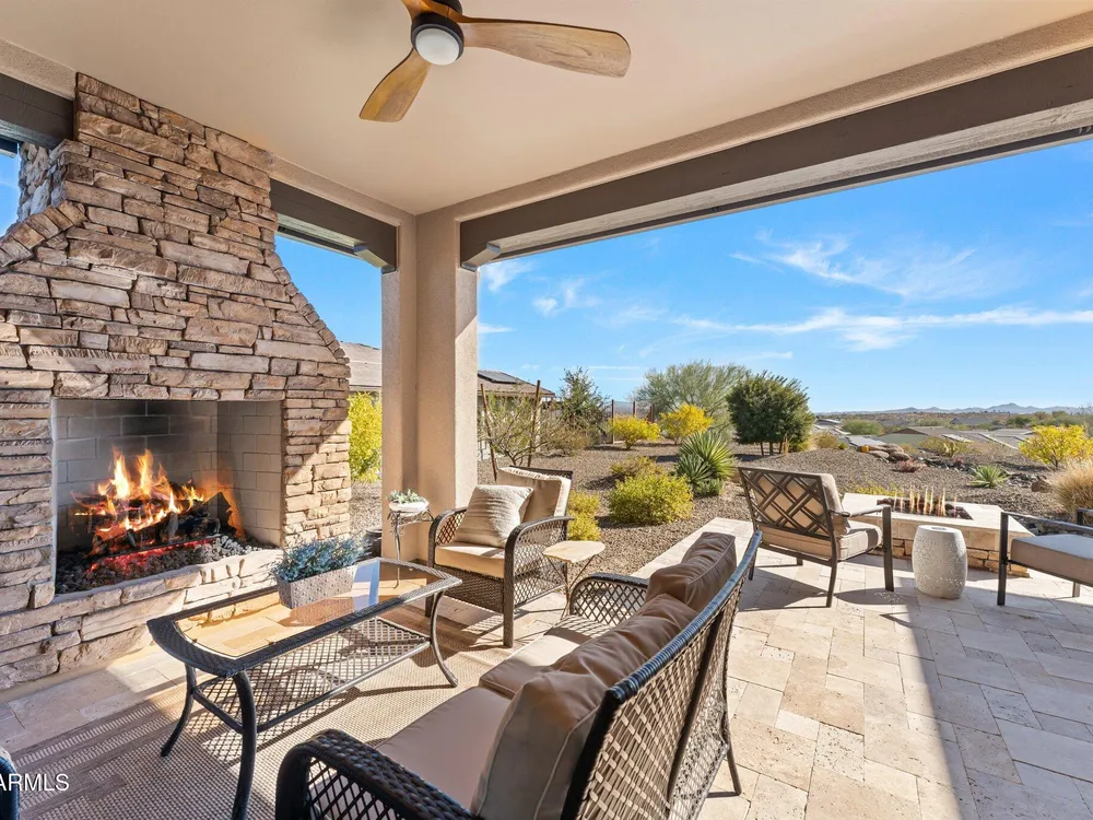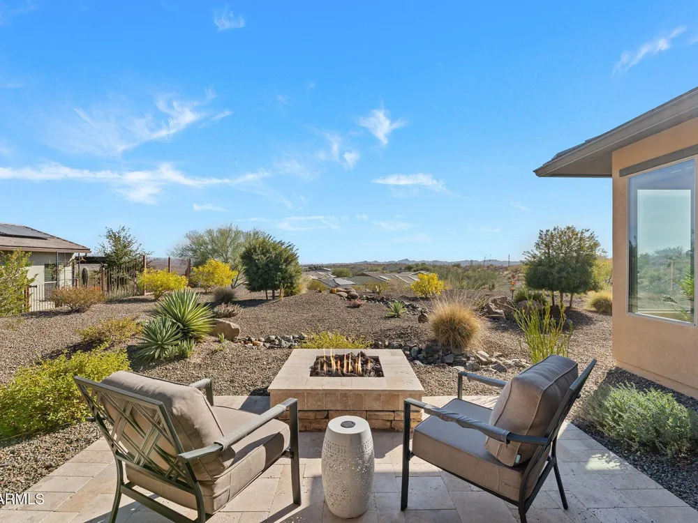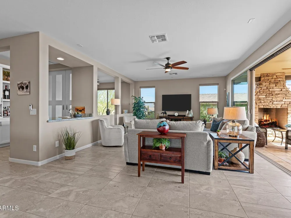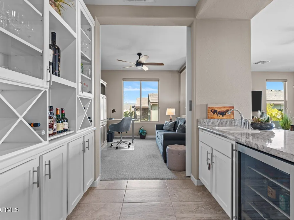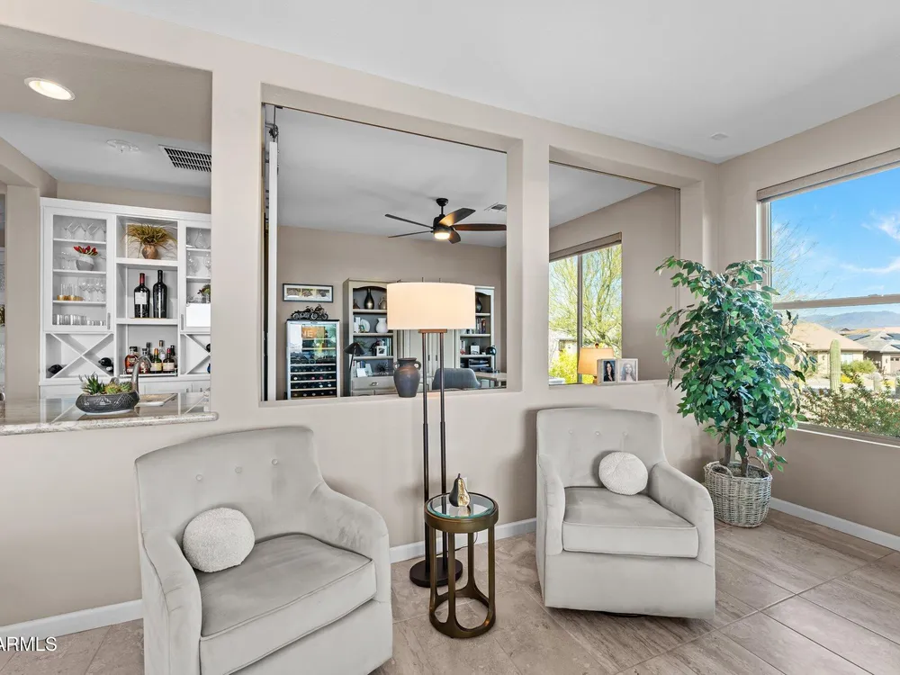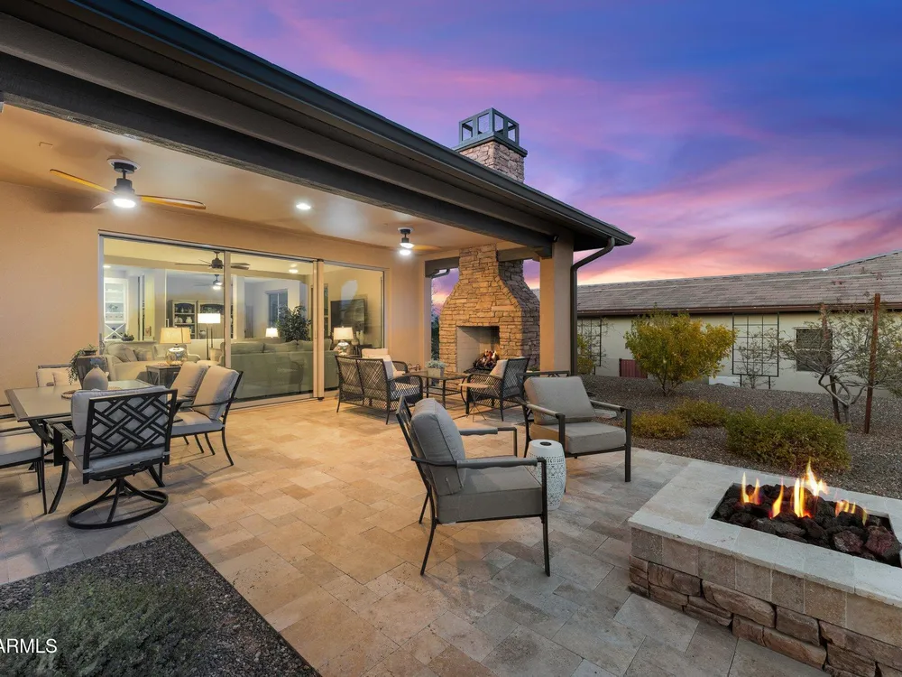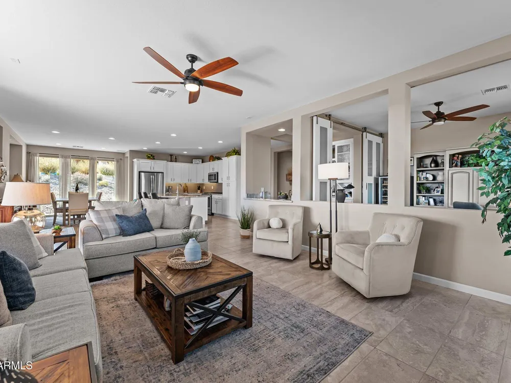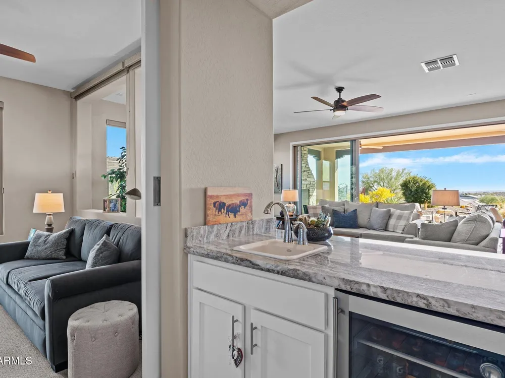 Welcome to 3670 Stampede Dr! Experience the ultimate blend of luxury and efficiency in this beautifully designed 2-bedroom, 2-bathroom home, set in the heart of Wickenburg Ranch. The open-concept floor plan flows effortlessly, anchored by a show-stopping 15-foot rolling wall of glass that blurs the line between indoor and outdoor living. A 115'' Vanishing Screen system further extends the utility and enjoyment of this glass wall feature. Whether you're entertaining or enjoying a quiet evening, this unique feature allows you to fully embrace the beauty of the surrounding desert and gorgeous mountain views from your great room. The kitchen is a culinary masterpiece, complete with high-end stainless steel appliances, a large island with seating, and sleek countertops. Adjacent to the kitchen, a dedicated wet bar area creates the perfect space for hosting gatherings with friends and family. In addition, the den provides flexible space that can be customized to suit your needs, whether as a library, home office, or hobby room. The custom wood & frosted glass barn door and retractable privacy screens extend your guest sleeping space options. Step outside to the expansive covered patio, where you'll find stunning desert and mountain views that create a peaceful backdrop for outdoor dining or relaxation. The 2-car insulated garage offers ample space for vehicles, storage, and has its own mini split AC system. With thoughtful upgrades throughout and a focus on indoor-outdoor living, this home is a perfect blend of comfort and sophistication.