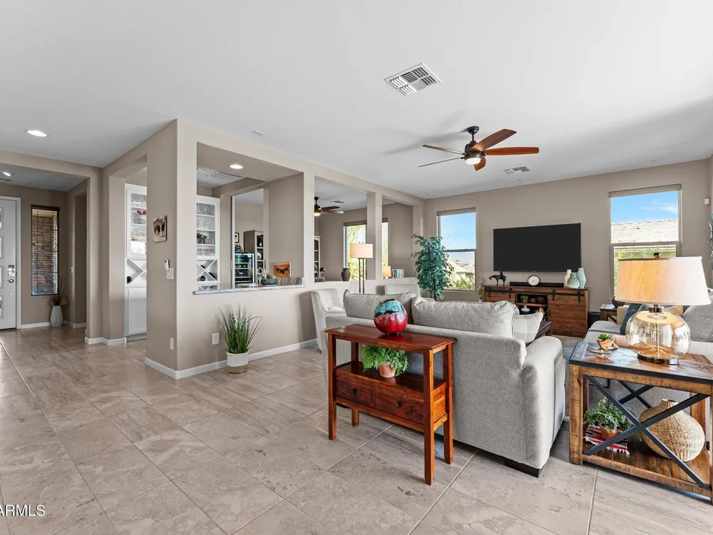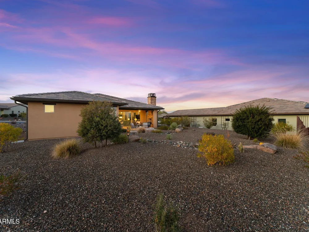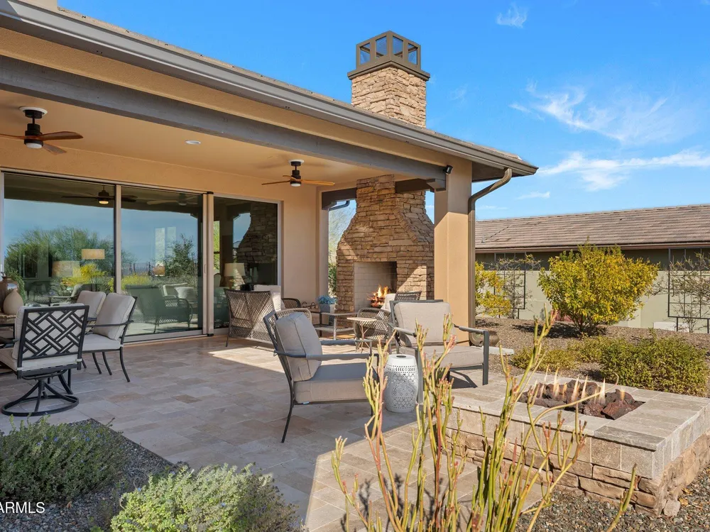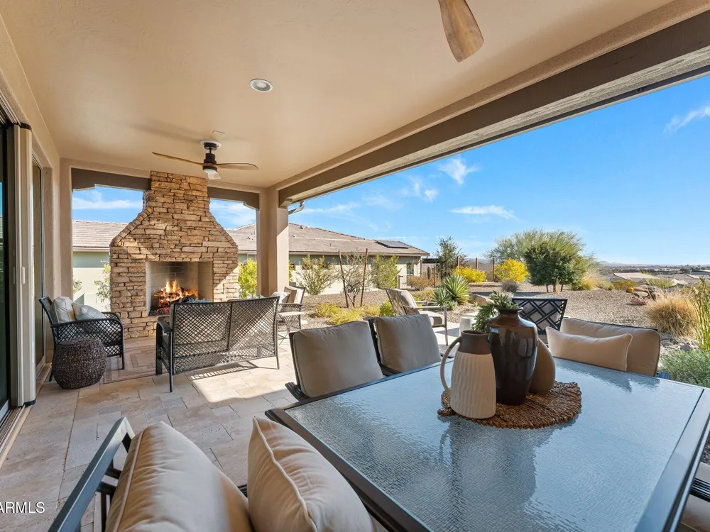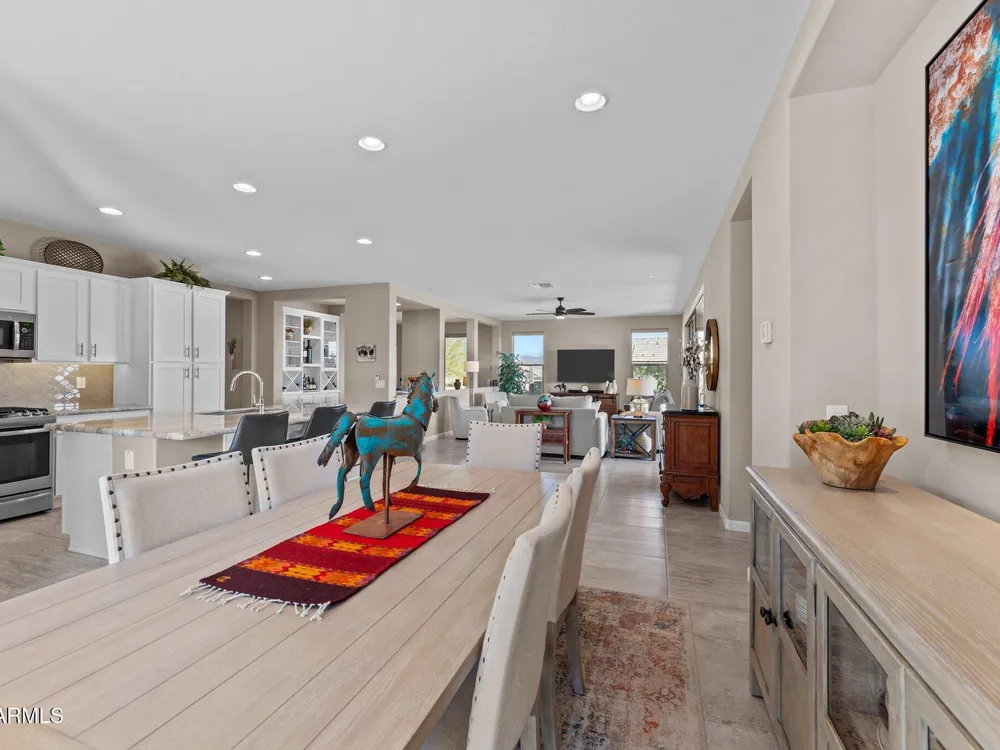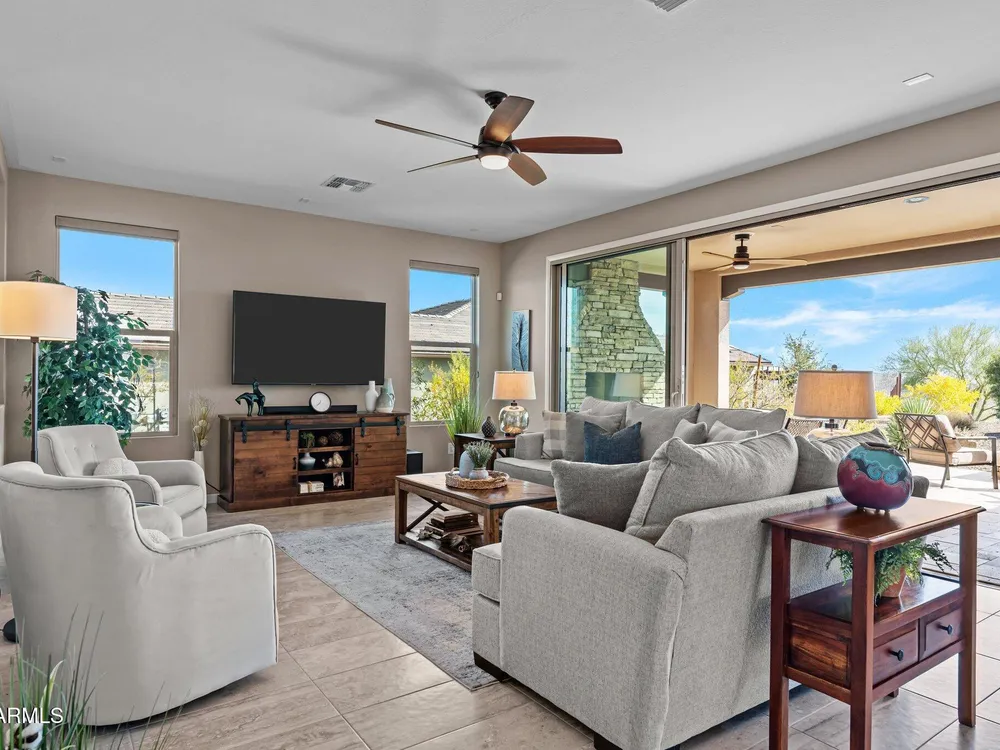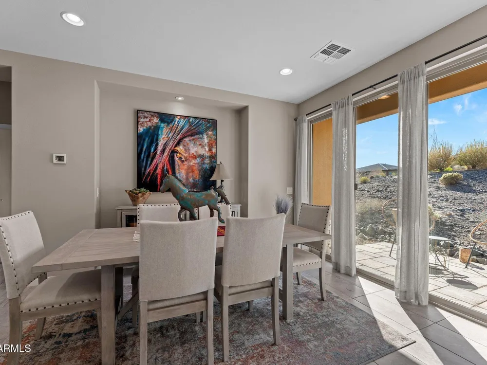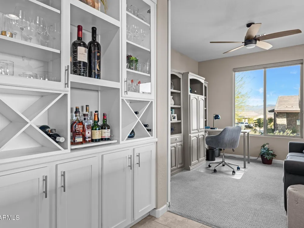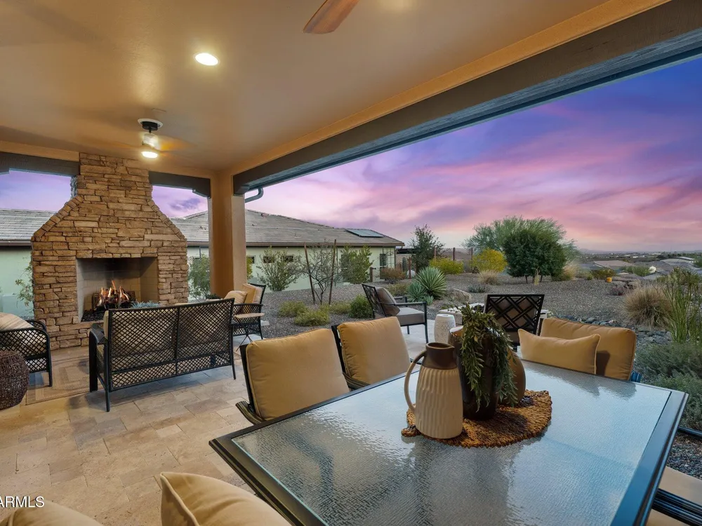 Welcome to 3670 Stampede Dr! Experience the ultimate blend of luxury and efficiency in this beautifully designed 2-bedroom, 2-bathroom home, set in the heart of Wickenburg Ranch. The open-concept floor plan flows effortlessly, anchored by a show-stopping 15-foot rolling wall of glass that blurs the line between indoor and outdoor living. A 115'' Vanishing Screen system further extends the utility and enjoyment of this glass wall feature. Whether you're entertaining or enjoying a quiet evening, this unique feature allows you to fully embrace the beauty of the surrounding desert and gorgeous mountain views from your great room. The kitchen is a culinary masterpiece, complete with high-end stainless steel appliances, a large island with seating, and sleek countertops. Adjacent to the kitchen, a dedicated wet bar area creates the perfect space for hosting gatherings with friends and family. In addition, the den provides flexible space that can be customized to suit your needs, whether as a library, home office, or hobby room. The custom wood & frosted glass barn door and retractable privacy screens extend your guest sleeping space options. Step outside to the expansive covered patio, where you'll find stunning desert and mountain views that create a peaceful backdrop for outdoor dining or relaxation. The 2-car insulated garage offers ample space for vehicles, storage, and has its own mini split AC system. With thoughtful upgrades throughout and a focus on indoor-outdoor living, this home is a perfect blend of comfort and sophistication.